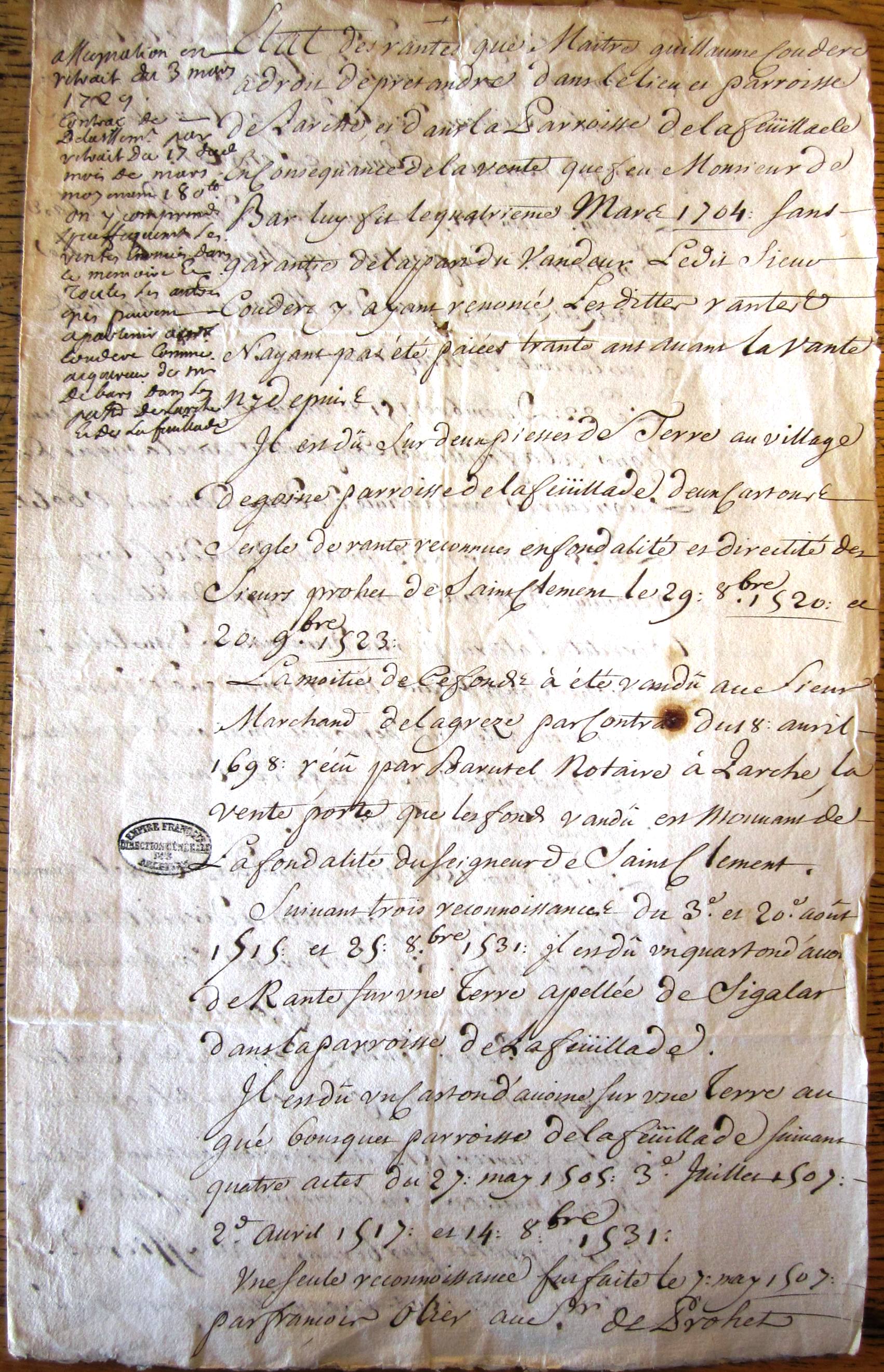 Mémoire sur des rentes dues au début du XVIème siècle sur certaines terres de Larche et la Feuillade.