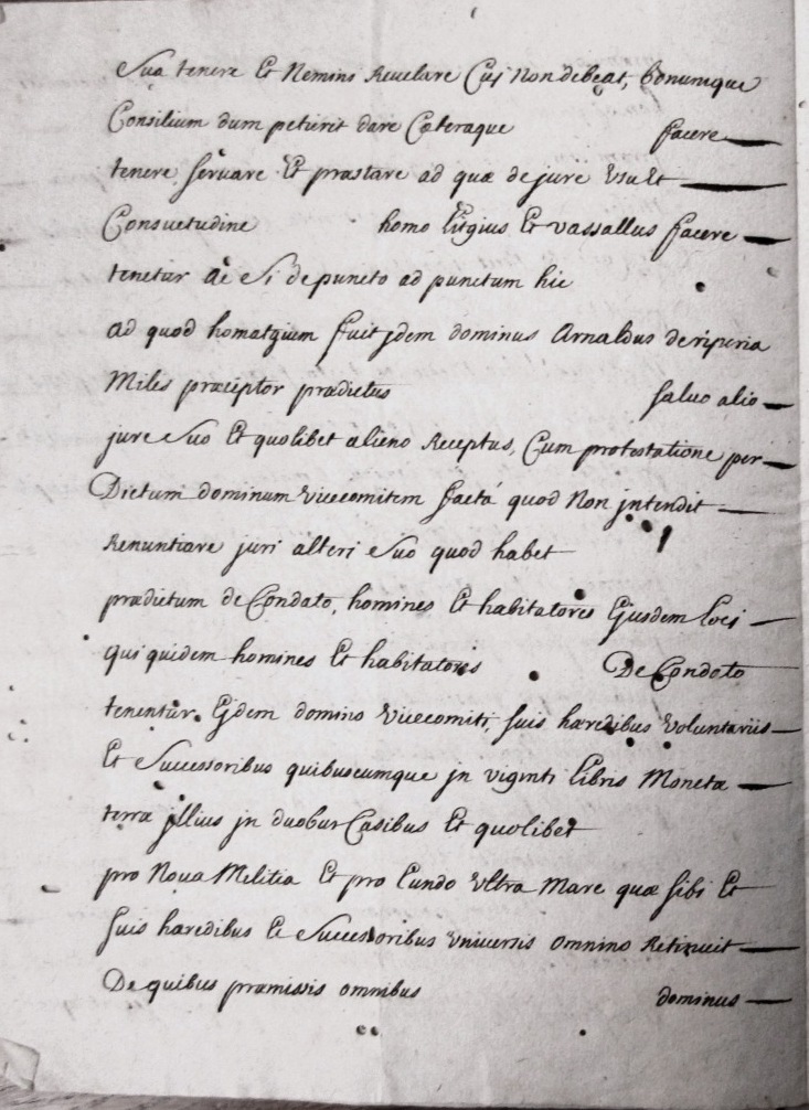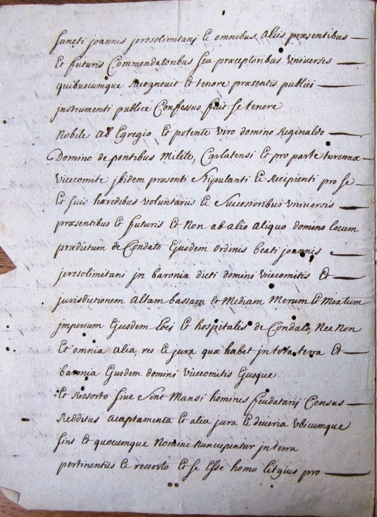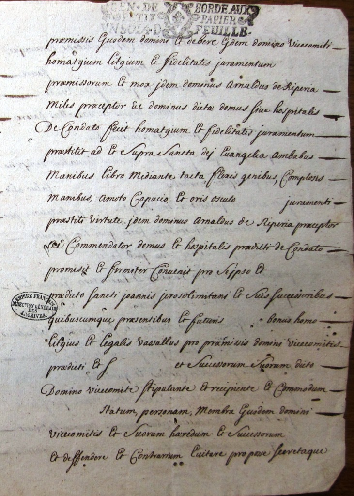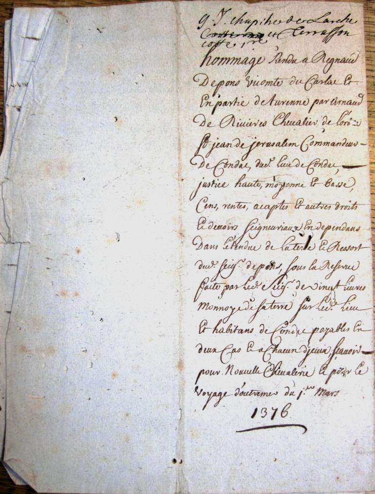 Hommage de Arnaud de Riperia, de l'ordre de St Jean de Jerusalem, commandeur de l'Hopital de Condat, à Renaud de Pons (1376)