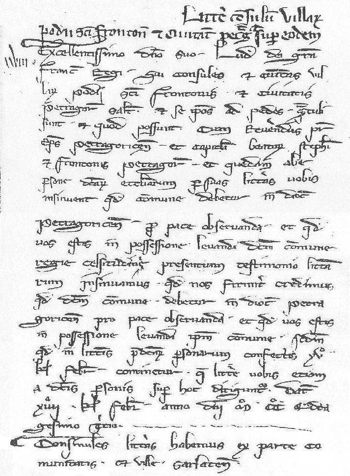 insinuent quod commune debetur in diocese / Petragoricense pro pace observanda et quod / Vos estis in possessione levandi dictum commune / regie celsitudine presentium testimonio littera- /