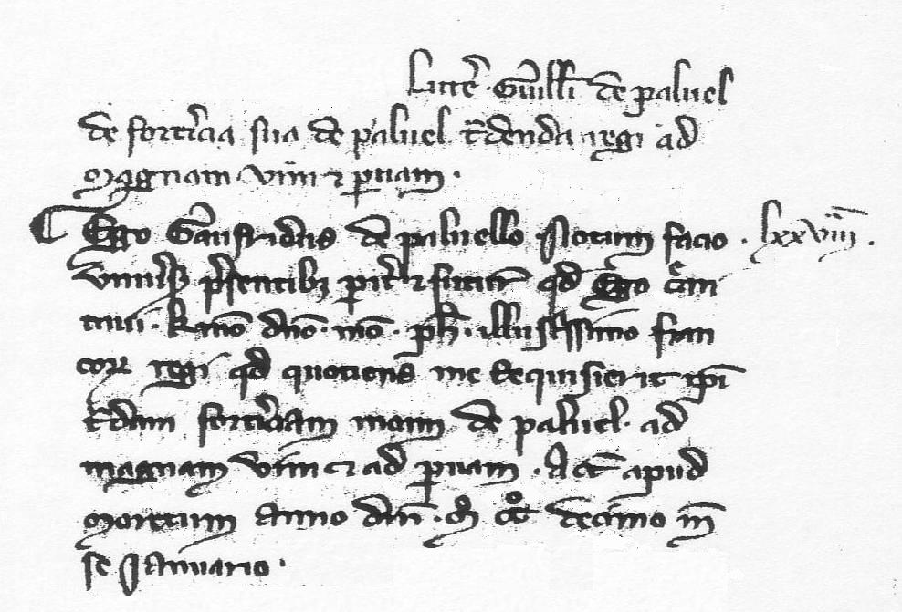 Ego, Gaufridus de Paluello, notum facio universis presentibus pariter et futuris quod ego, [----] karissimo domino nostro Philippo illustrissimo Francorum Regi quod quotiens me requisierit ipsi tradam fortalitiam suam de Paluel ad magnam vim et ad parvam. Actum apud Moretum, anno Domini M° CC° decimo, mense januario.
