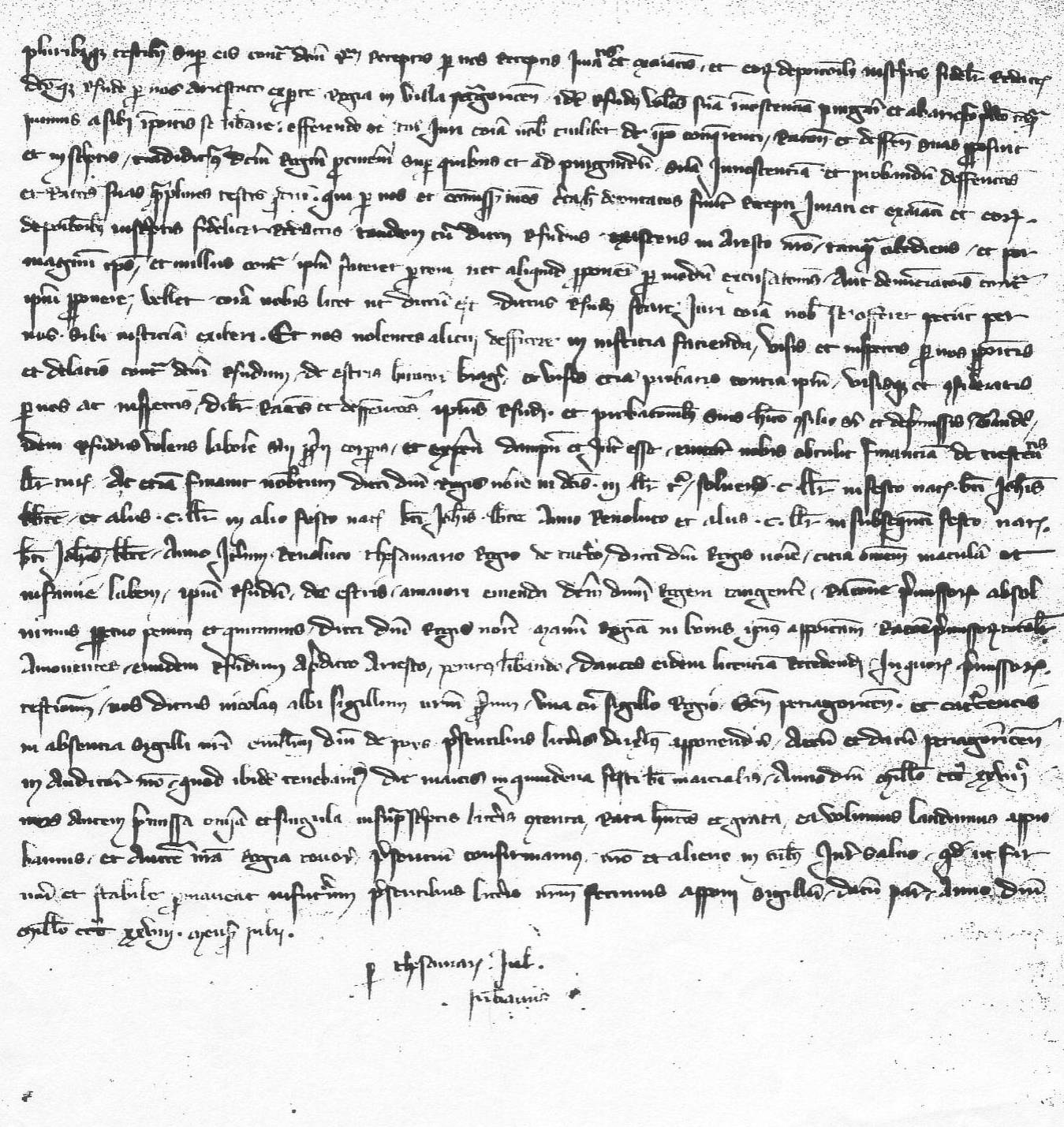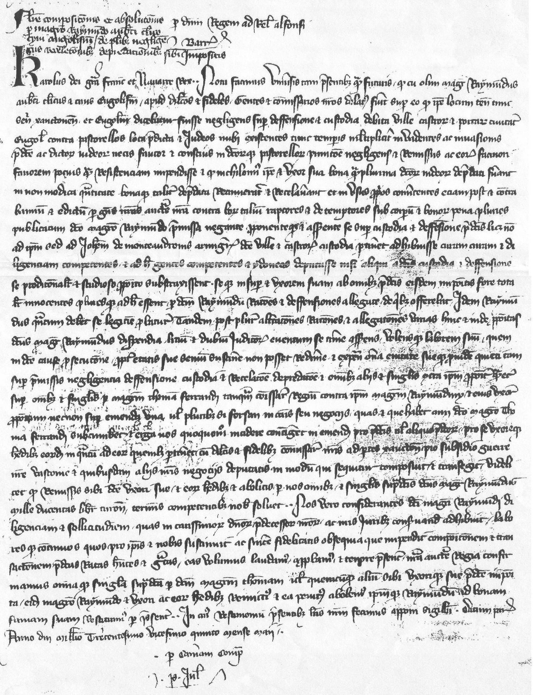 Sous la simple apparence d’une absolution royale, le texte qui suit se révèle être un document d’une importance historique majeure. Le massacre des Juifs de Bergerac par les Pastoureaux (ces derniers sans nul doute sur la route d’Agen) nous est donné à lire, avec la terrible concision de la langue latine. Le passage suivant : « Item, quod olim, tempore quo judei fuerunt per pastorellos capti et subsequenter interfecti …»[1], évoque clairement un massacre organisé et collectif. Ce document est fort justement mentionné par Gérard Fayolle dans son Histoire du Périgord (éd. Pierre Fanlac, Périgueux, 1983, p.197).
