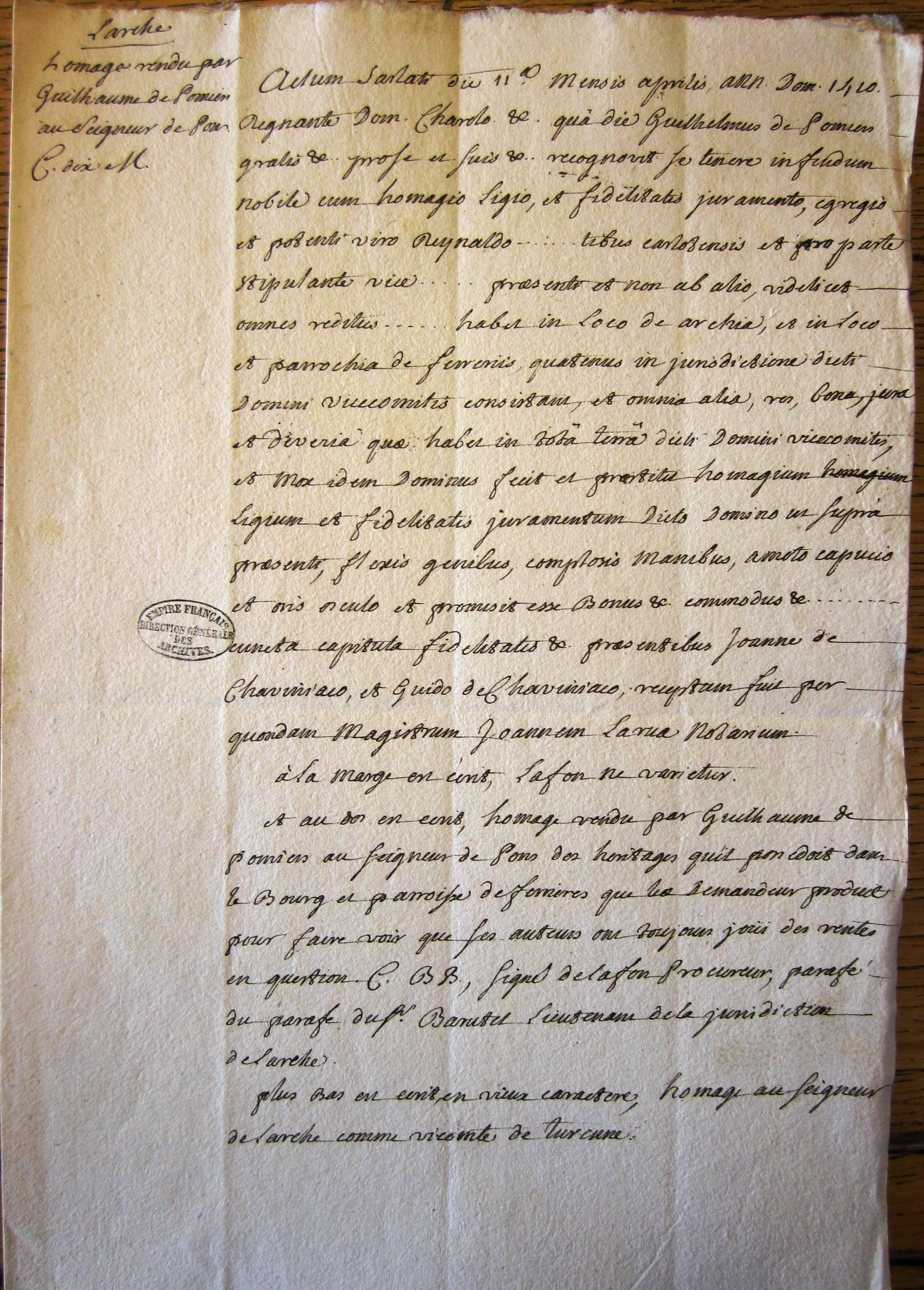 Copie 18ème de l'hommage de Guillaume de Pomiers à Renaud de Pons (1420)
