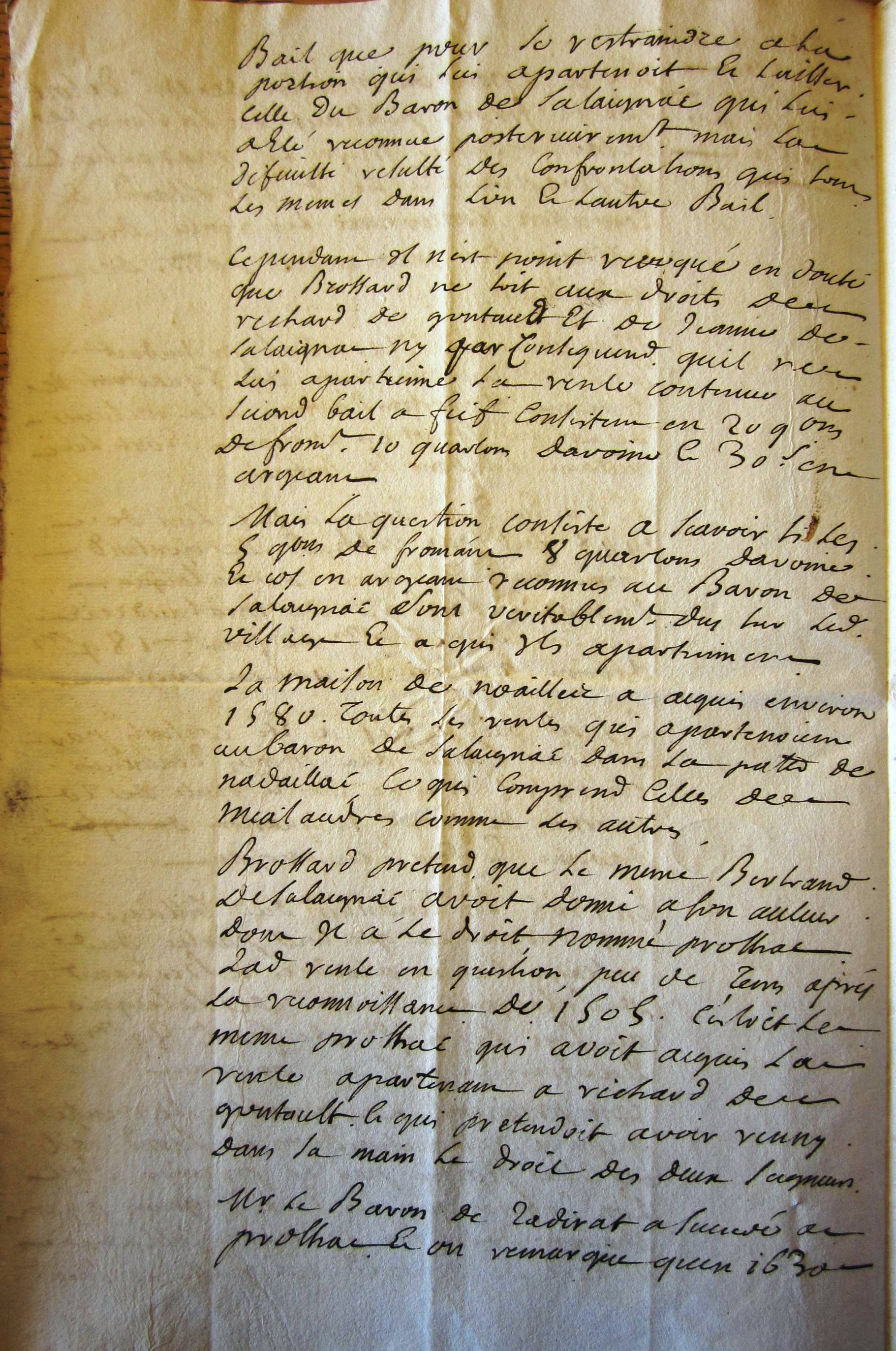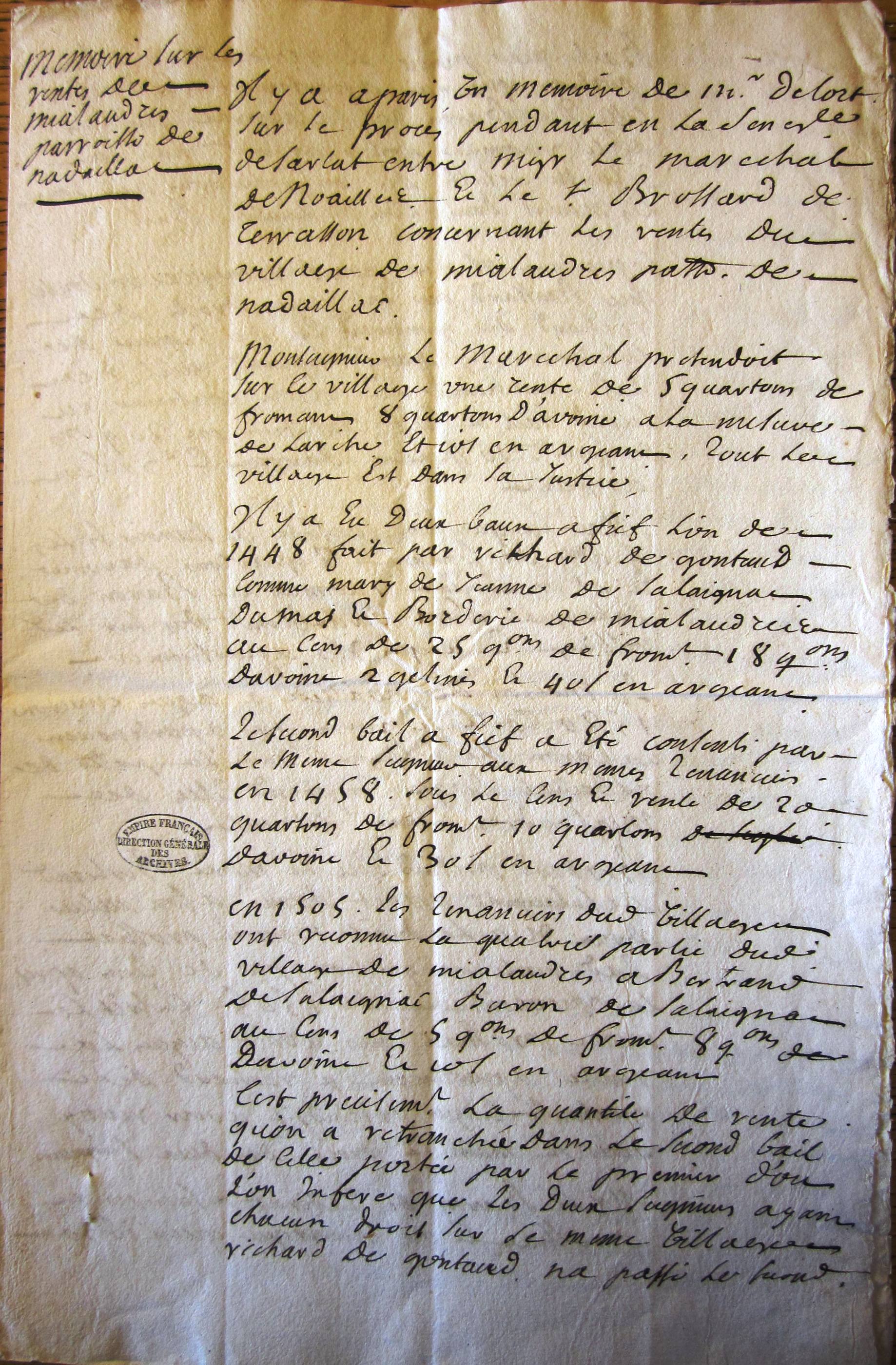 Mémoire (18ème) sur les rentes (depuis 1448) du village de Mialaudres, parroisse de Nadaillac
