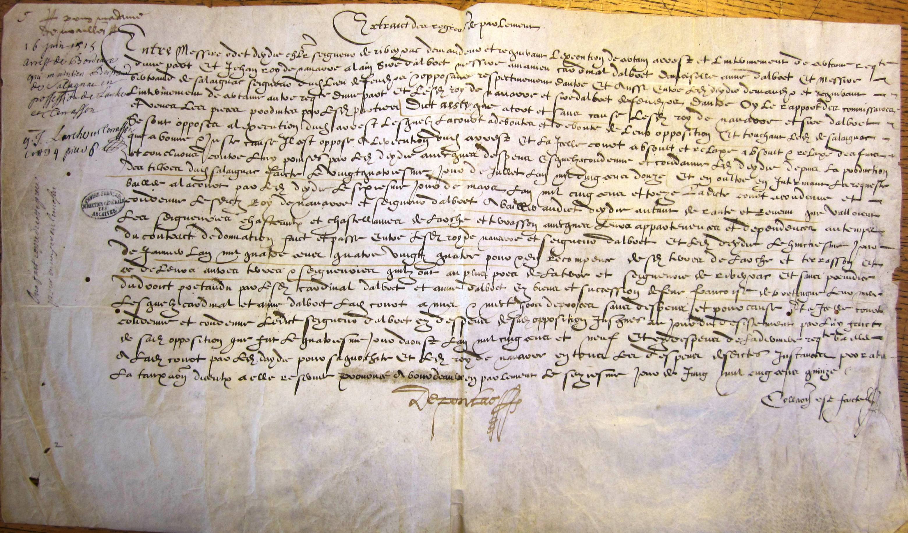 Arrêt du Parlement de Bordeaux maintenant Bertrand de Salaignac en possession de Larche et Terrasson (16 juin 1515).
