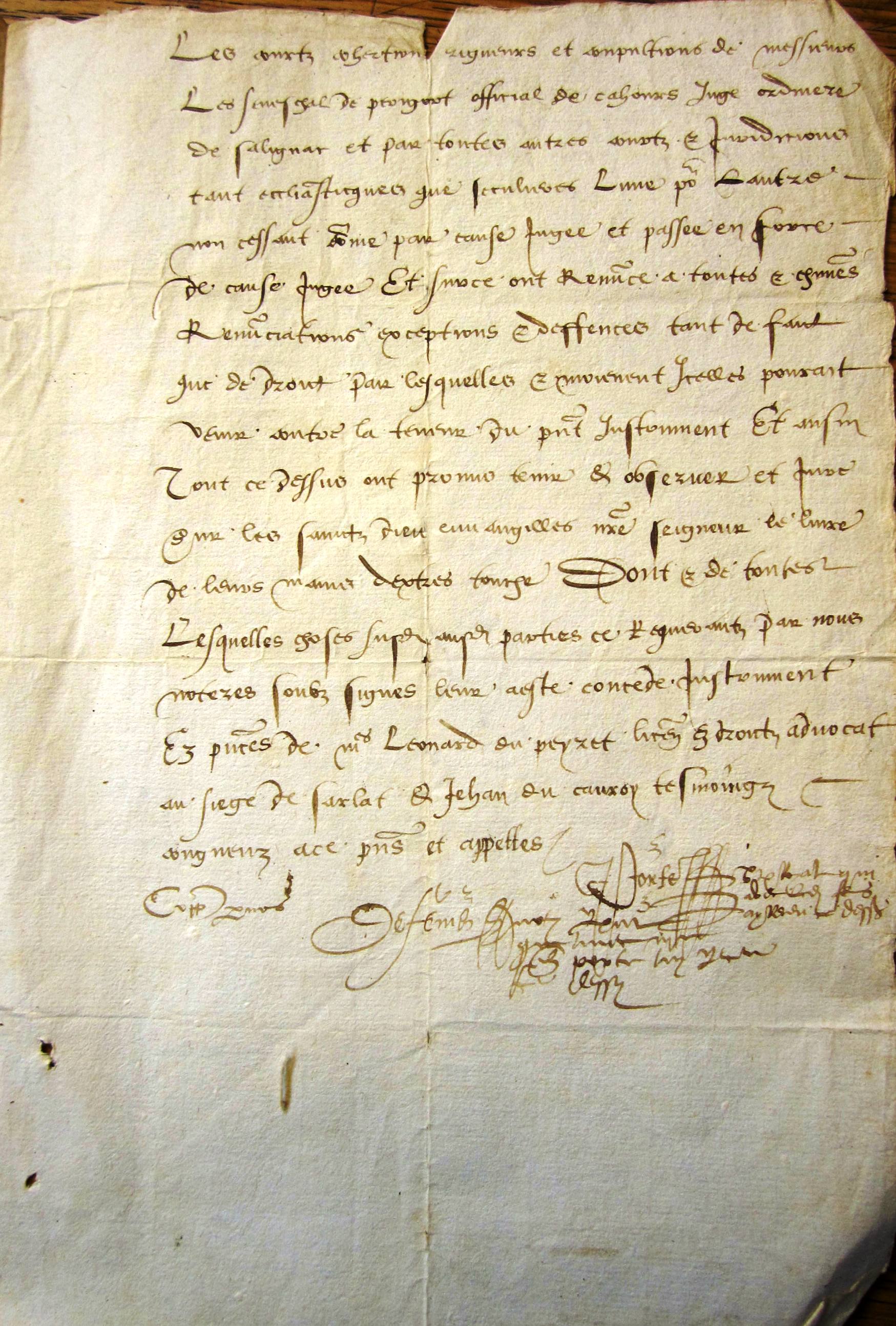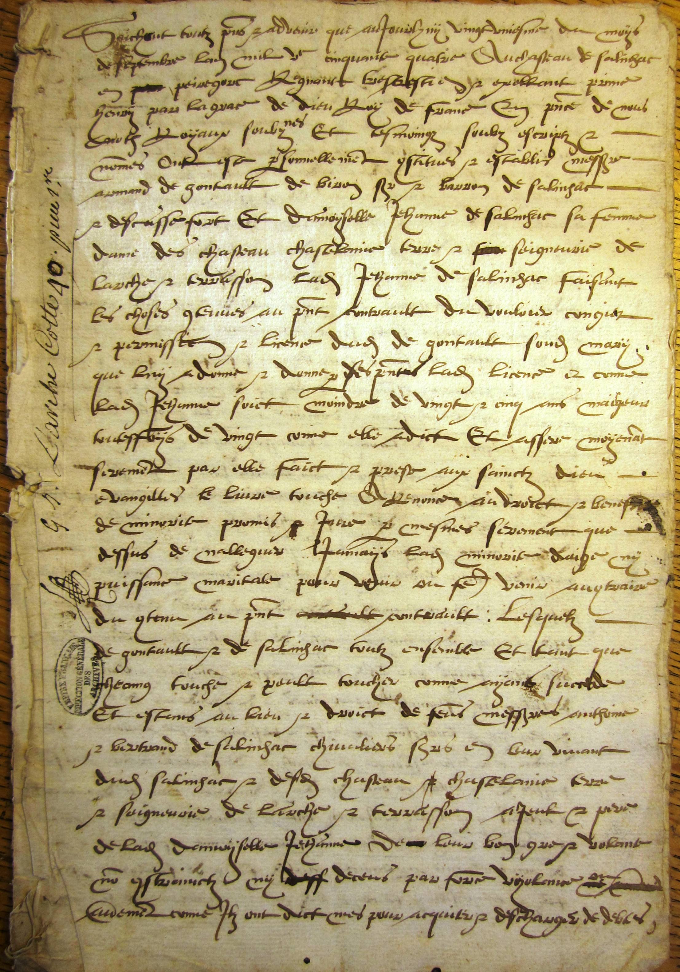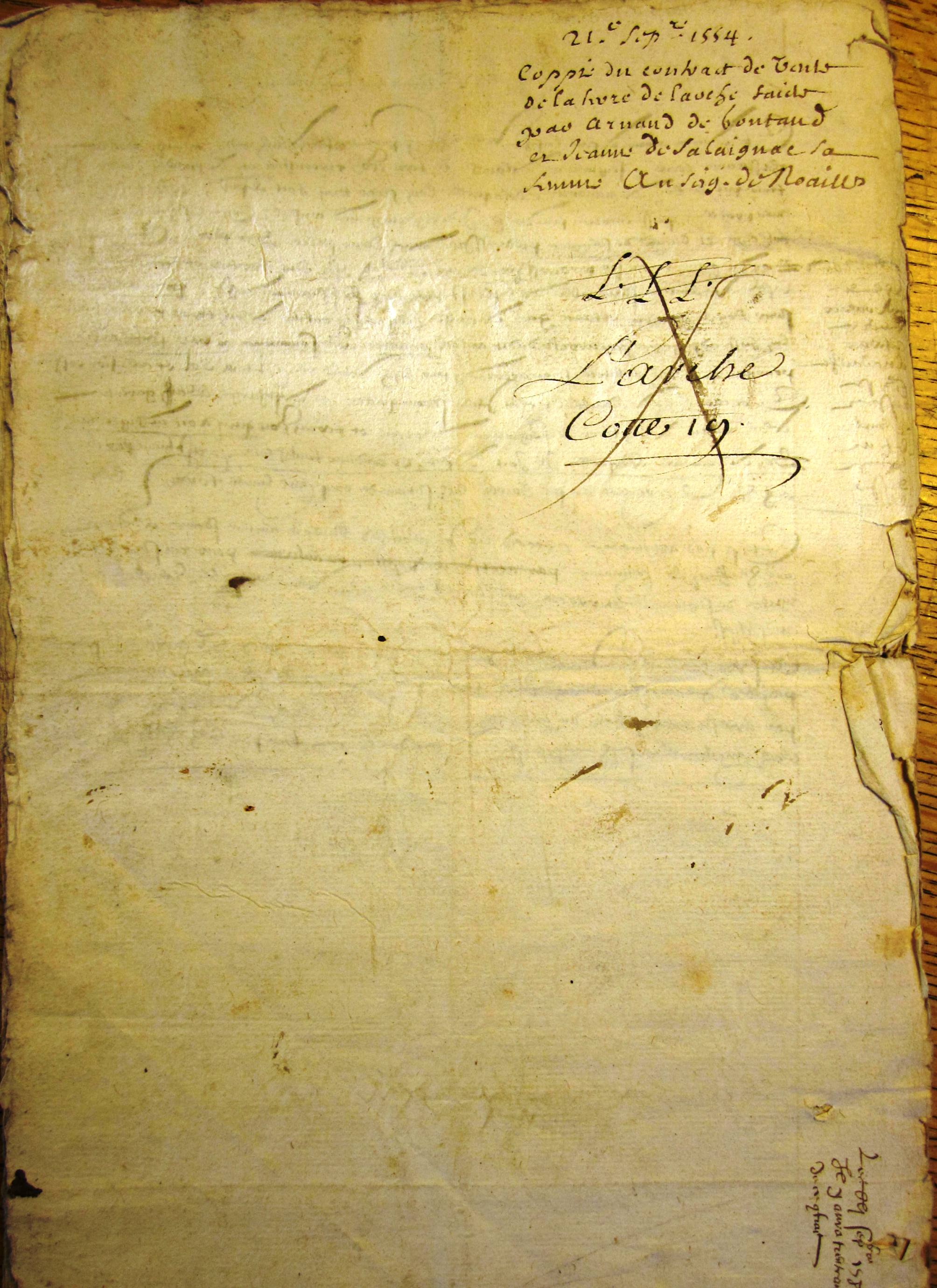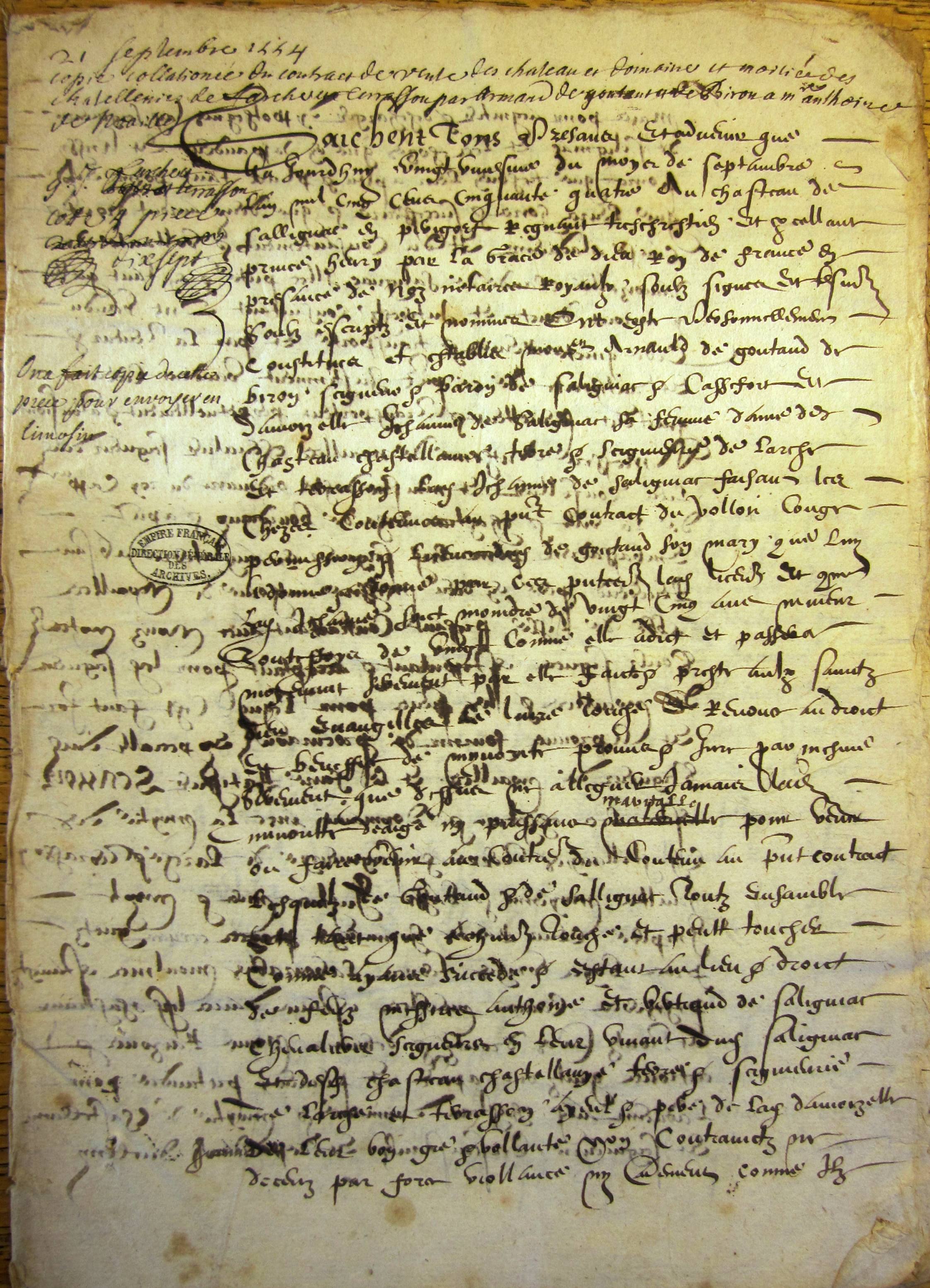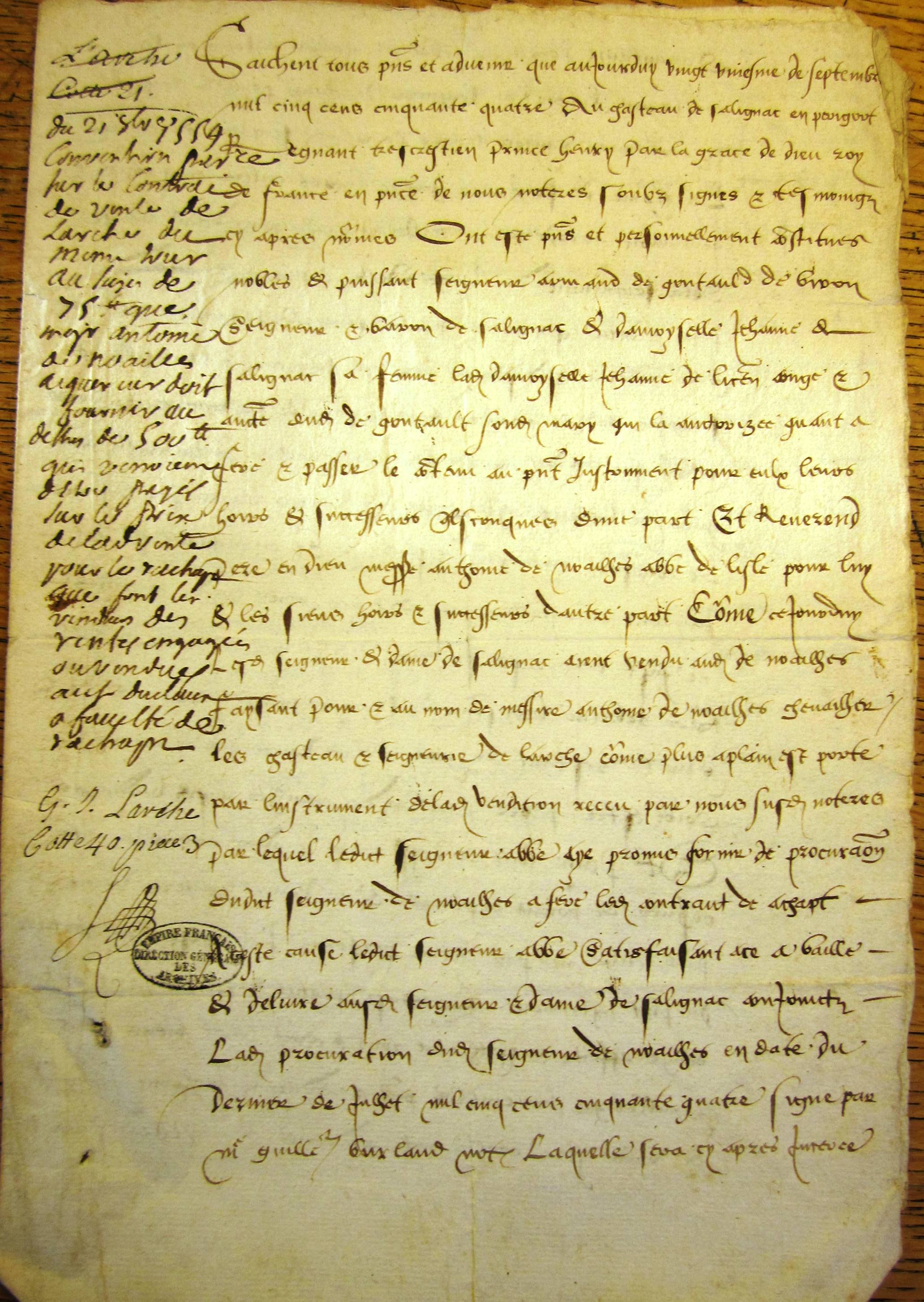 Contrat de la vente de la terre de Larche par Antoine de Gontault-Biron et Jeanne de Salaignac son épouse en faveur d'Antoine de Noailles (21 septembre 1554)