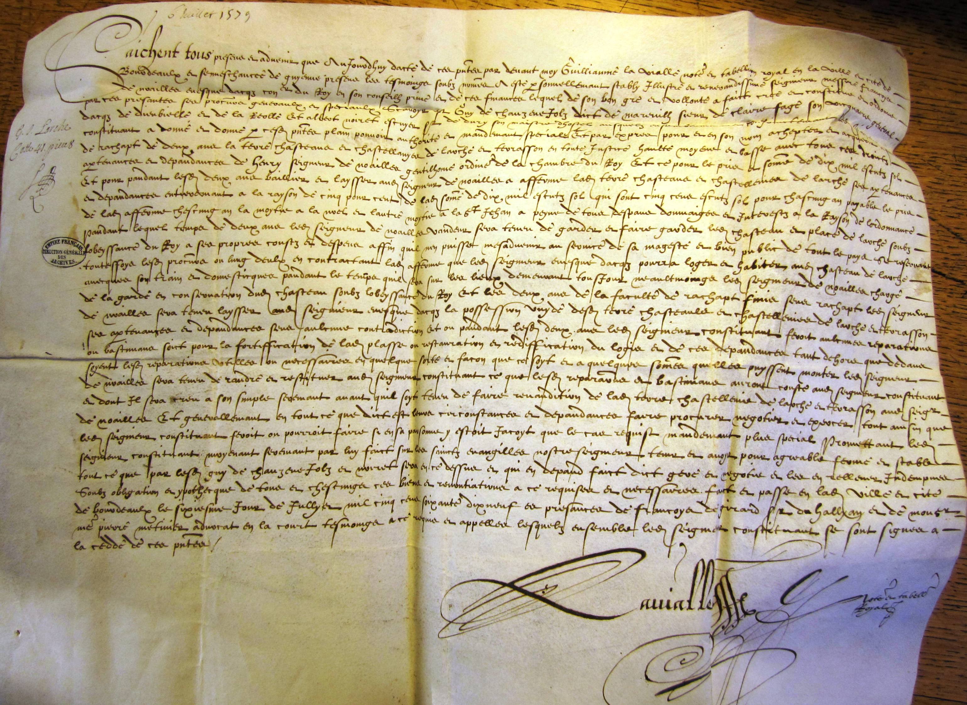 Procuration pour l'acquisition de la terre de Larche (6 juillet 1579) (mss. original en parchemin)