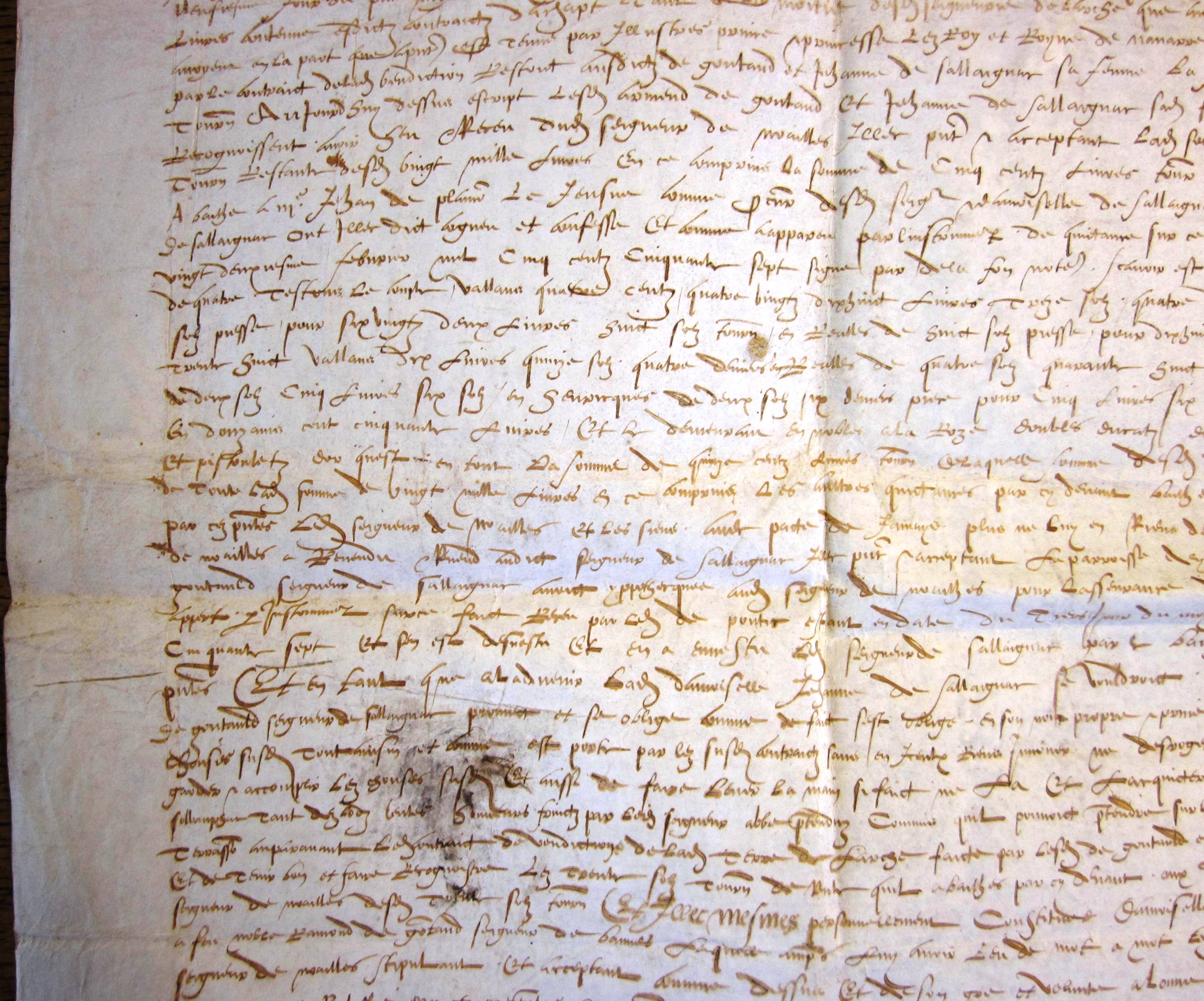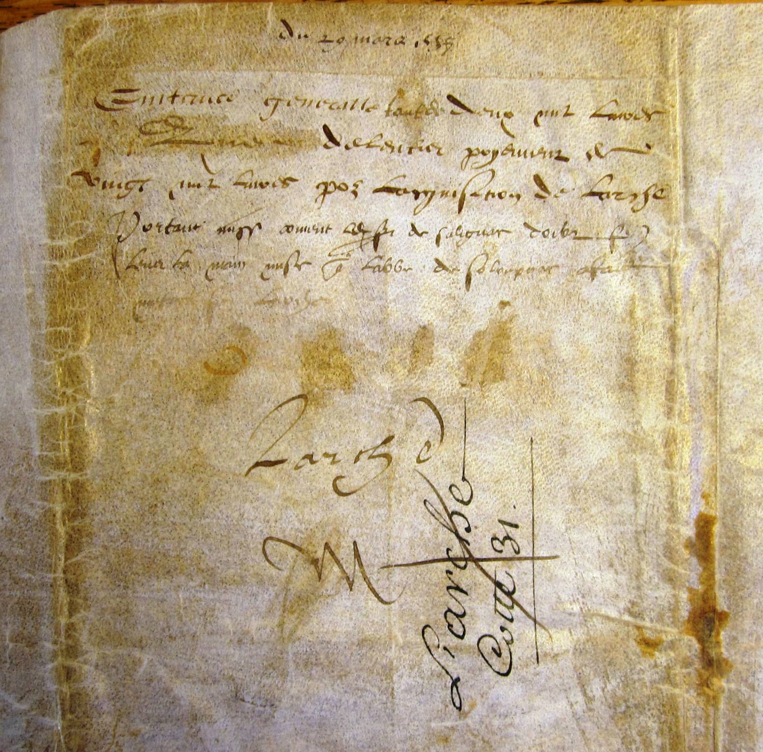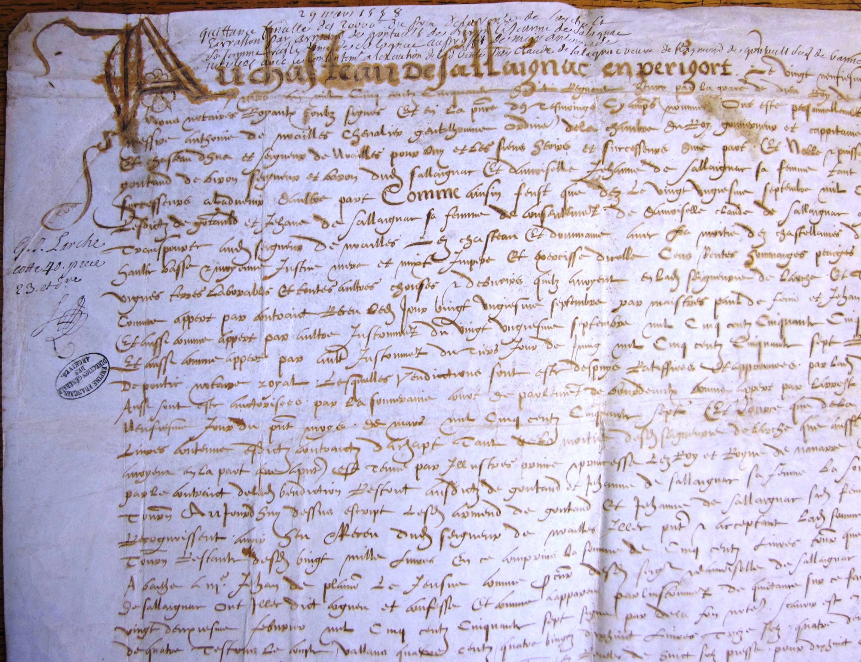 Quittance générale des 20.000 livres payées par Antoine de Noailles pour le prix de l'acquisition de Larche (29 mars 1558) (mss. original, parchemin)