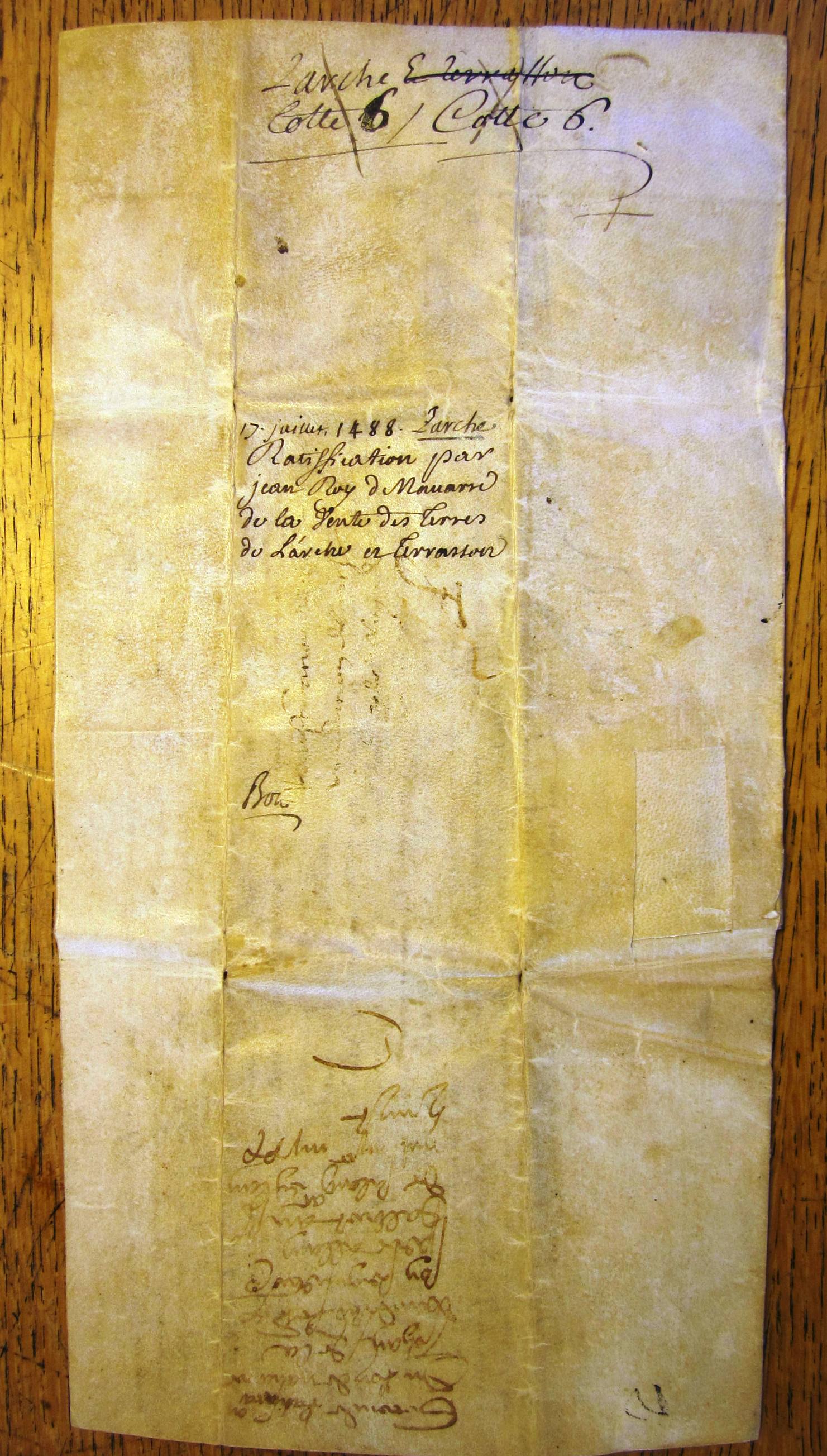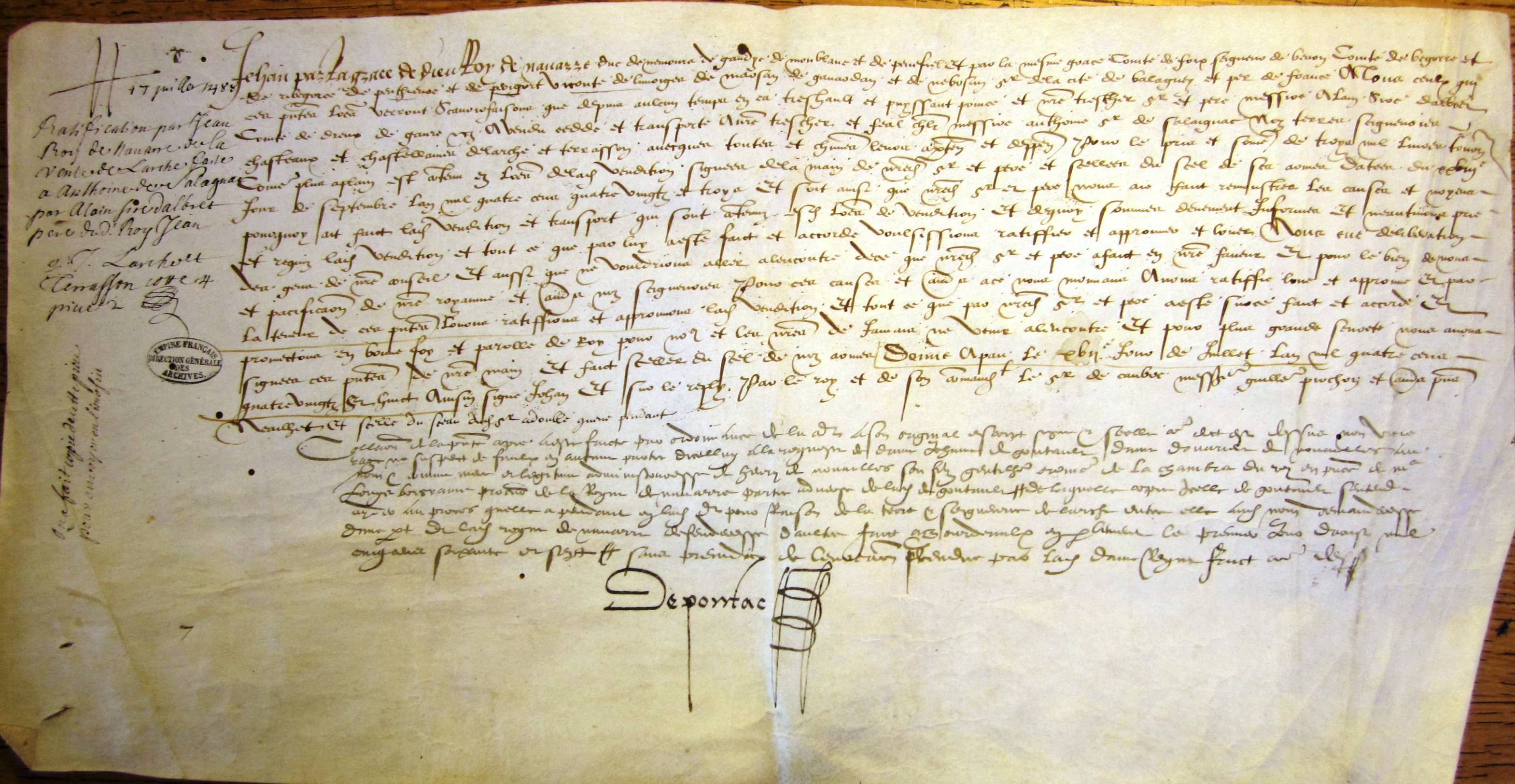 Ratifications par Jean roi de Navarre de la vente de Larche, Terrasson et Nadaillac par Alain d'Albret à Antoine de Salaignac (17 juillet 1488)