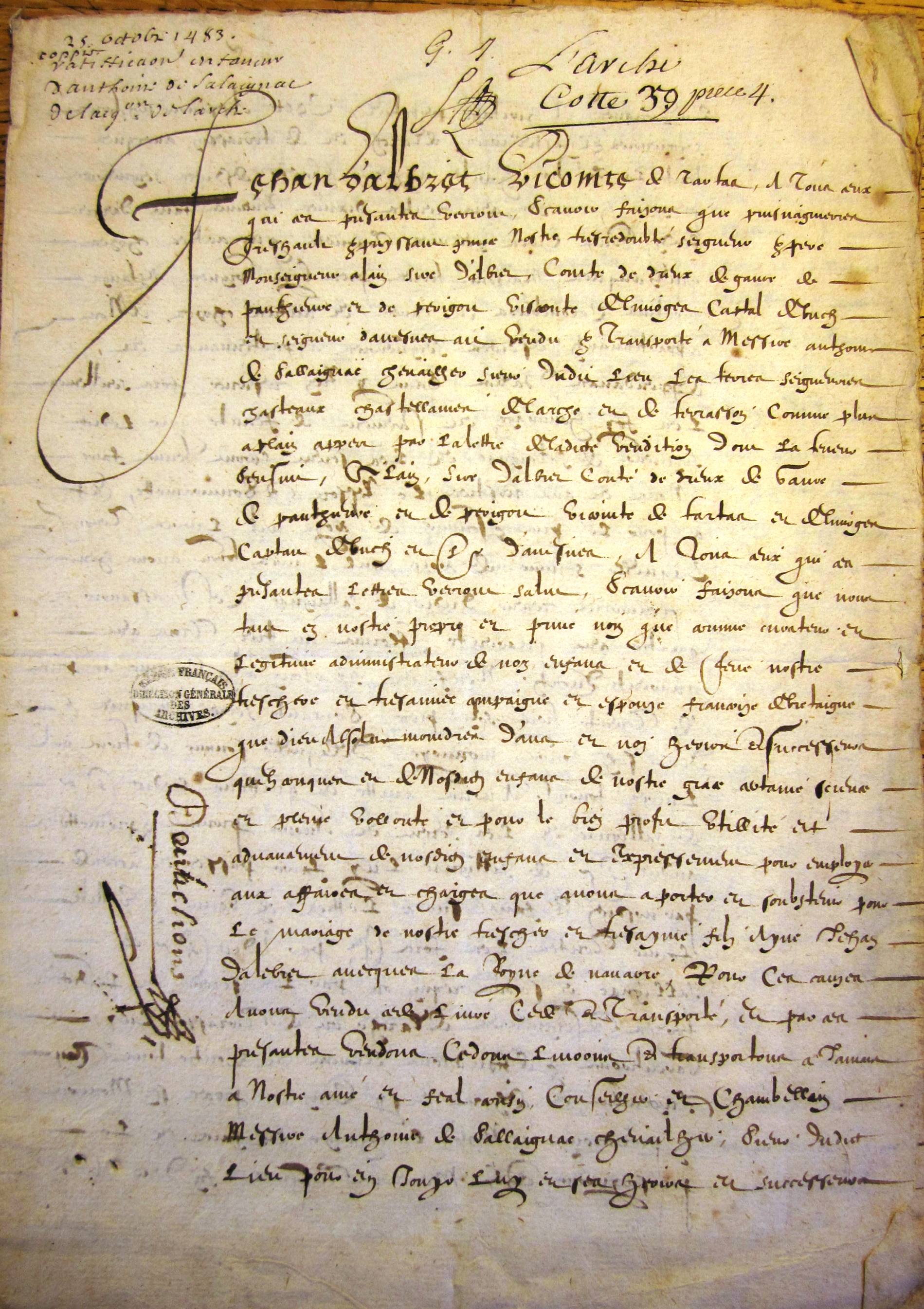 Ratification par Jean d'Albret de la vente de Larche et Terrasson par Alain d'Albret son père à Antoine de Salaignac (25 octobre 1483)