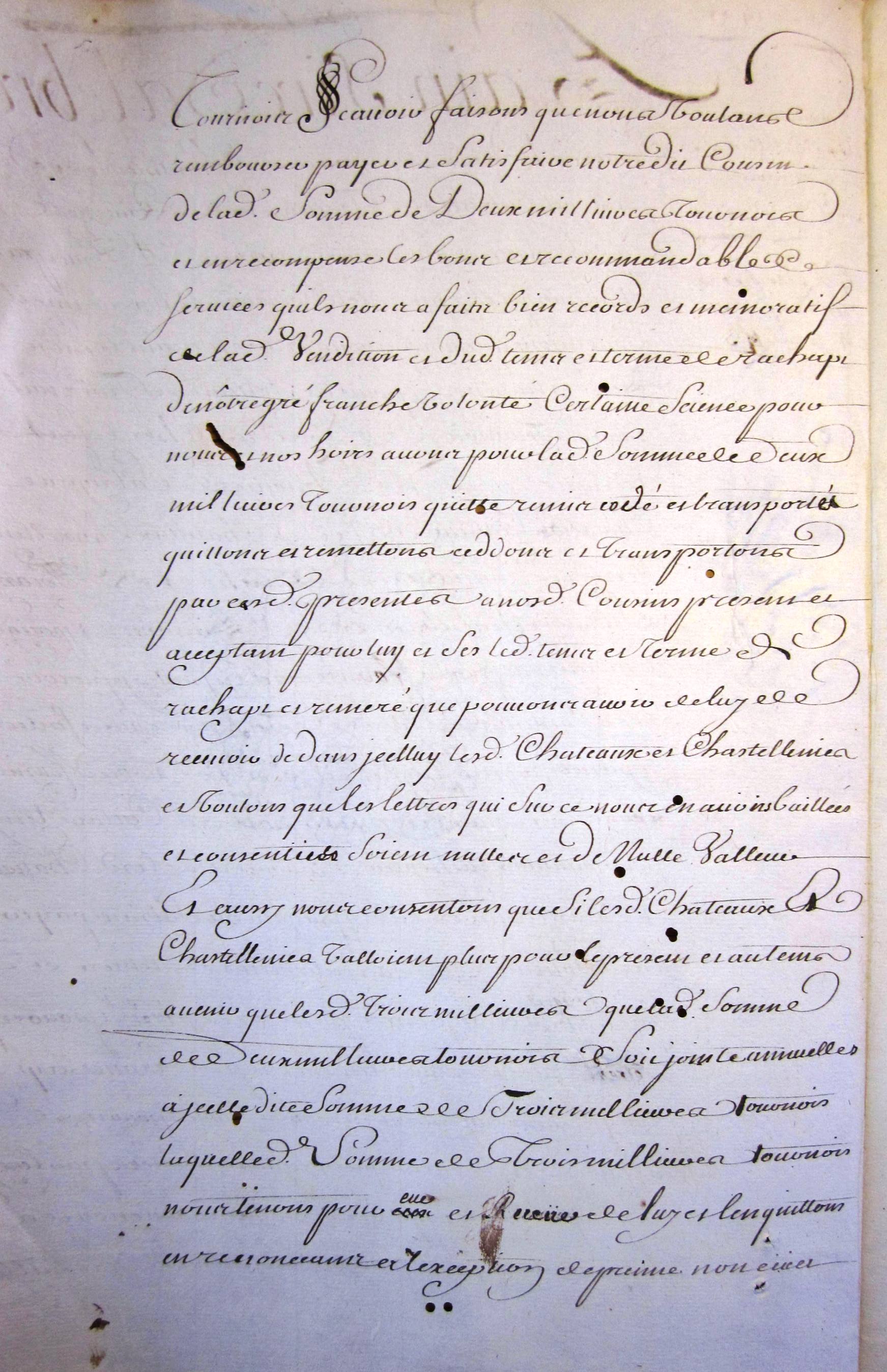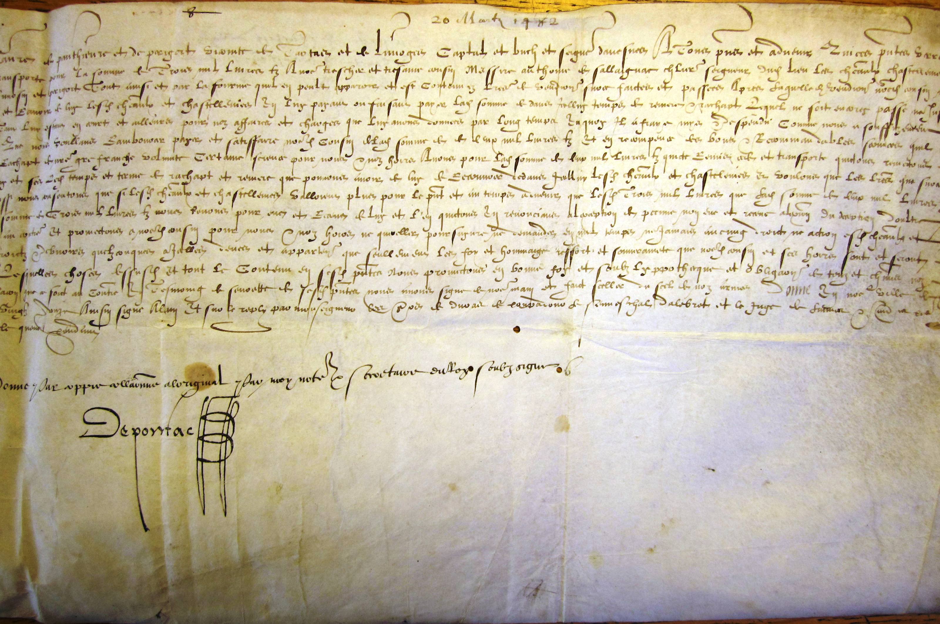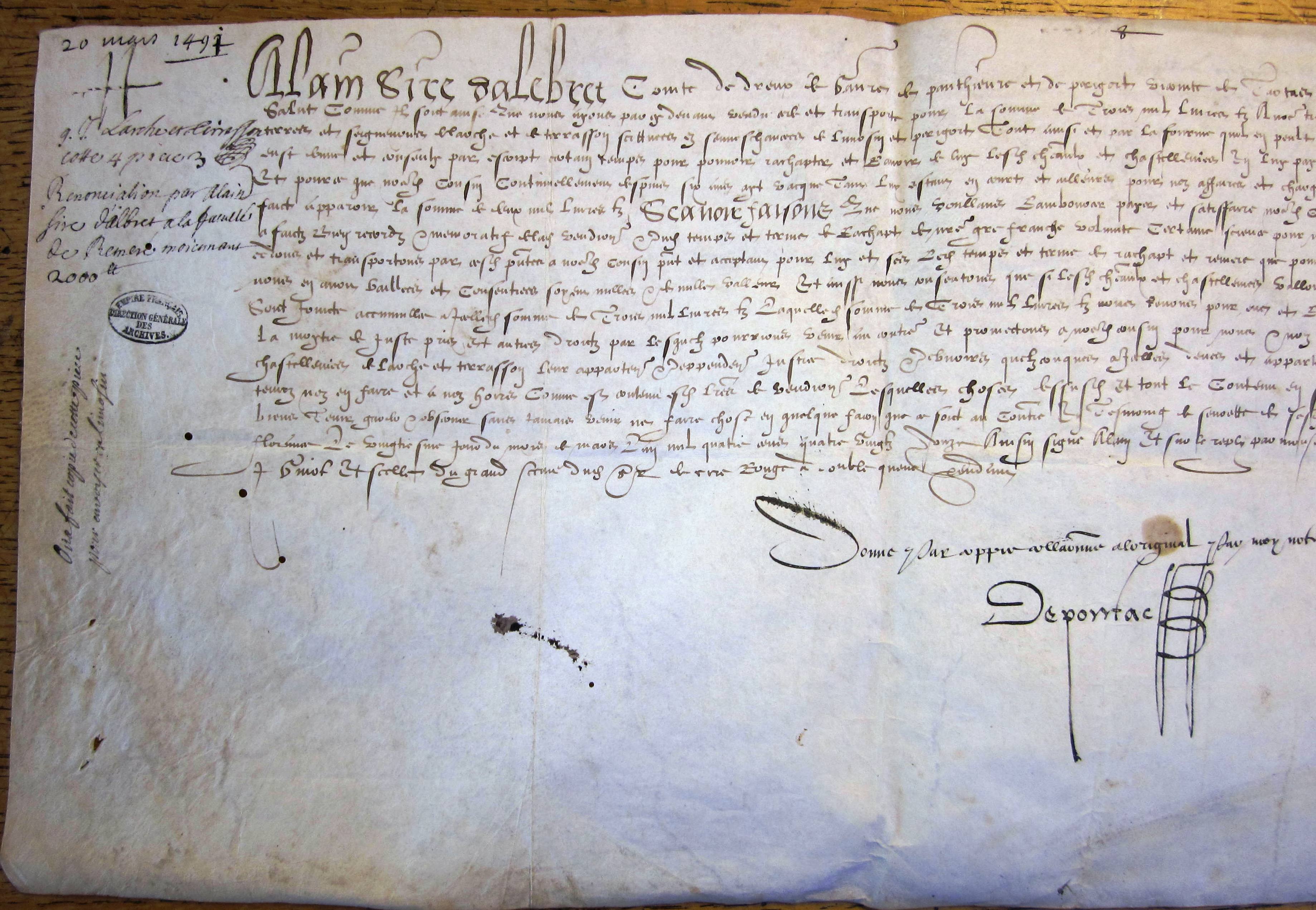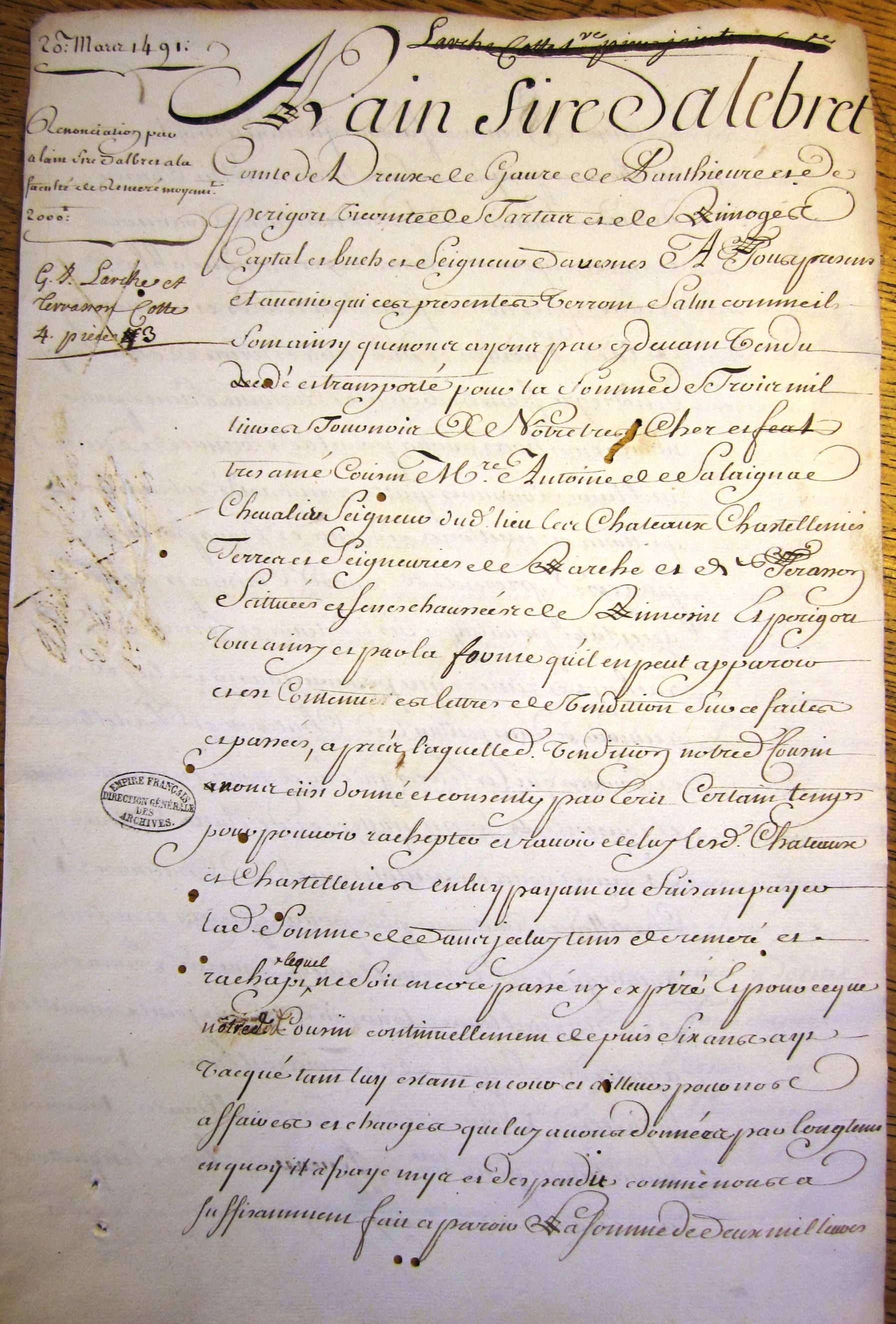 Renonciation par Alain d'Albret à sa faculté de réméré sur la terre de Larche, moyennant 2.000 livres (20 mars 1491)