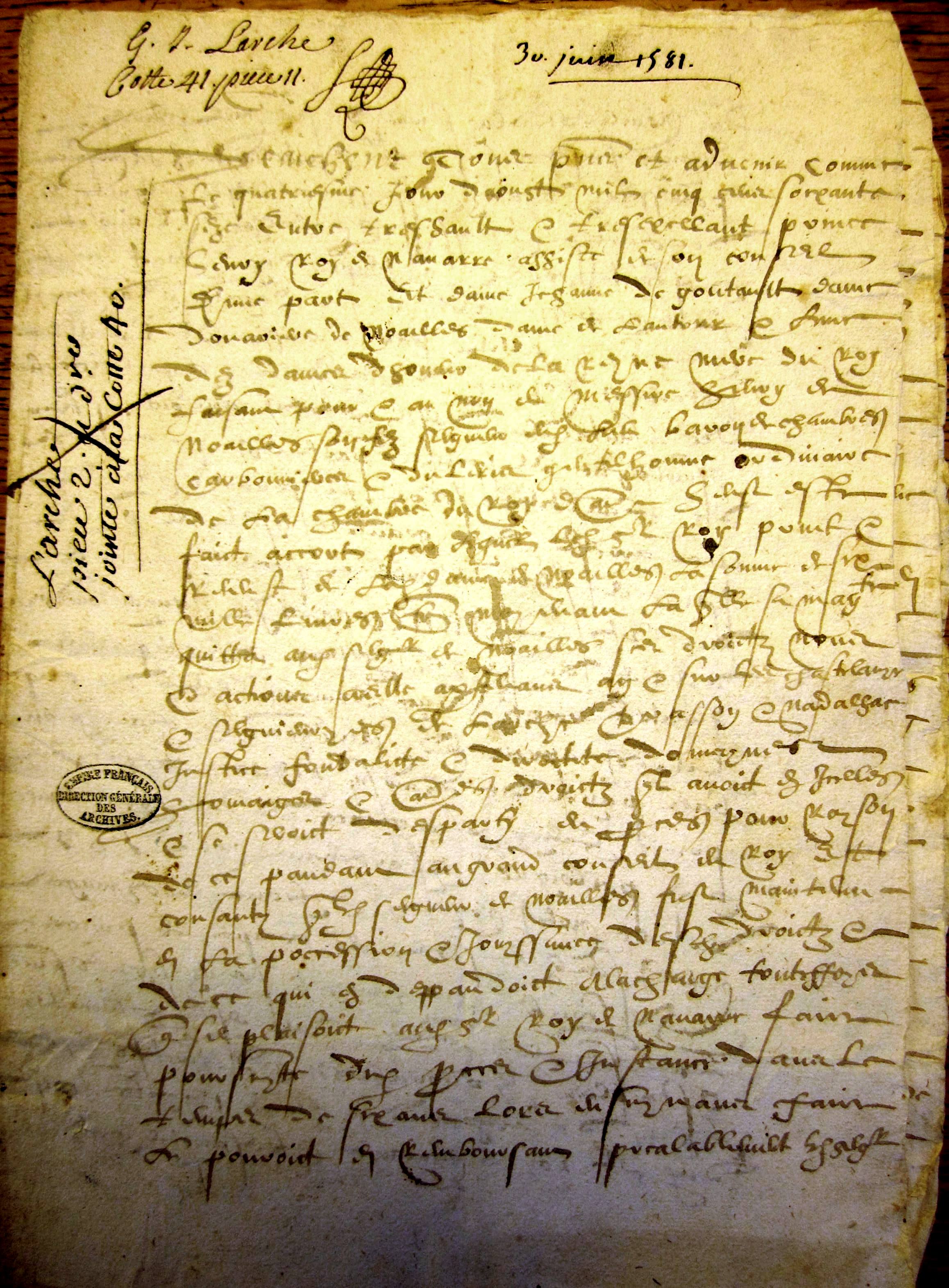Contrat passé entre le roi de Navarre et Henri de Noailles (30 juin 1581)