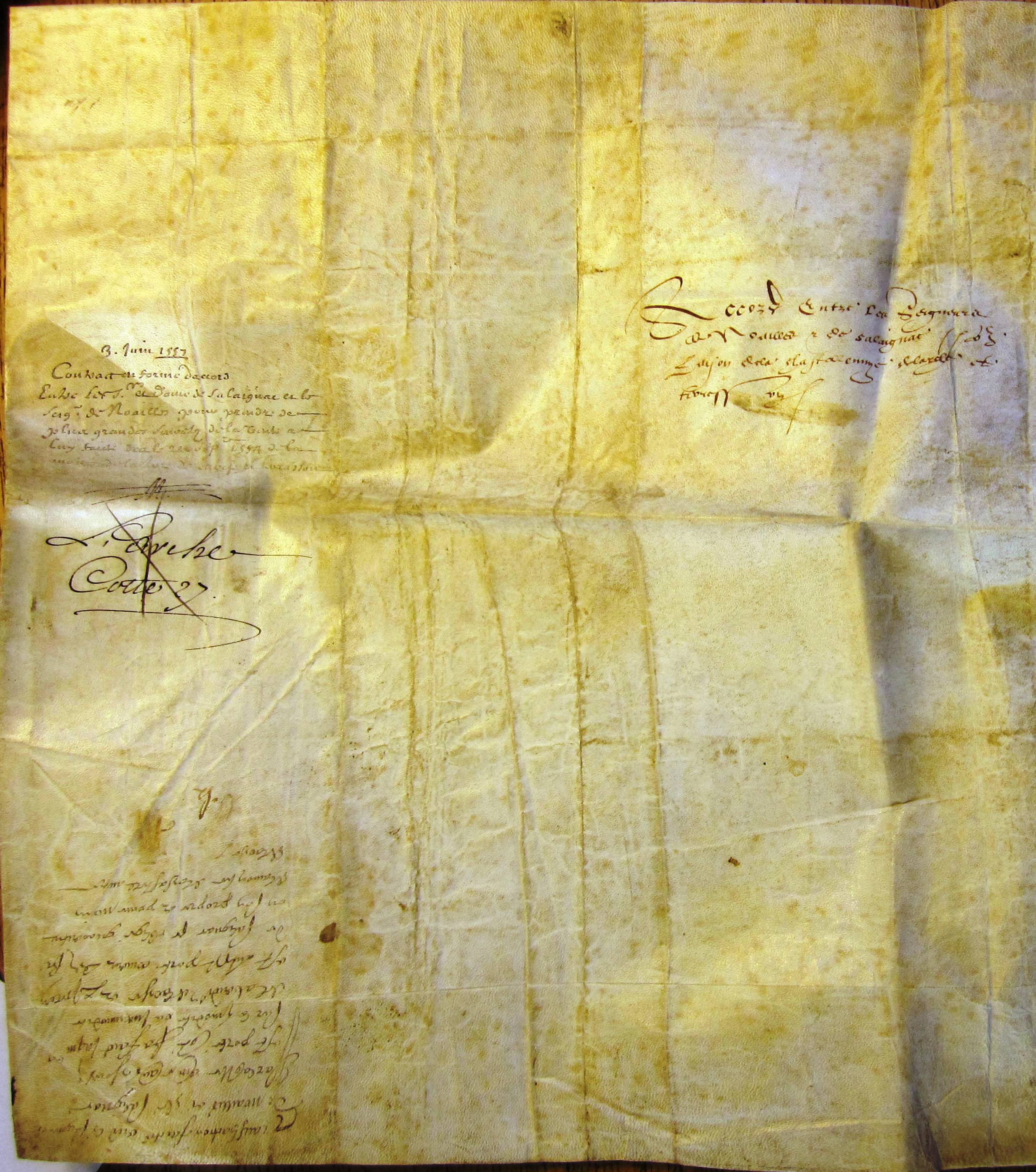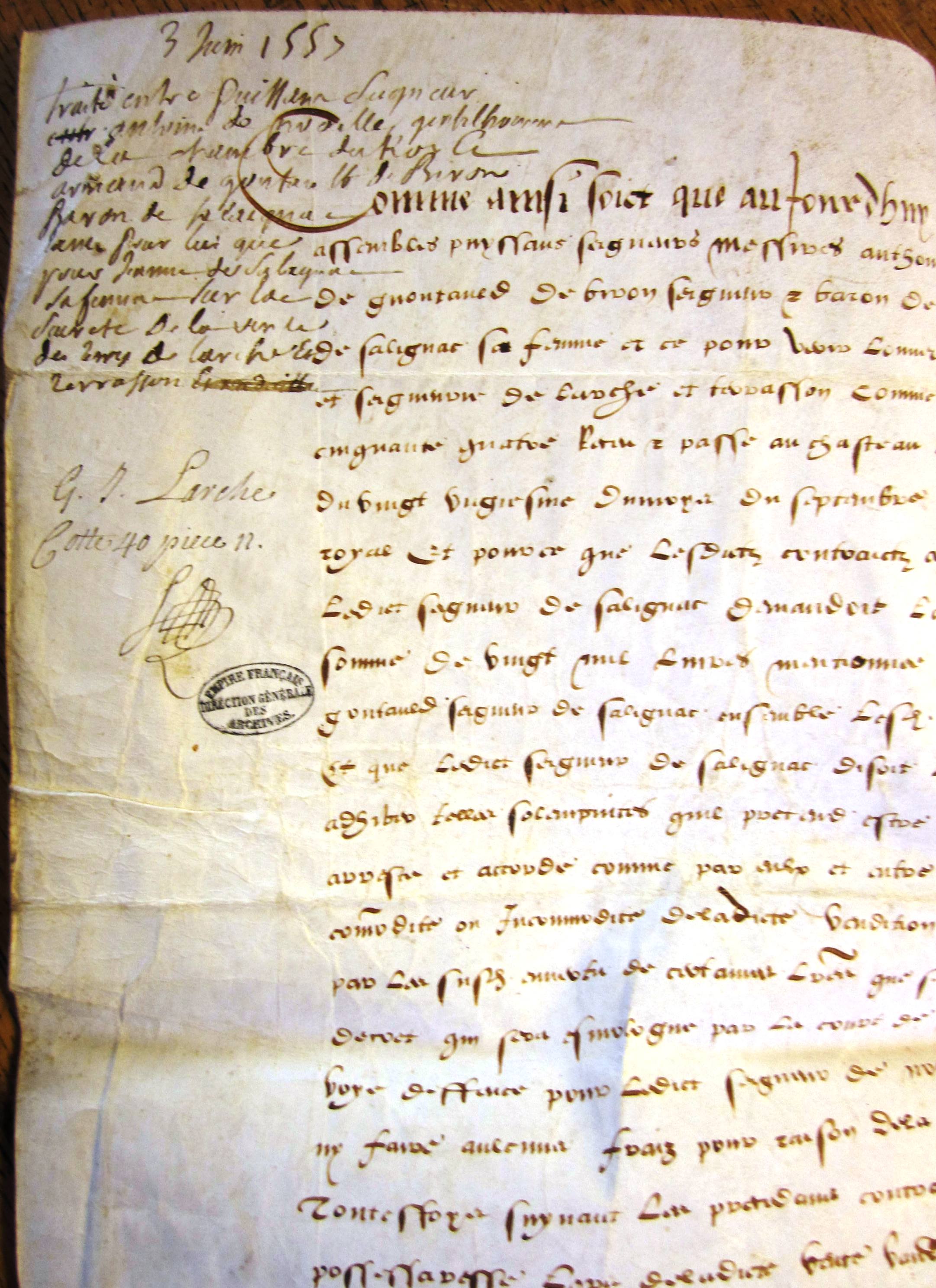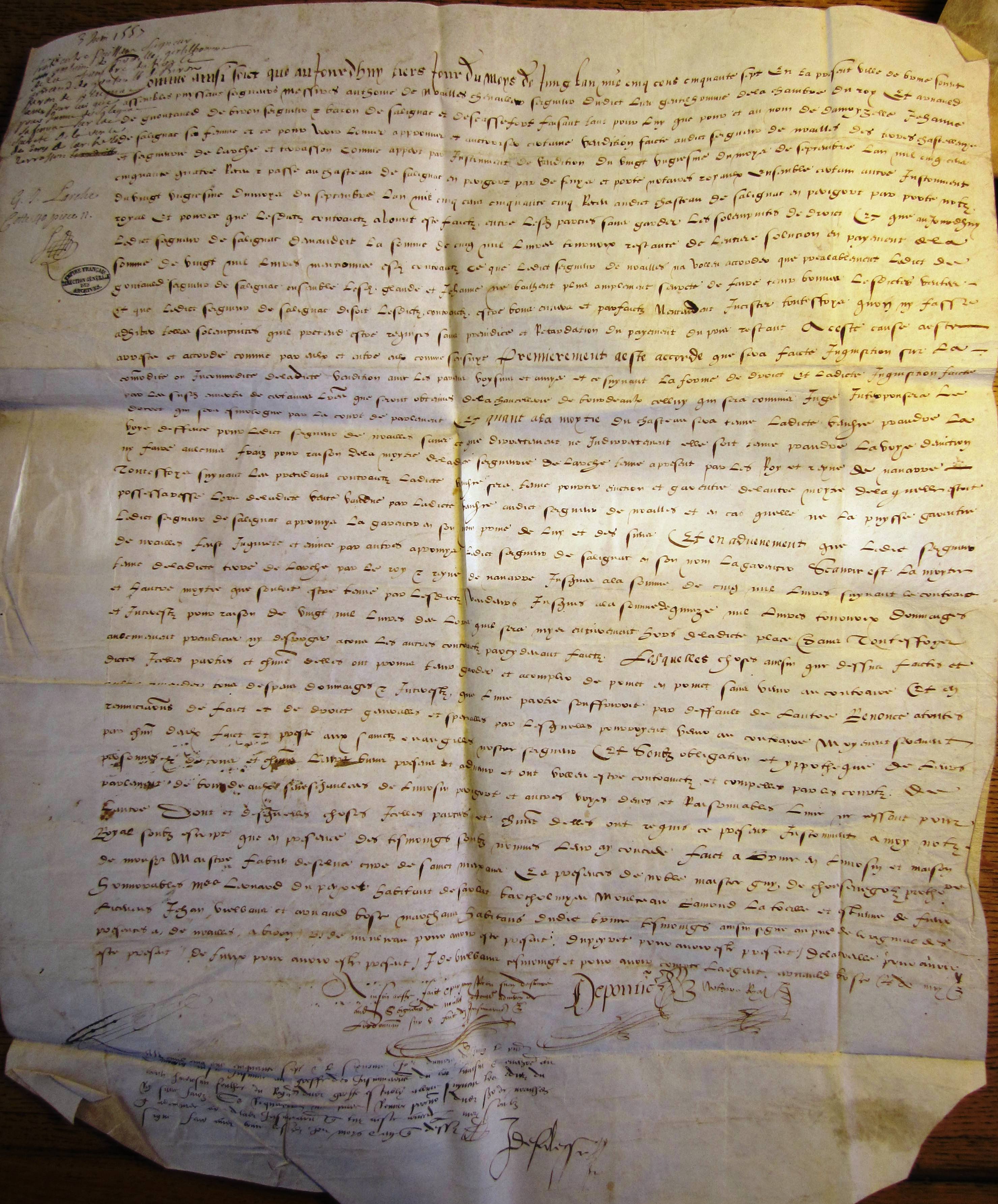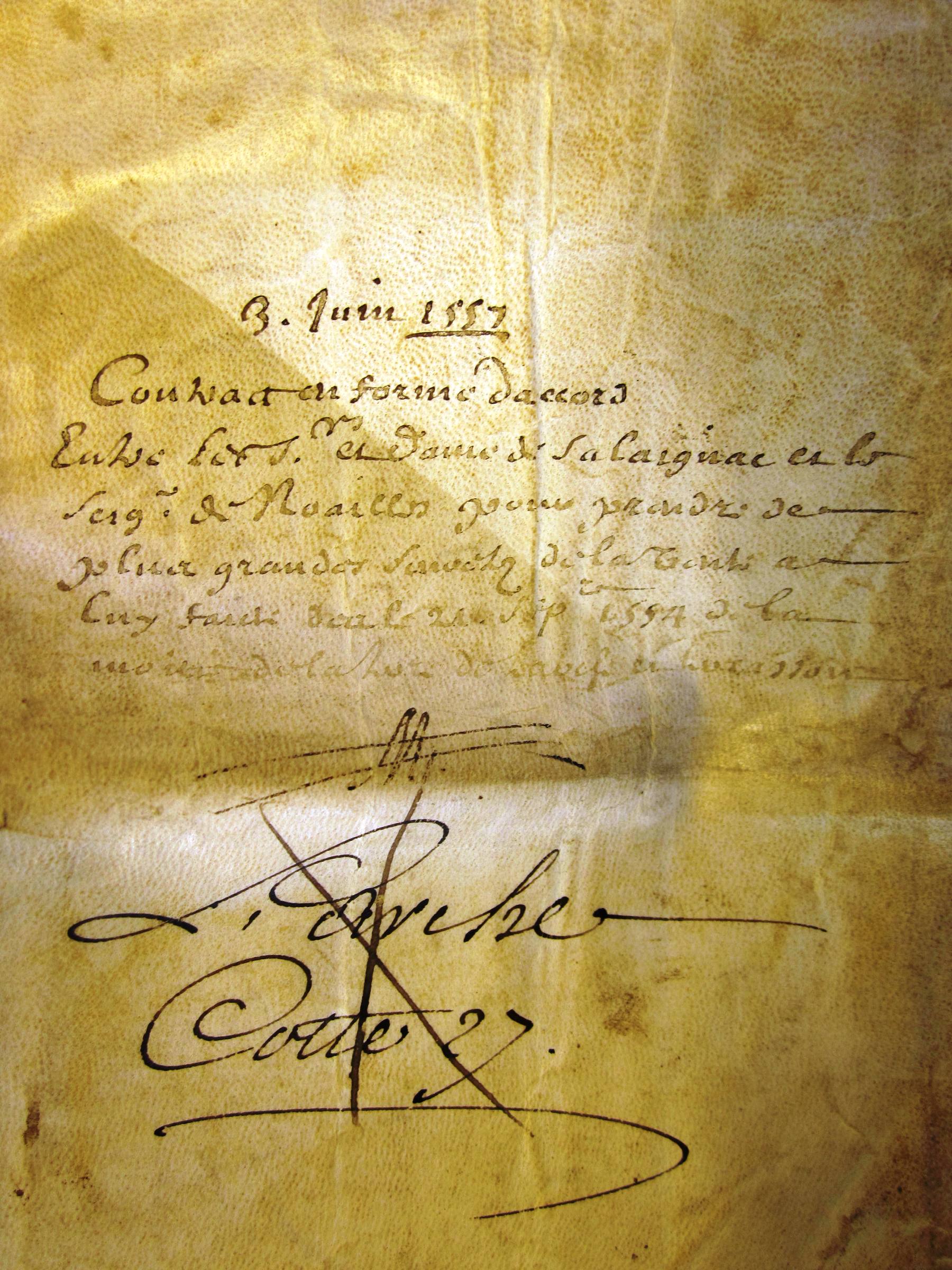 Traité ou accord entre Antoine de Noailles et Arnaud de Gontault-Biron baron de Salaignac sur la vente de Larche et Terrasson (3 juin 1557)