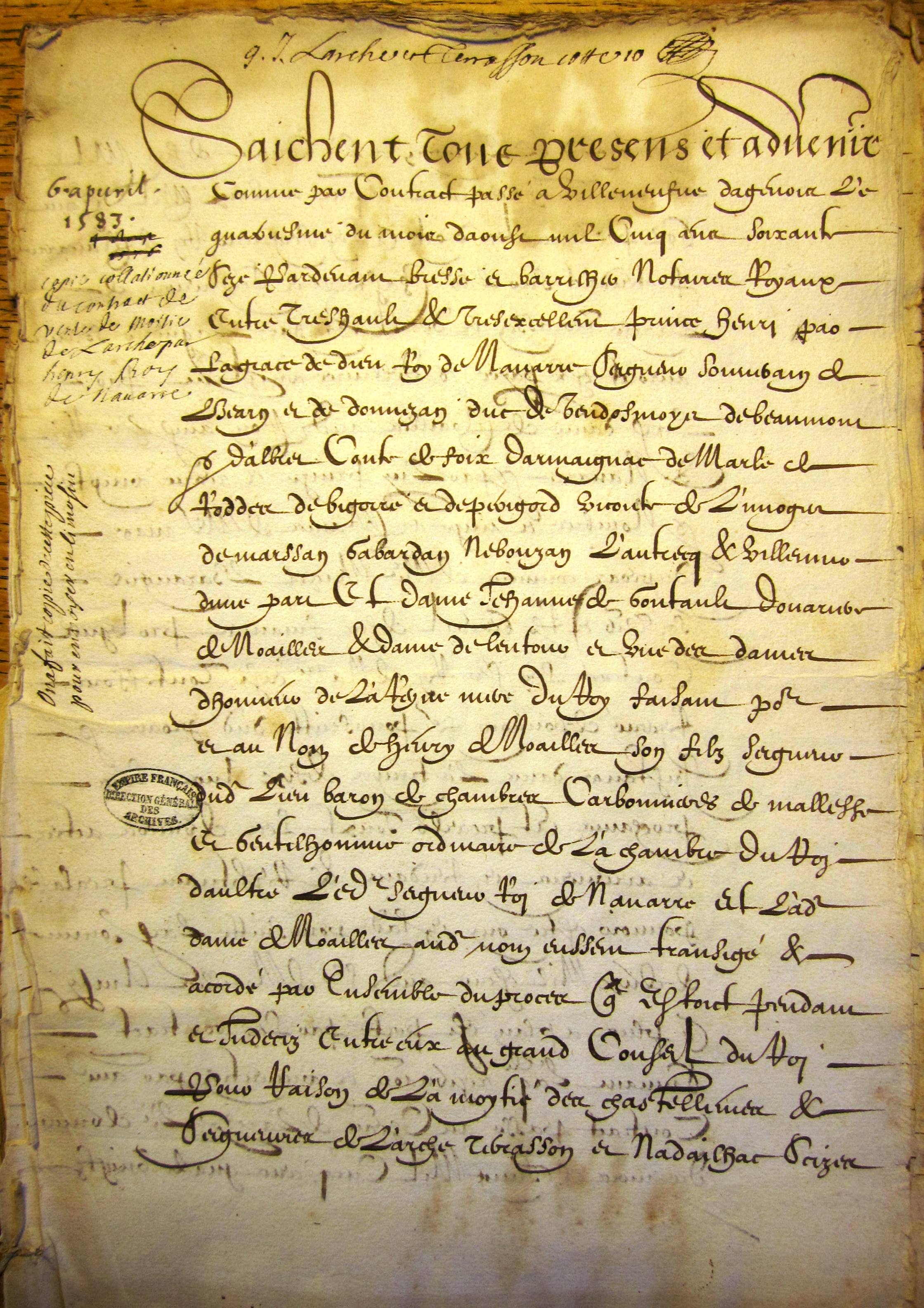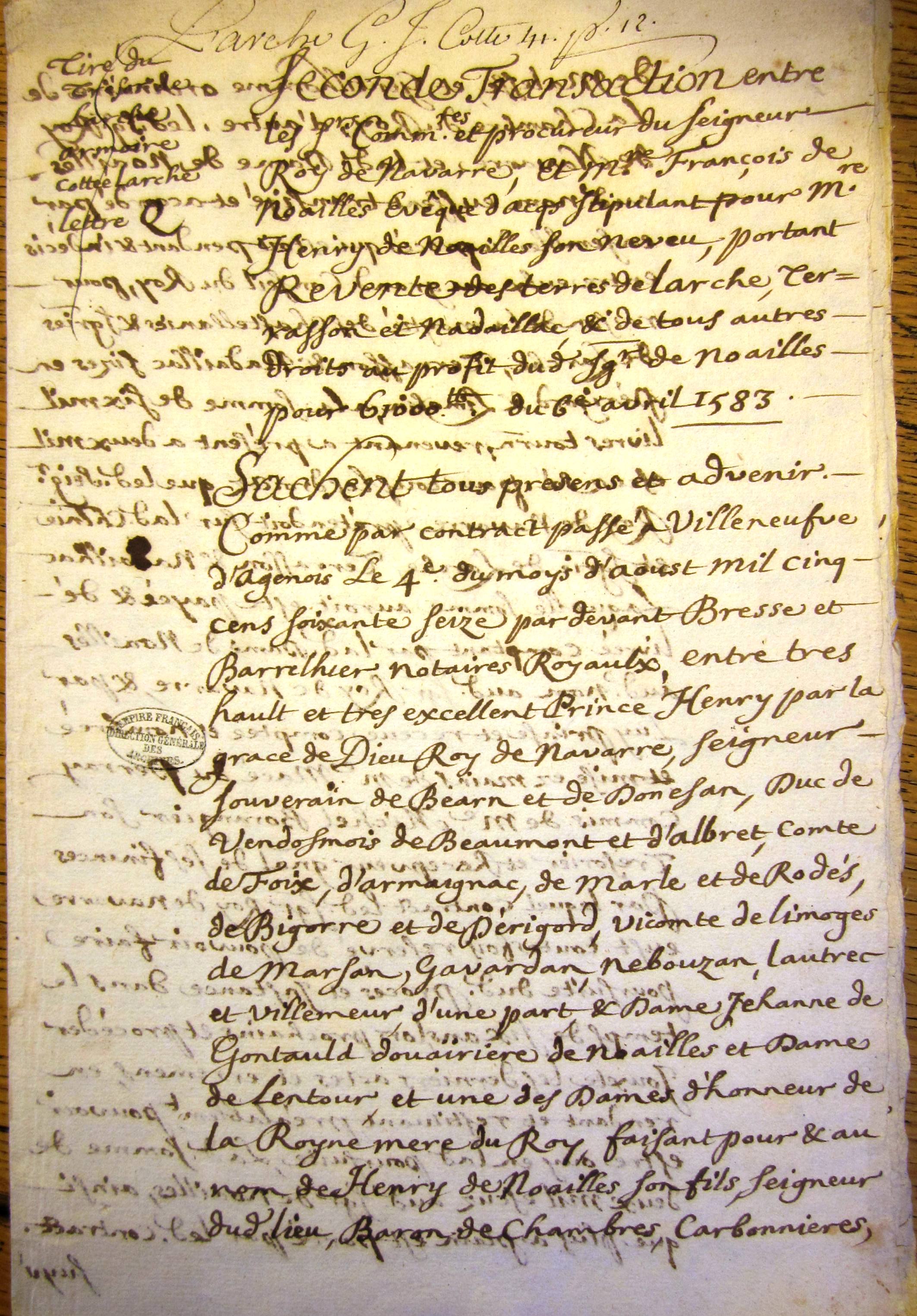 Seconde transaction entre Henri de Noailles et le roi de Navarre concernant les terres de Larche, Terrasson et Nadaillac (6 avril 1583)