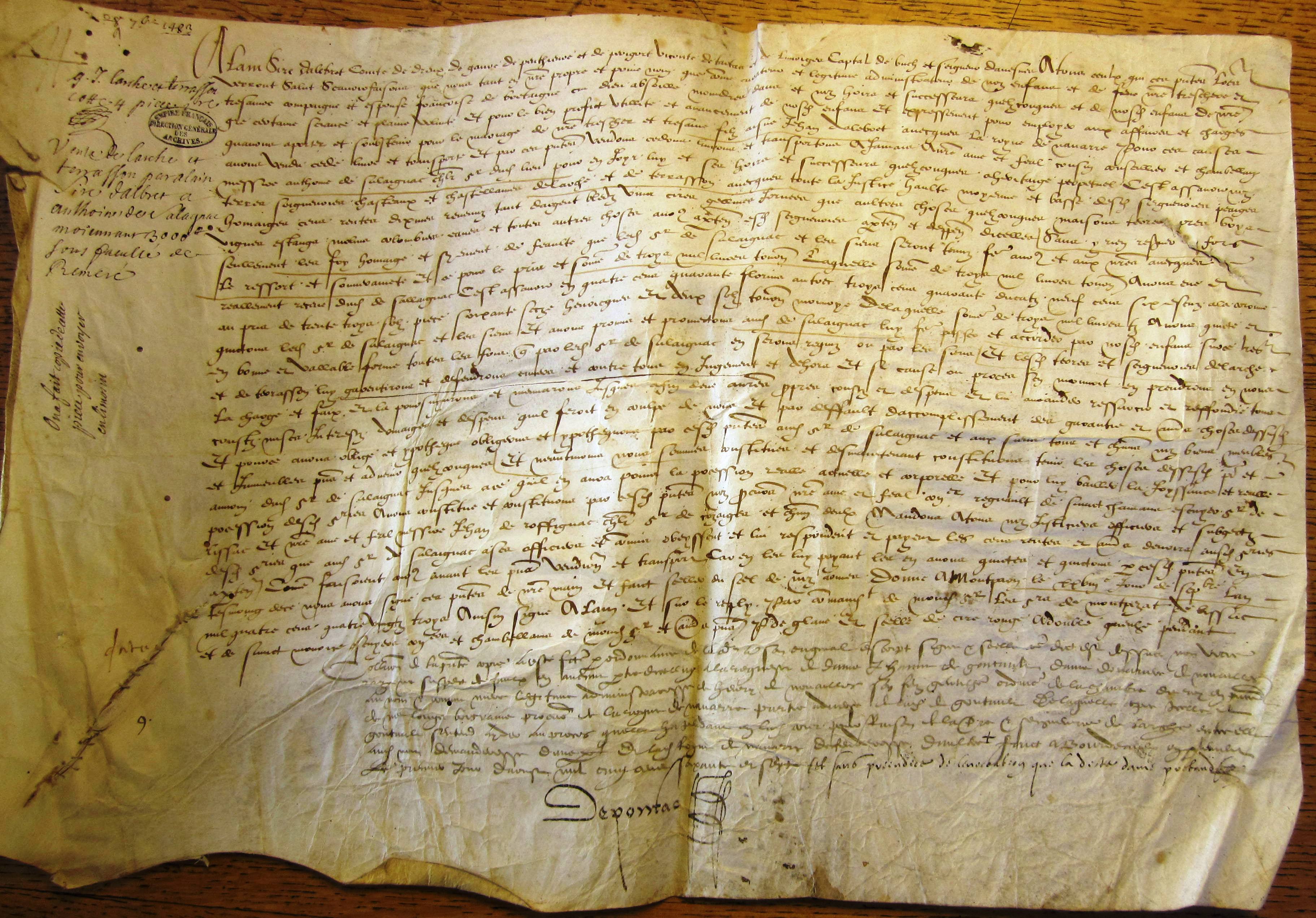 Vente de Larche et Terrasson par Alain d'Albret à Antoine de Salaignac pour 3.000 livres sans faculté de réméré (28 sept. 1483)