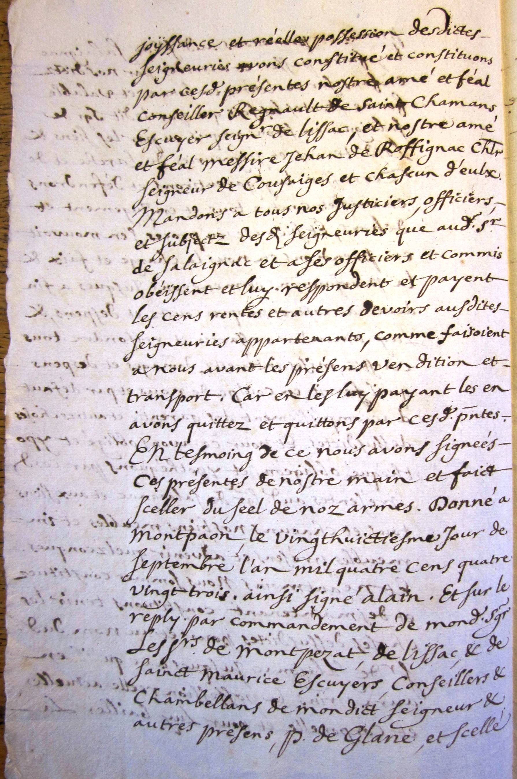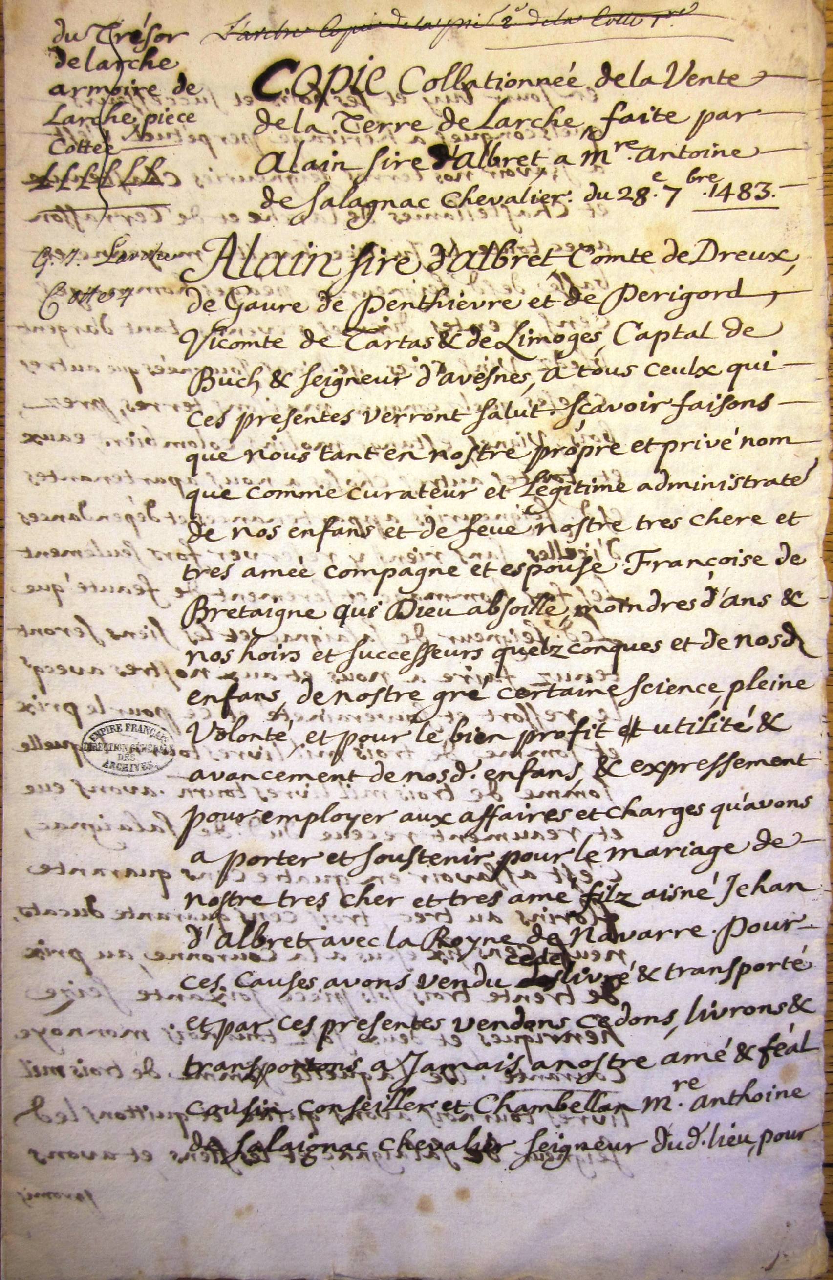 Vente de Larche et Terrasson par Alain d'Albret à Antoine de Salaignac pour 3.000 livres sans faculté de réméré (28 sept. 1483)