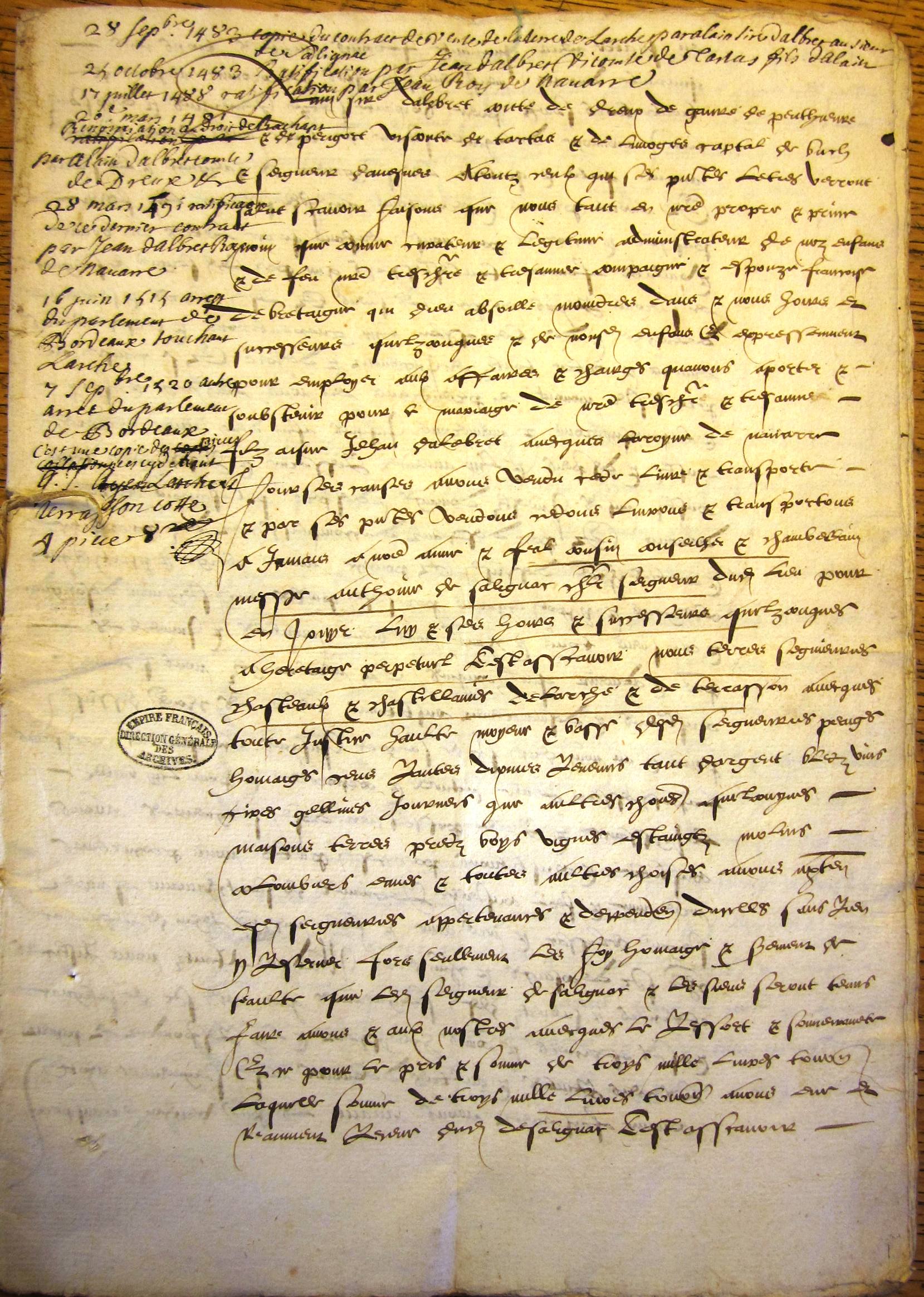- 28 mars 1491 : ratification de ce contrat par Jean d'Albret
