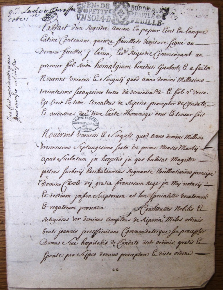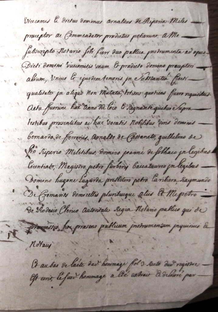 Hommage de Arnaud de Riperia, de l'ordre de St Jean de Jerusalem, commandeur de l'Hopital de Condat, à Renaud de Pons (1376)