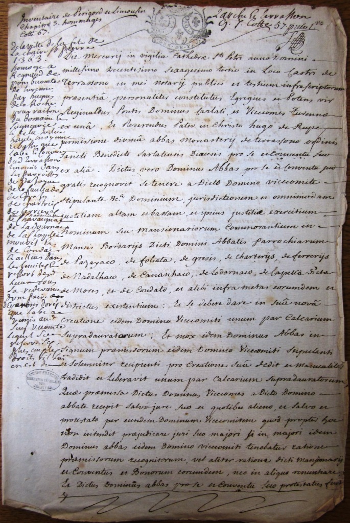 Hommage de Hugues de la Roche, abbé de Terrasson, à Renaud de Pons (1363)