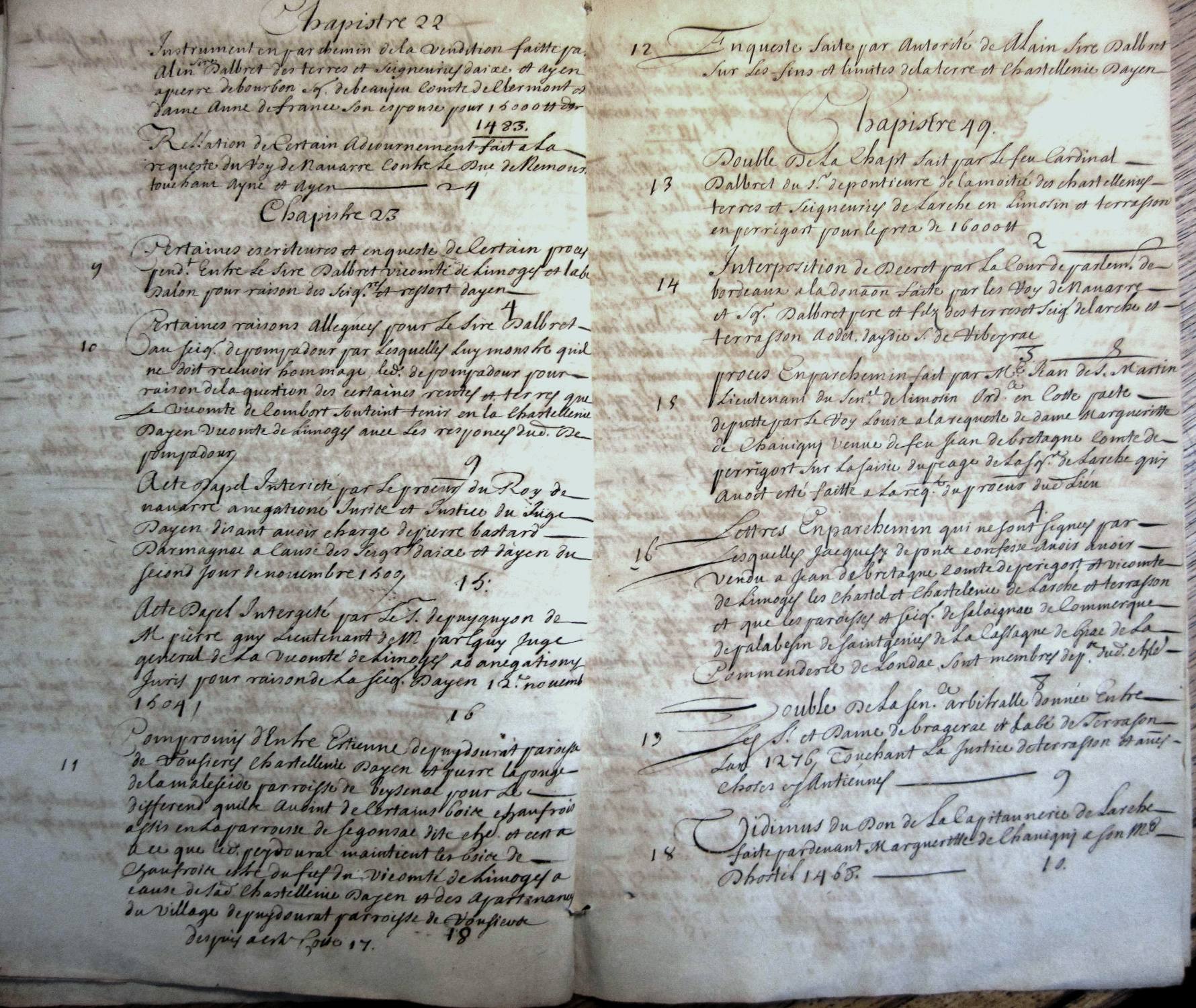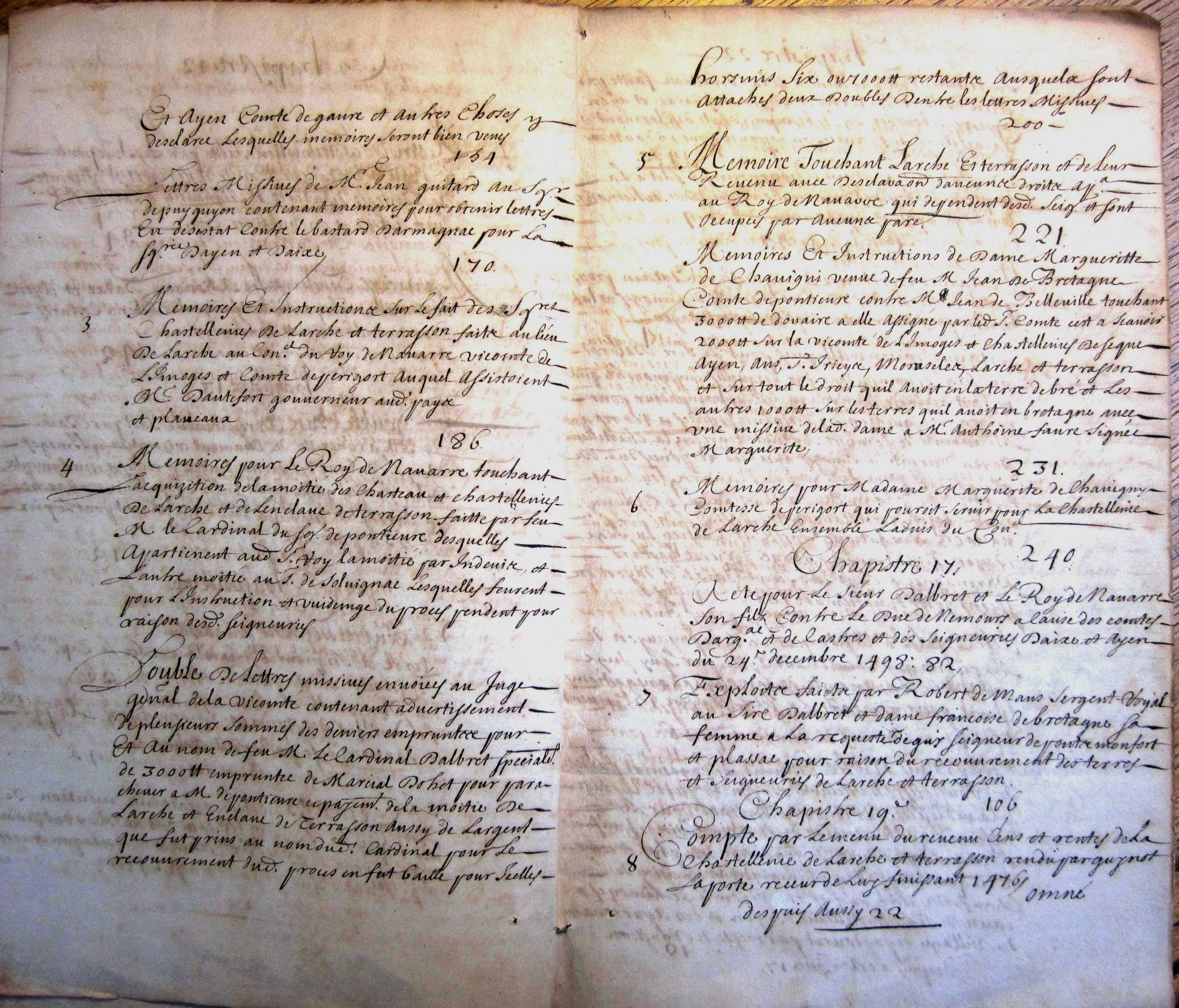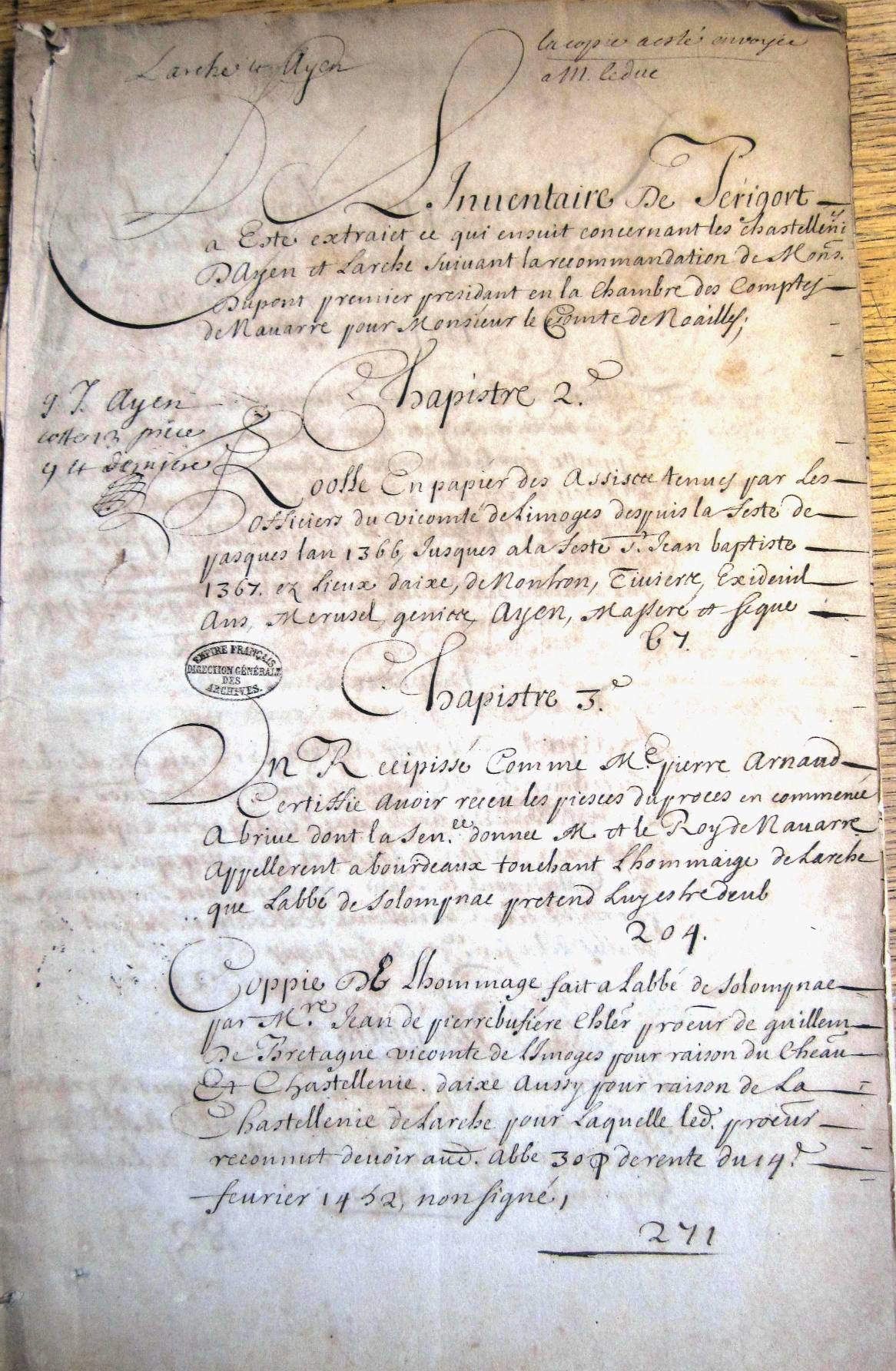 Inventaire au chateau de Navarre des titres concernant les châtellenies d'Ayen et de Larche pour M. le duc de Noailles.