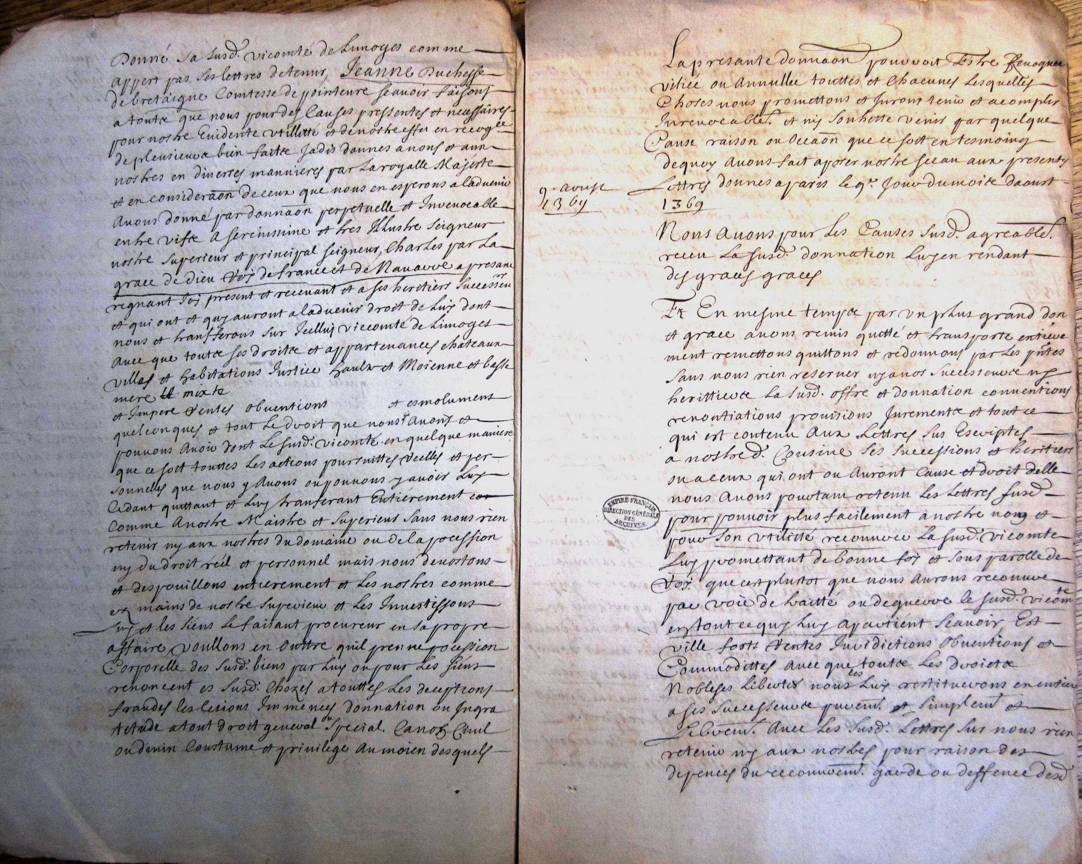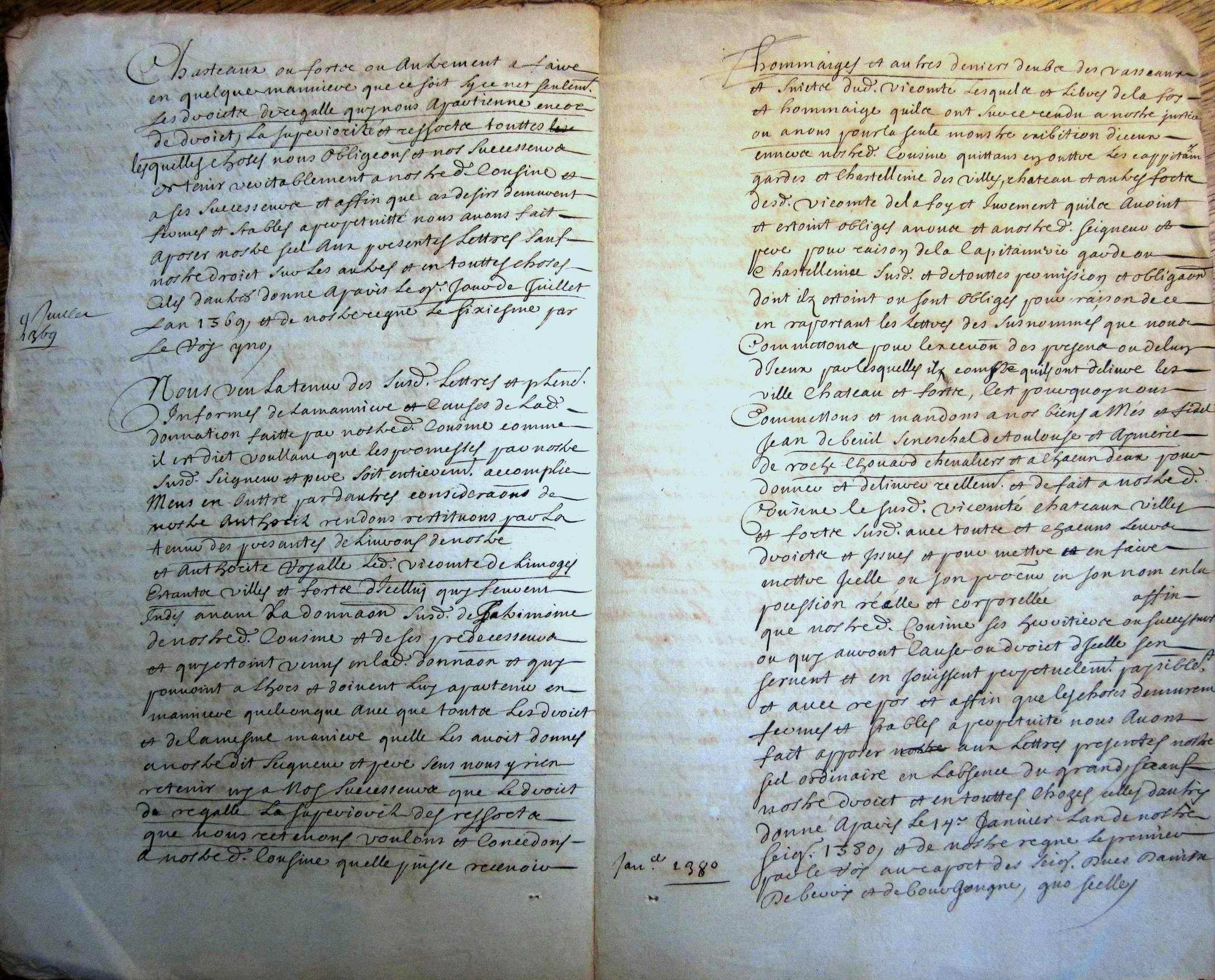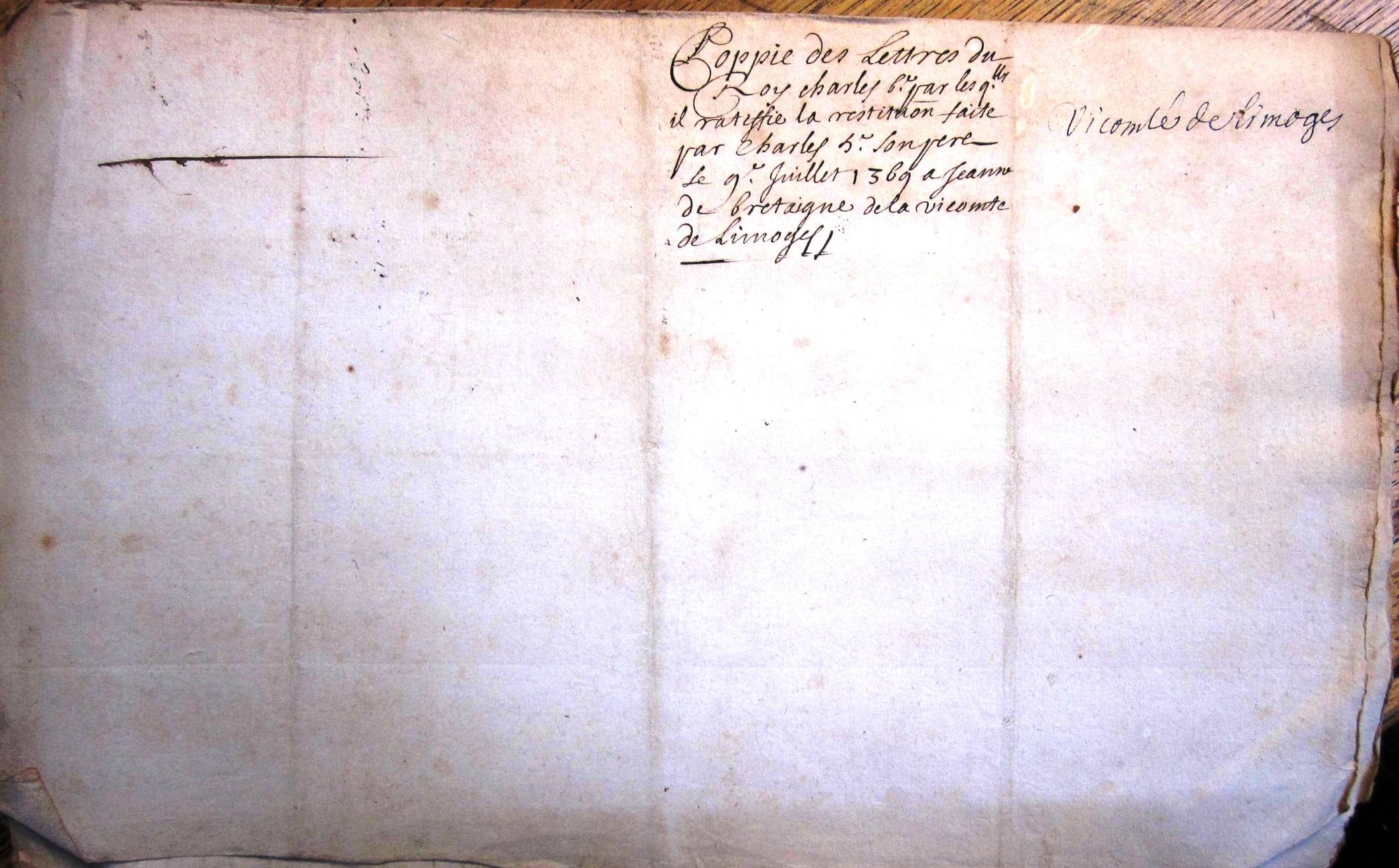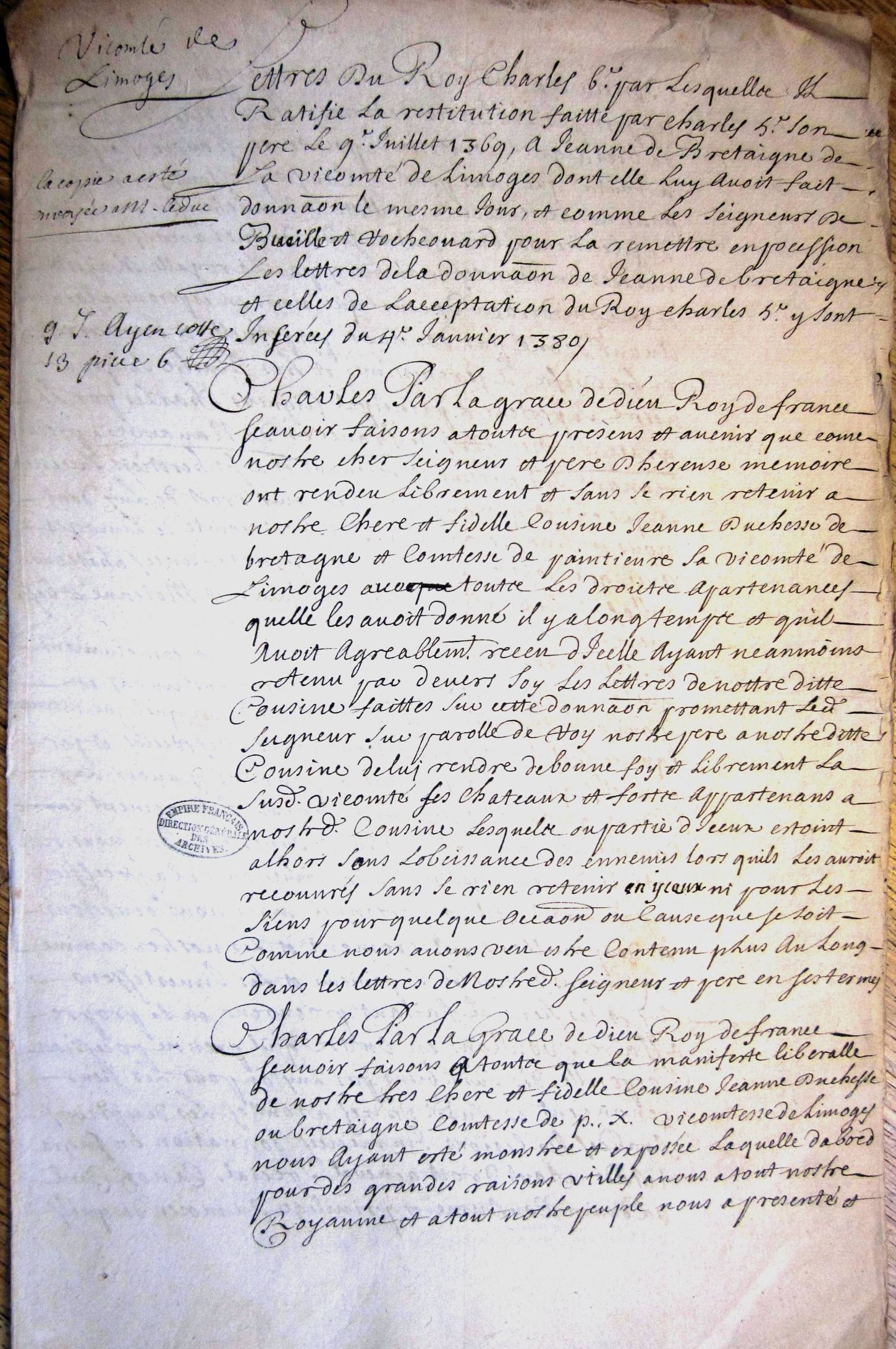 Copie des lettres de Charles VI ratifiant celles de son père Charles V accordant la vicomté de Limoges à Jeanne de Bretagne.