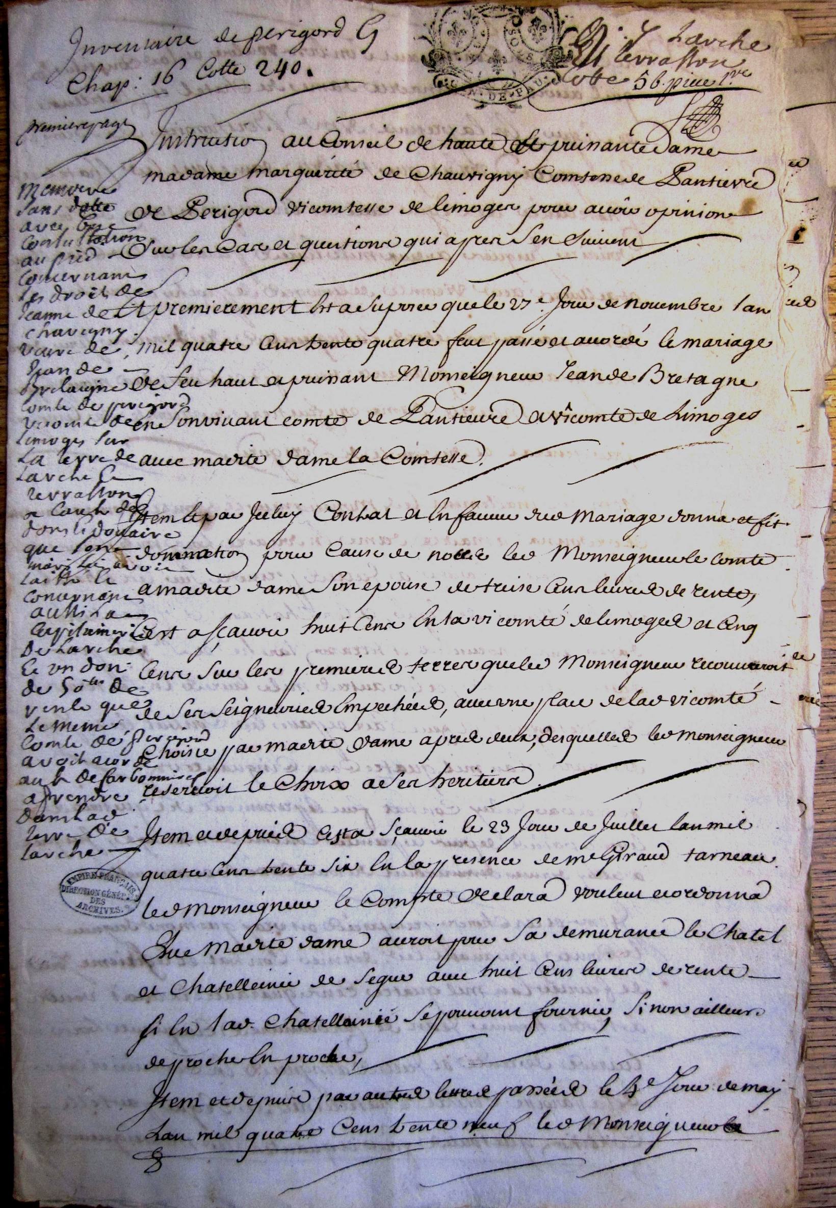 Remarque préliminaire : il est indiqué en première, en haut et à gauche "Inventaire de Perigord, chapitre 16, cotté 240".