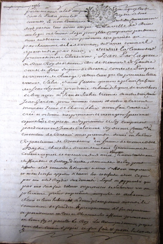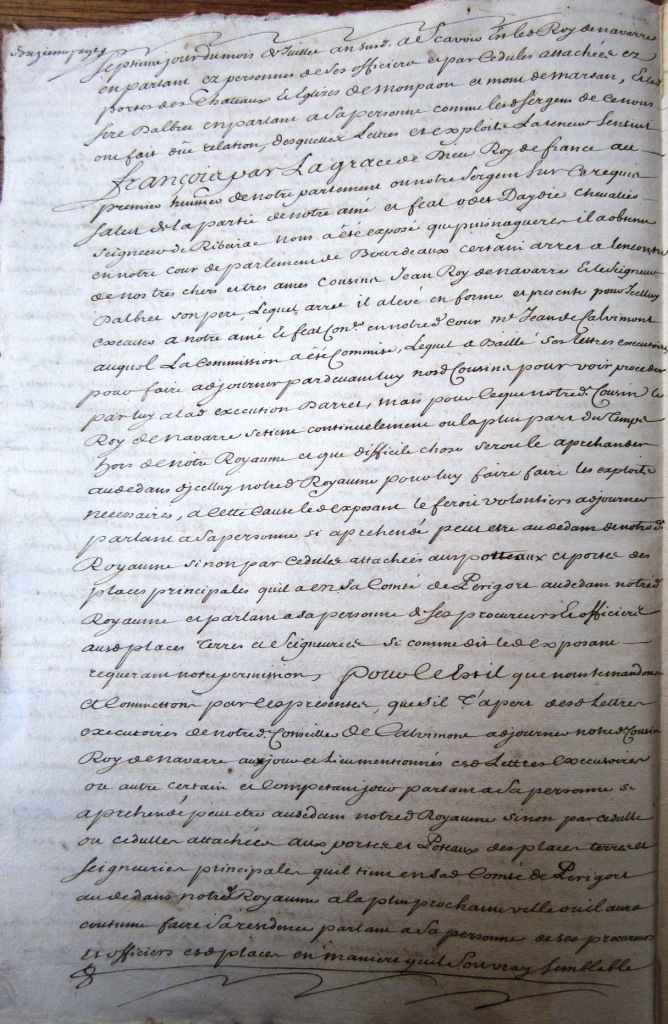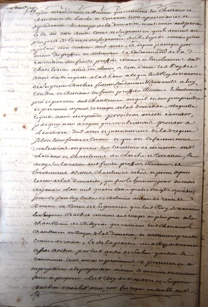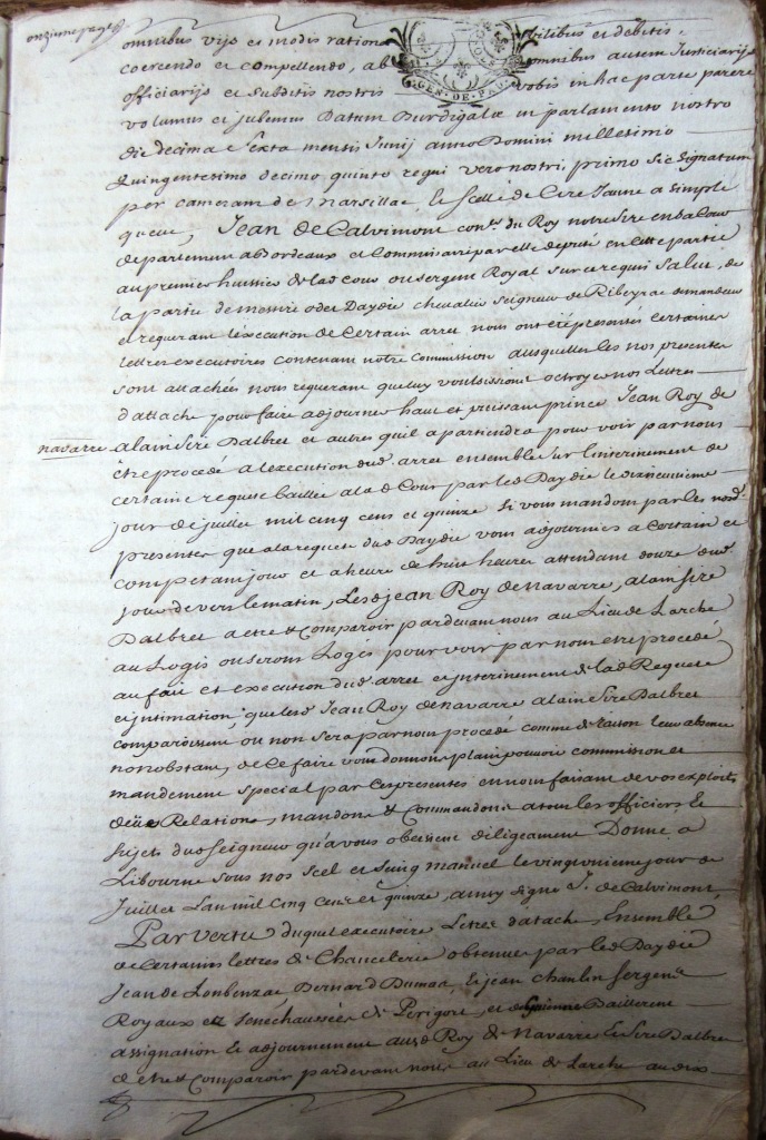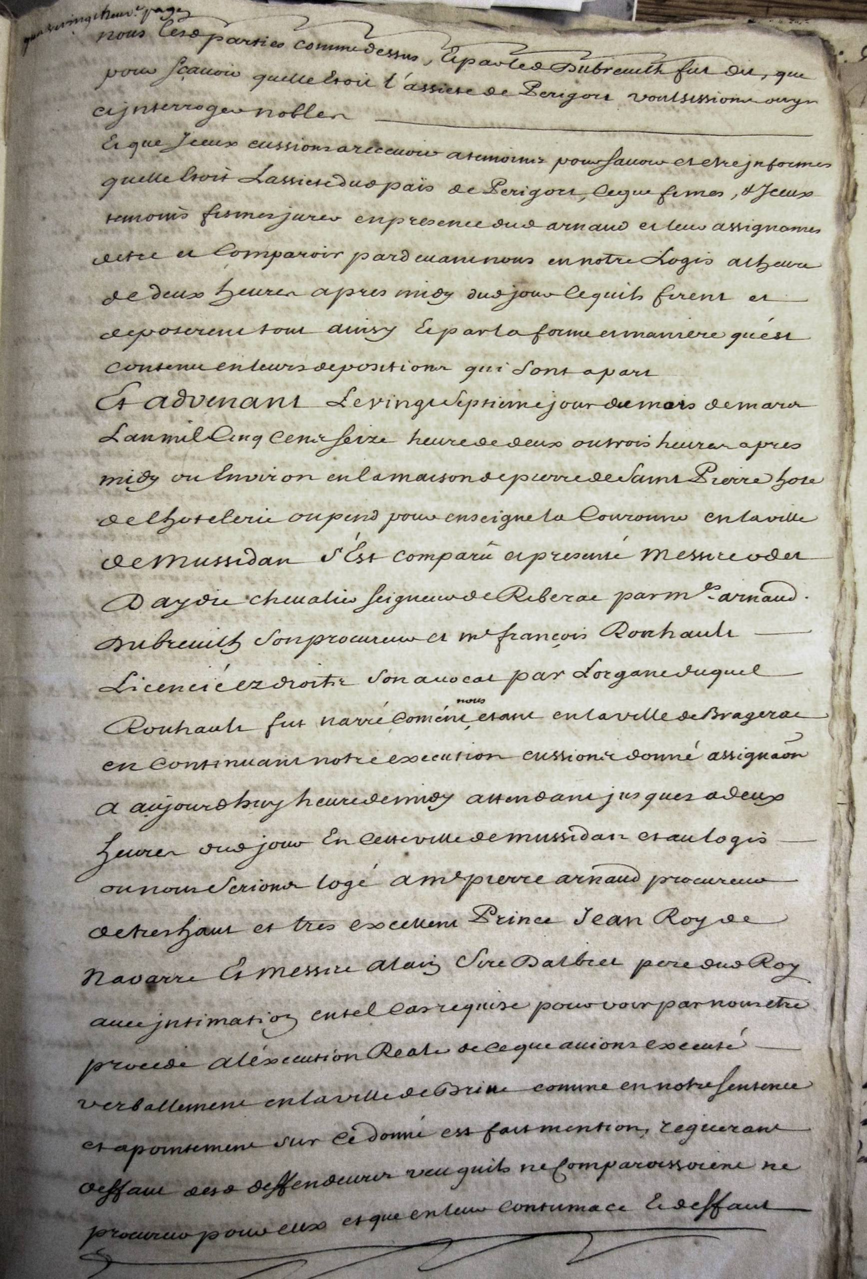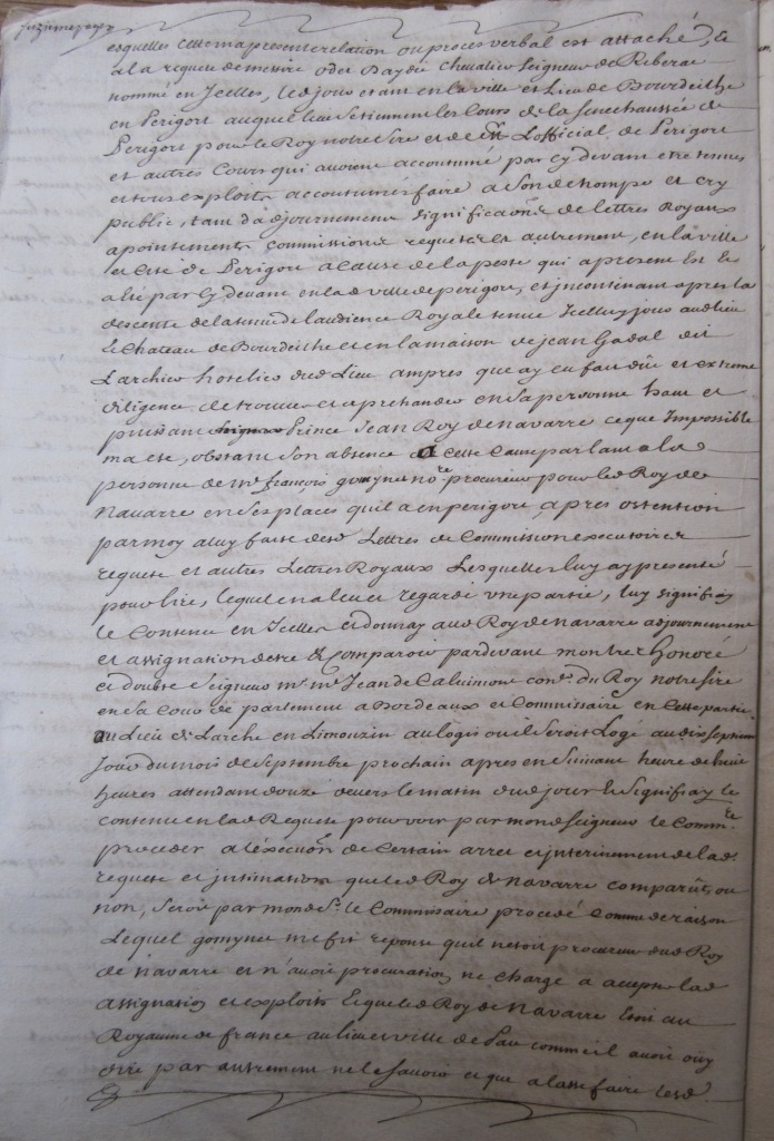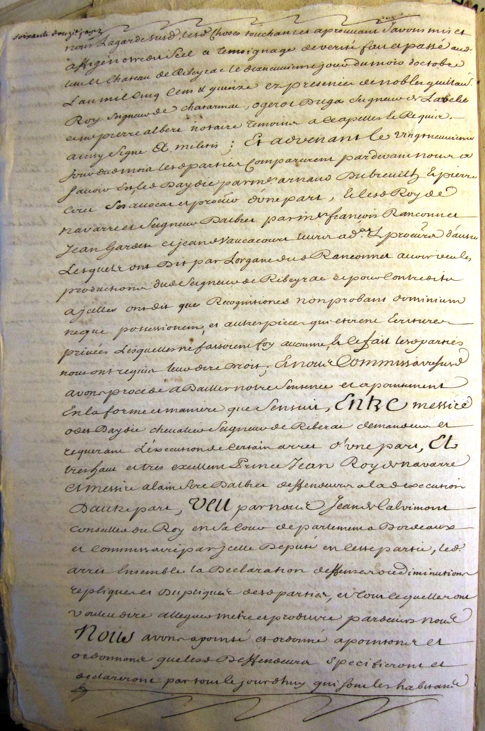 Procès-verbal d'exécution d'un arrêt rendu par le Parlement de Bordeaux entre Odet d'Aydie, seigneur de Ribérac, et Jean, roi de Navarre