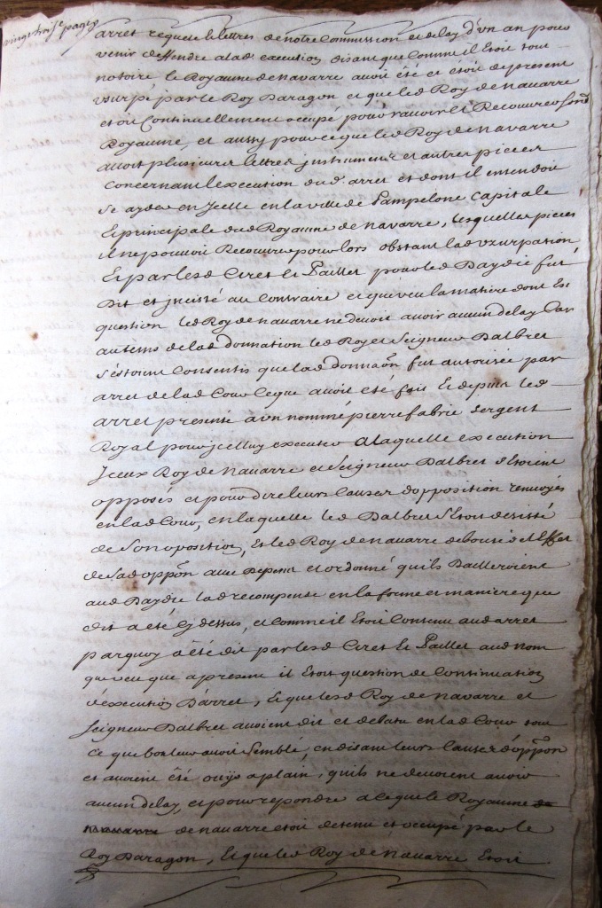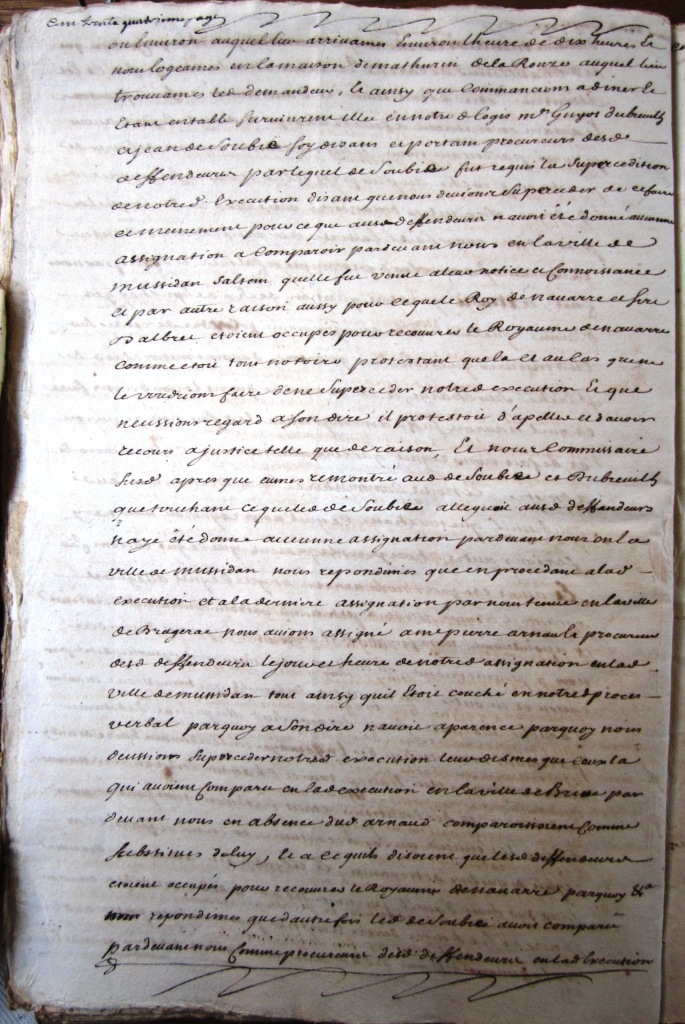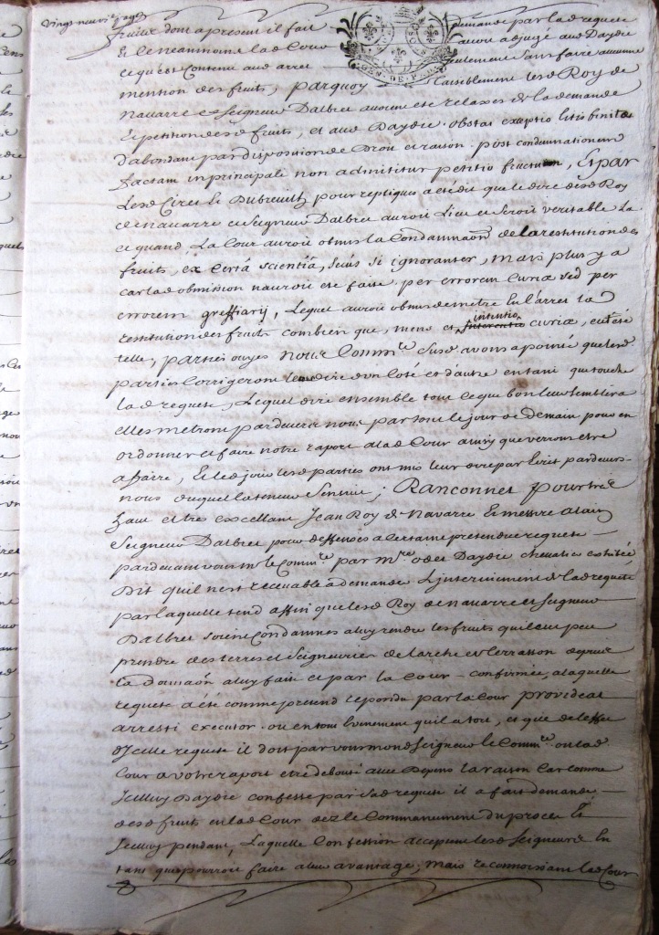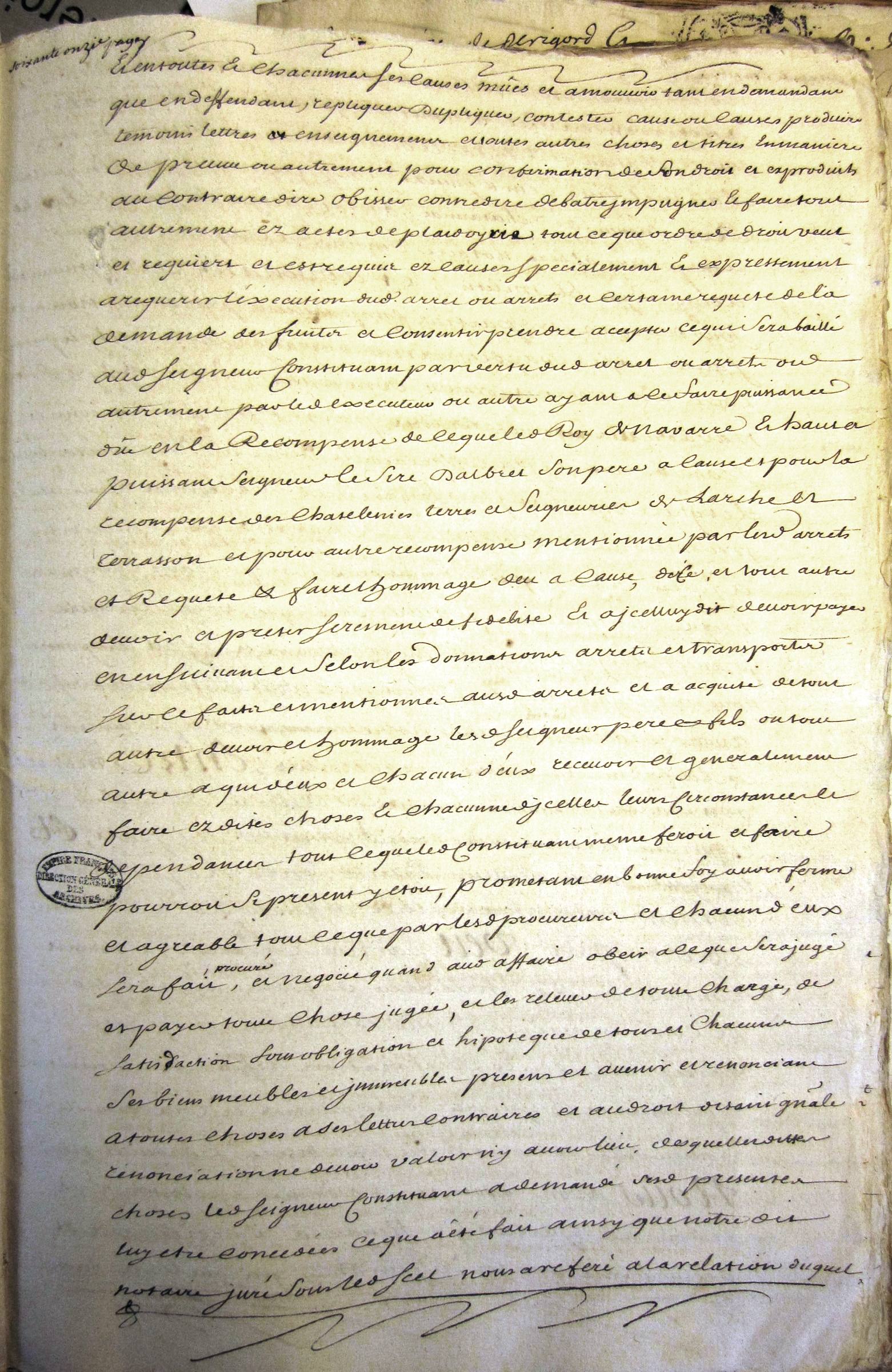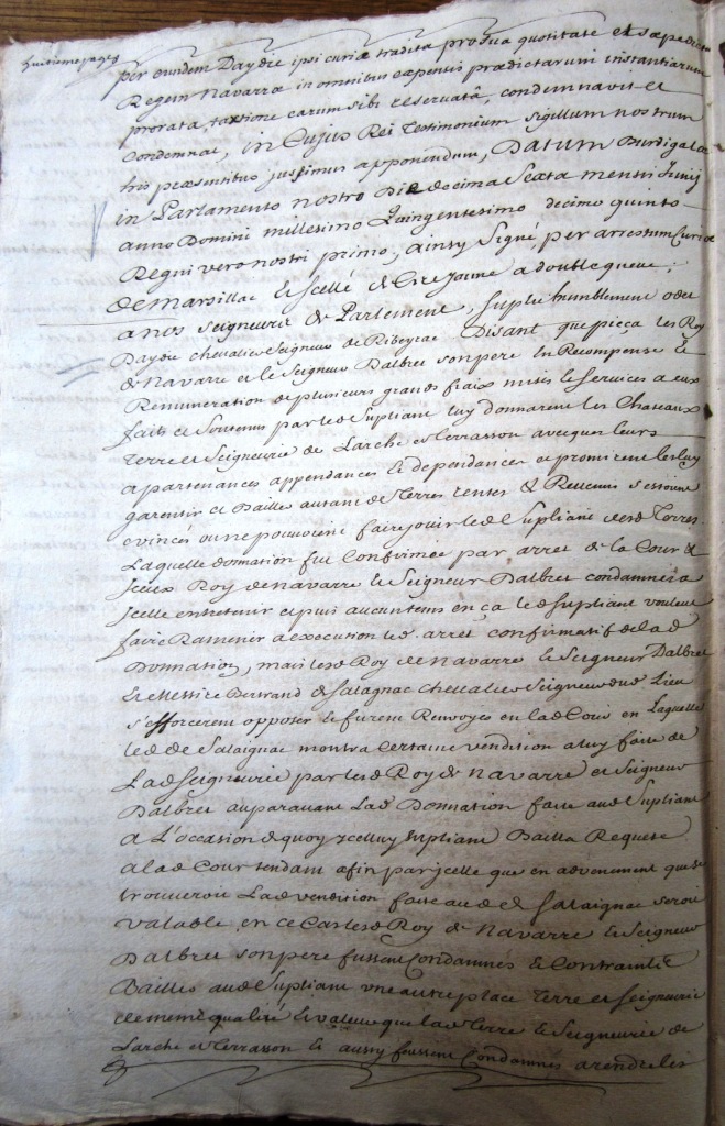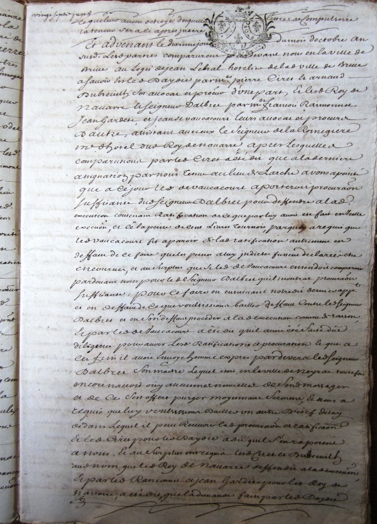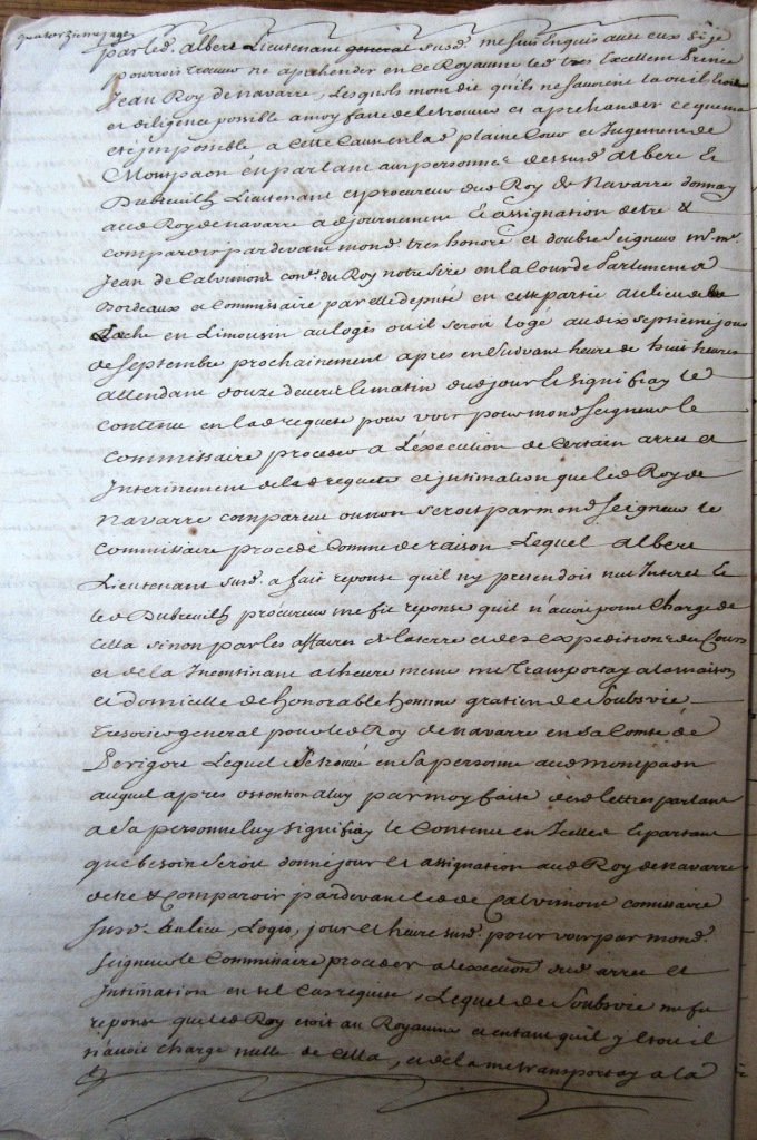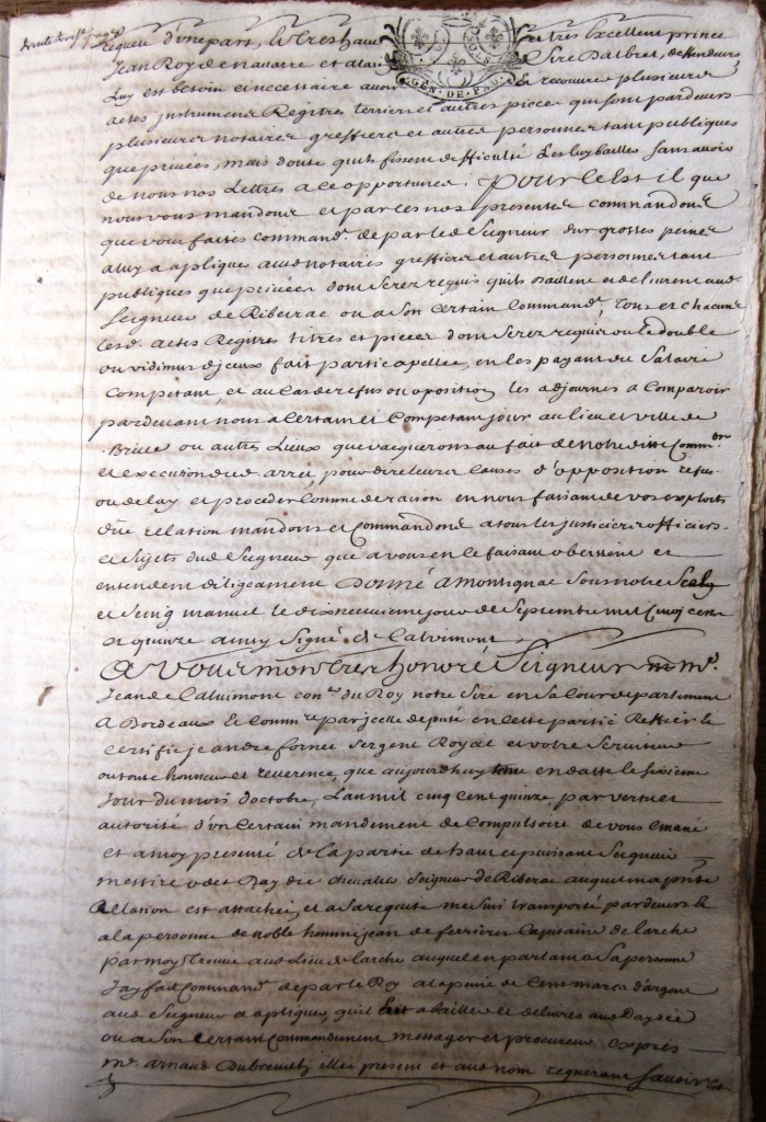 Procès-verbal d'exécution d'un arrêt rendu par le Parlement de Bordeaux entre Odet d'Aydie, seigneur de Ribérac, et Jean, roi de Navarre