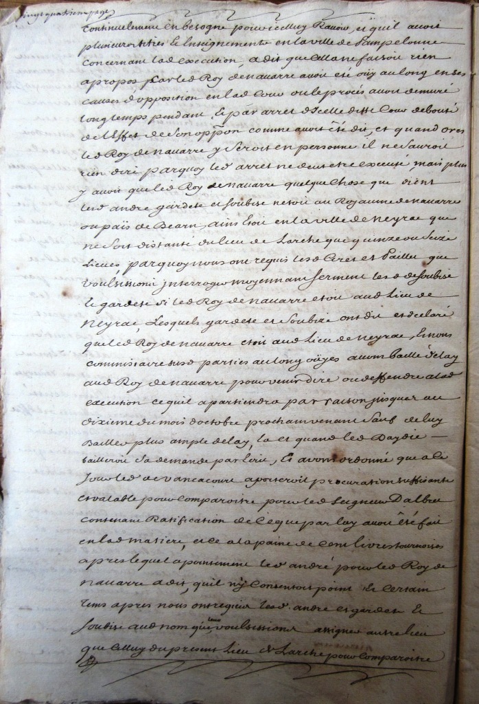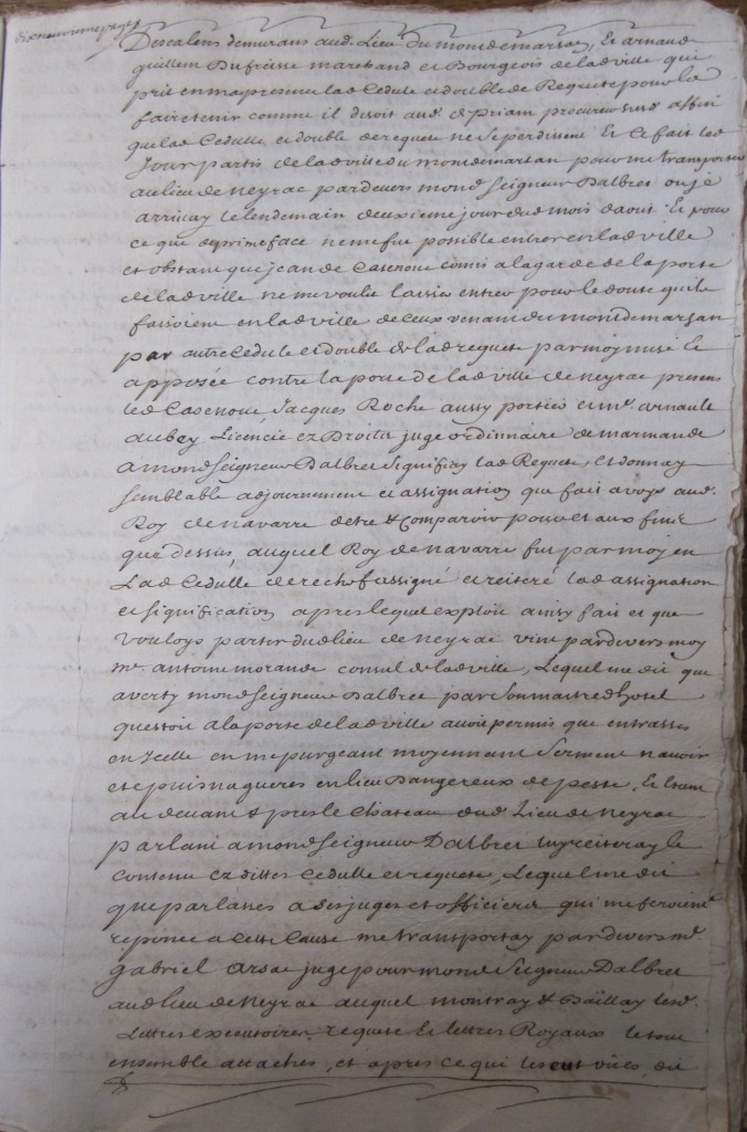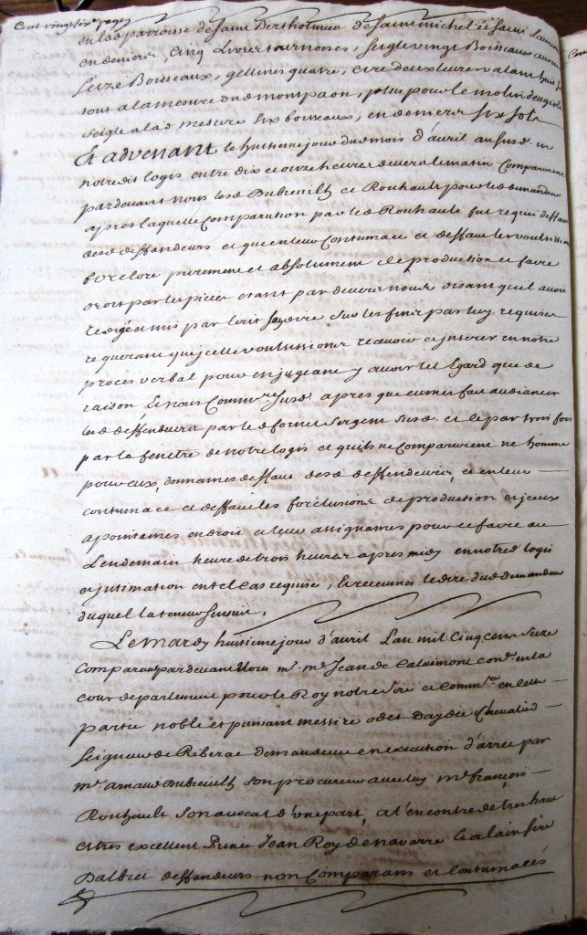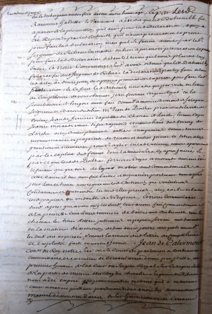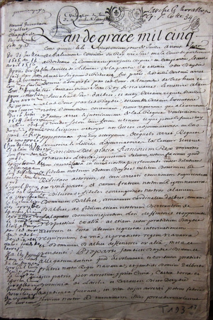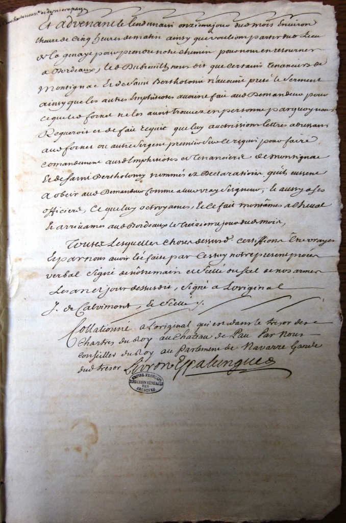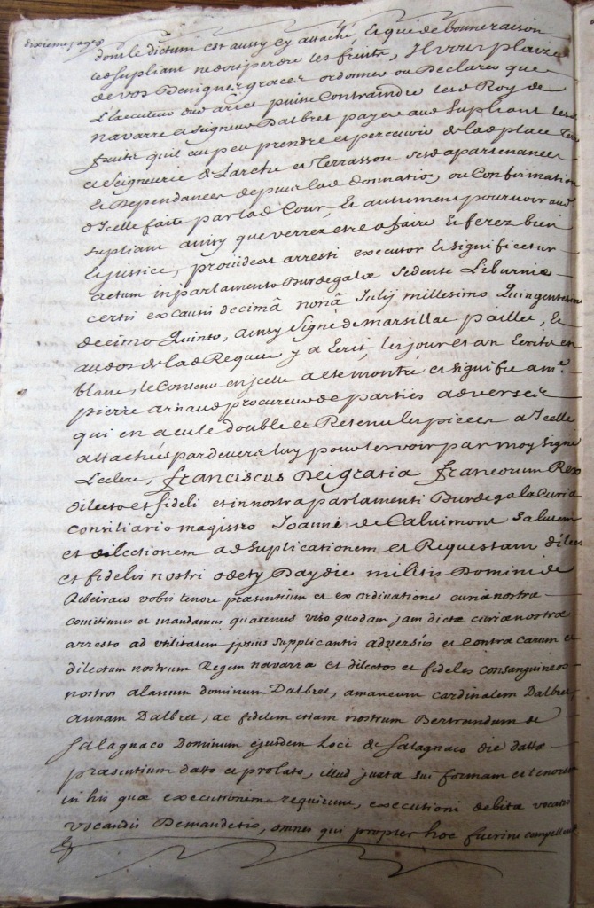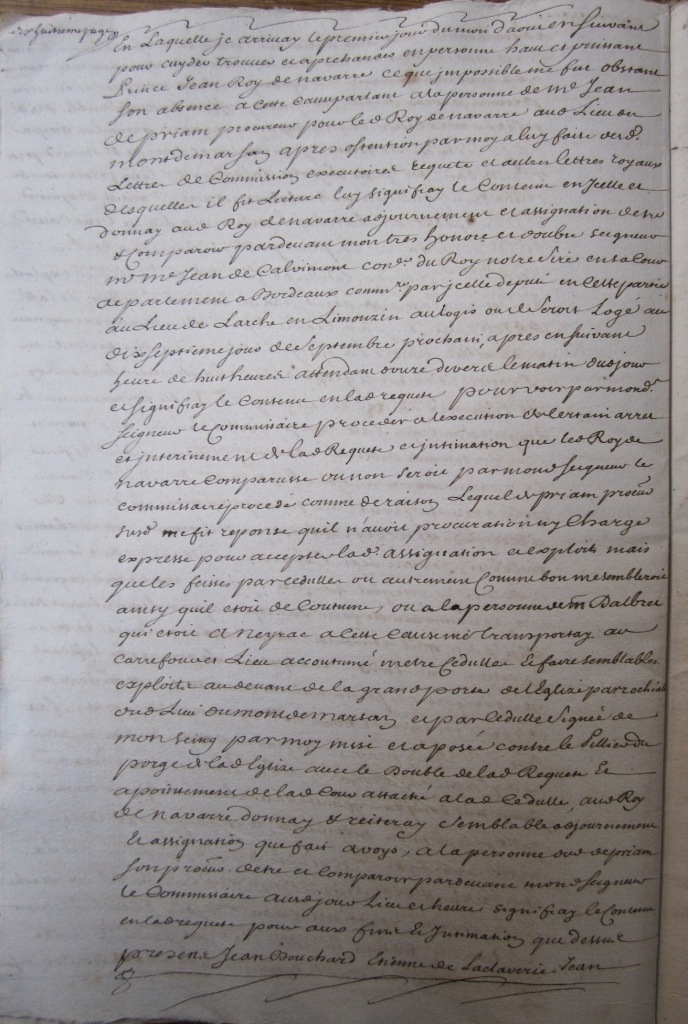 Procès-verbal d'exécution d'un arrêt rendu par le Parlement de Bordeaux entre Odet d'Aydie, seigneur de Ribérac, et Jean, roi de Navarre
