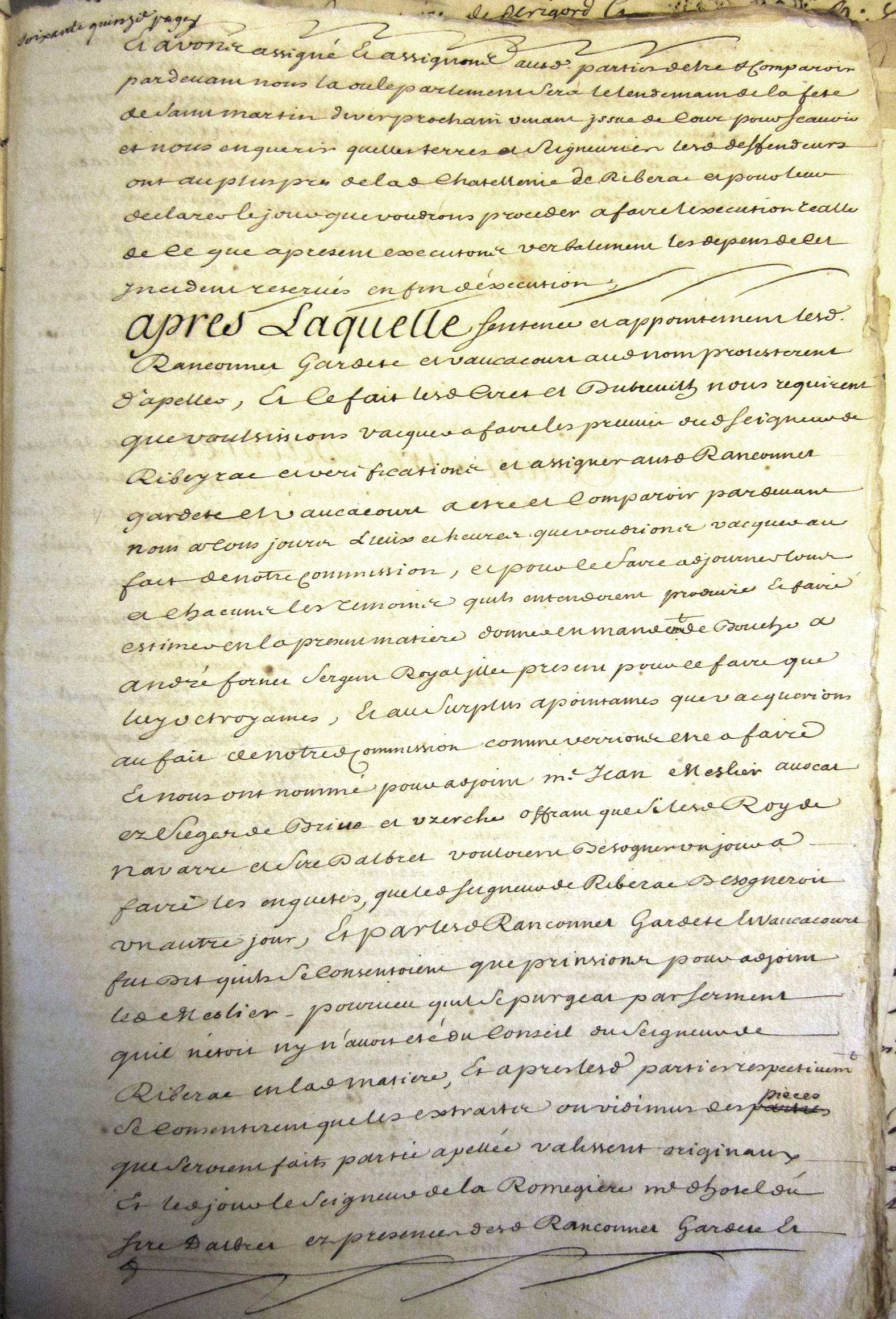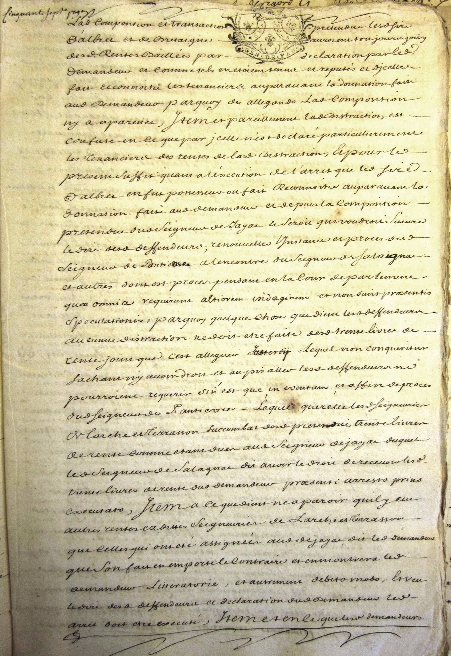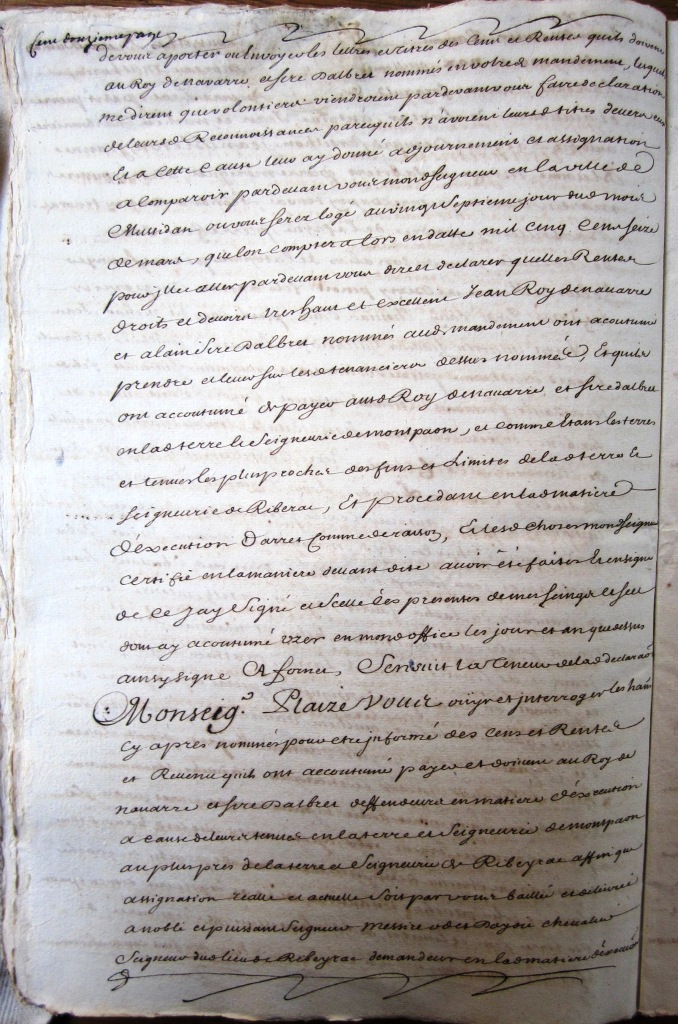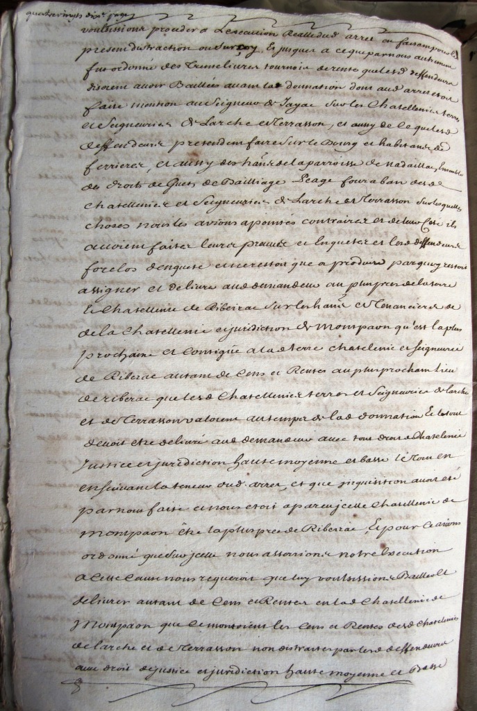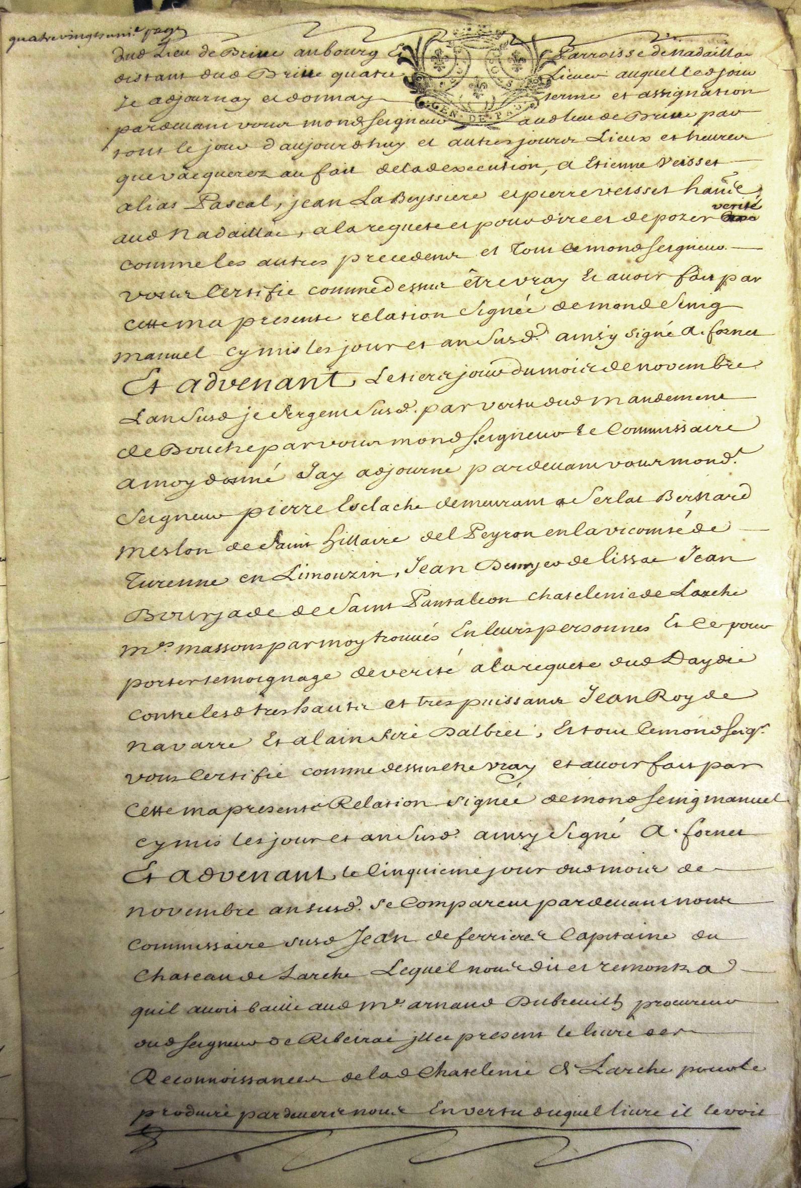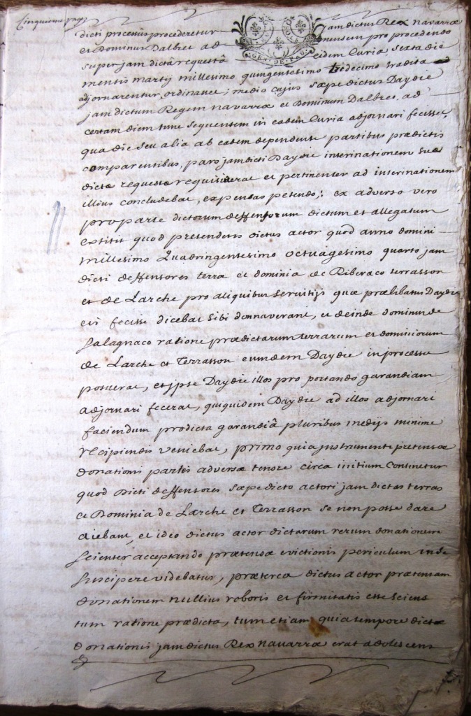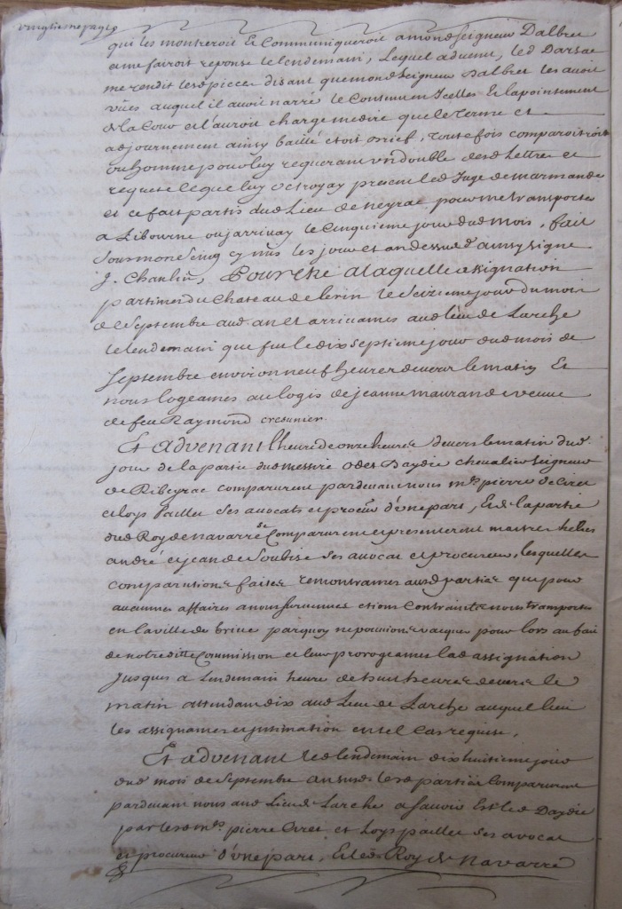 Procès-verbal d'exécution d'un arrêt rendu par le Parlement de Bordeaux entre Odet d'Aydie, seigneur de Ribérac, et Jean, roi de Navarre