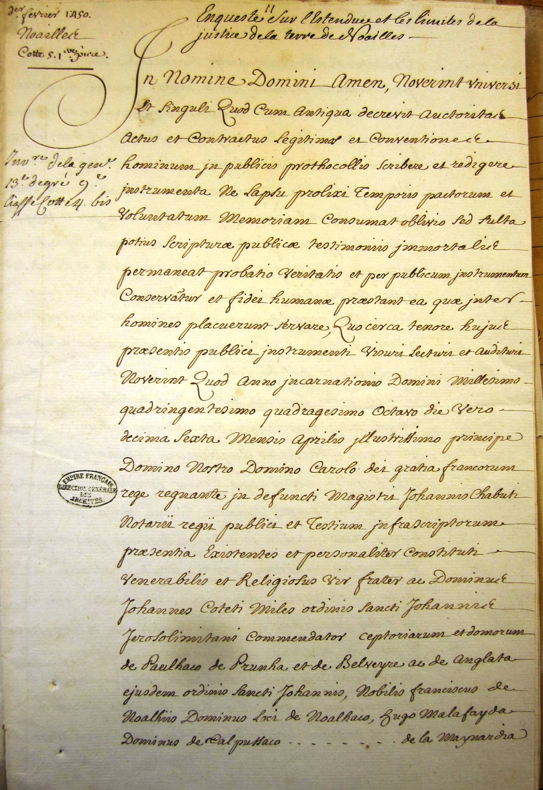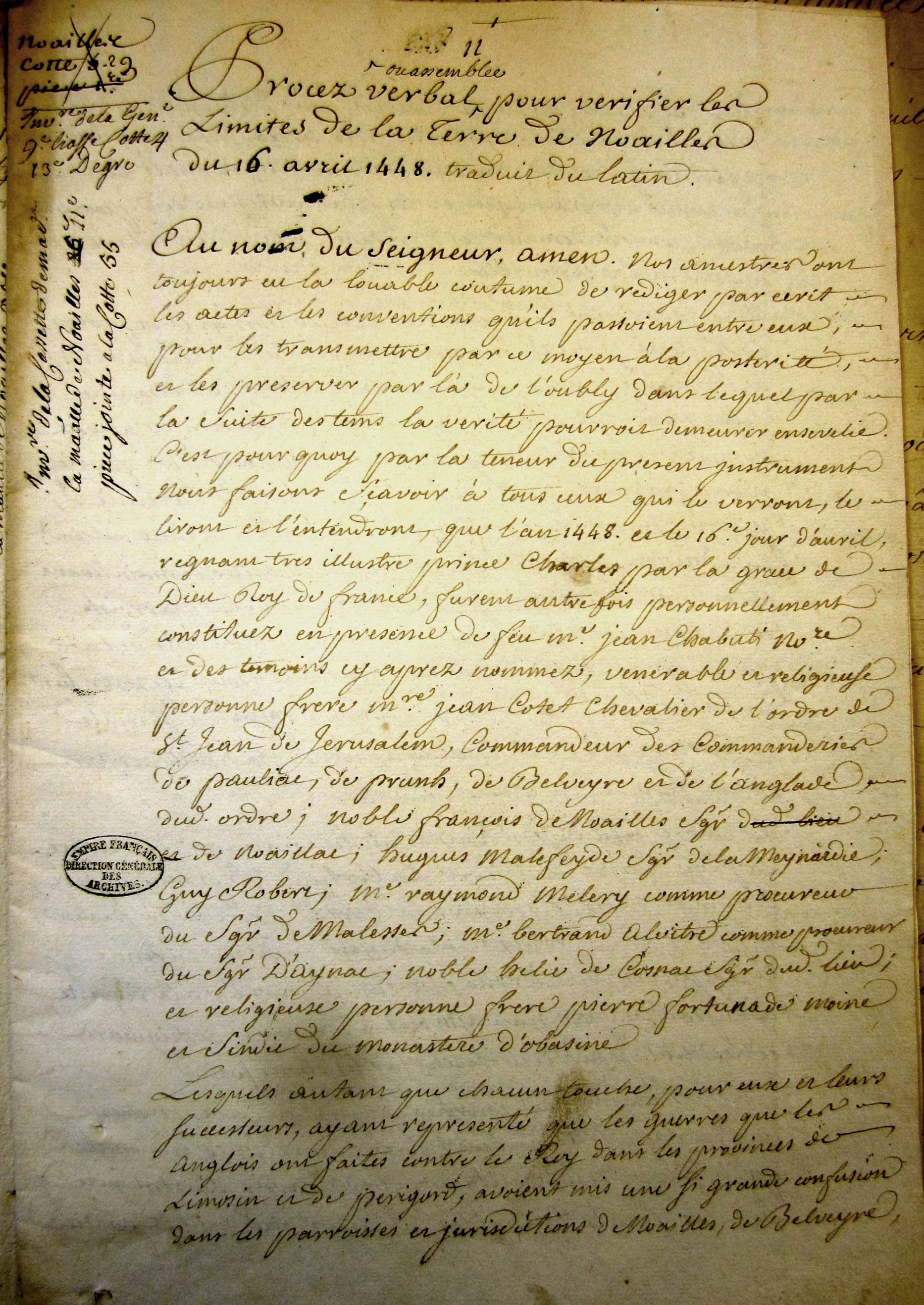 Mémoire et enquête sur les limites de la terre de Noailles à la fin de la guerre de Cent Ans (1448 - 1450)