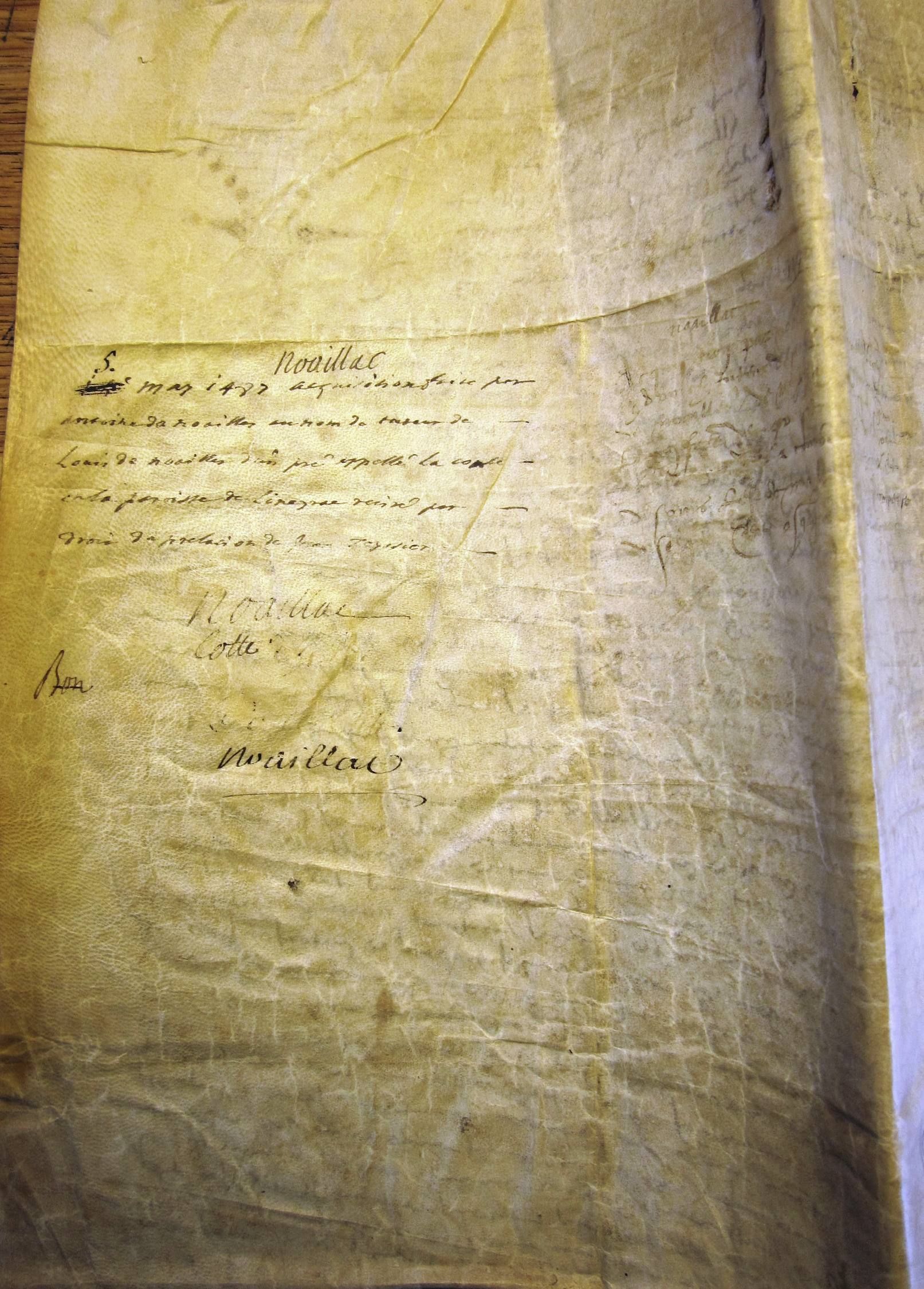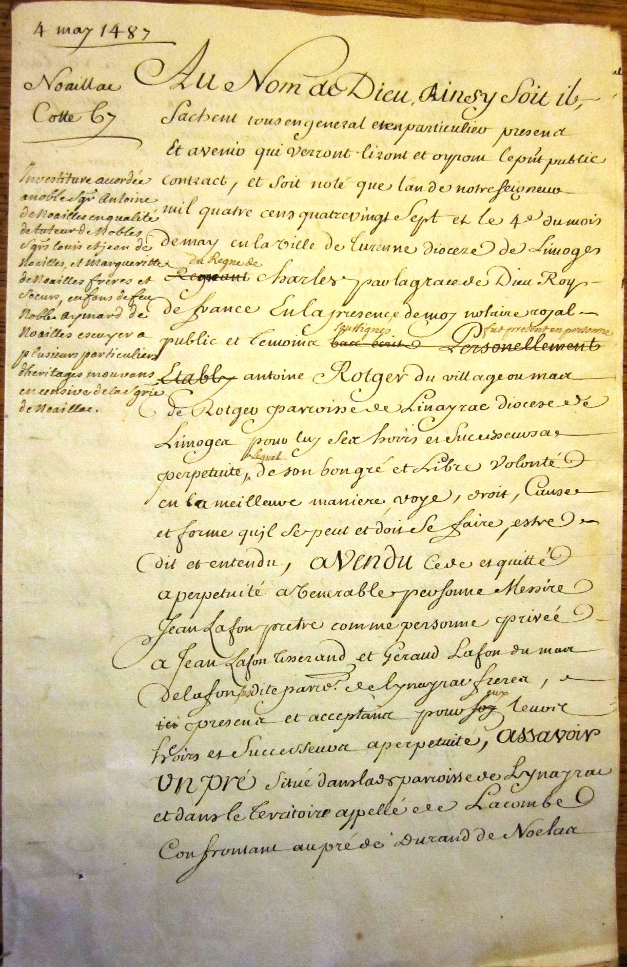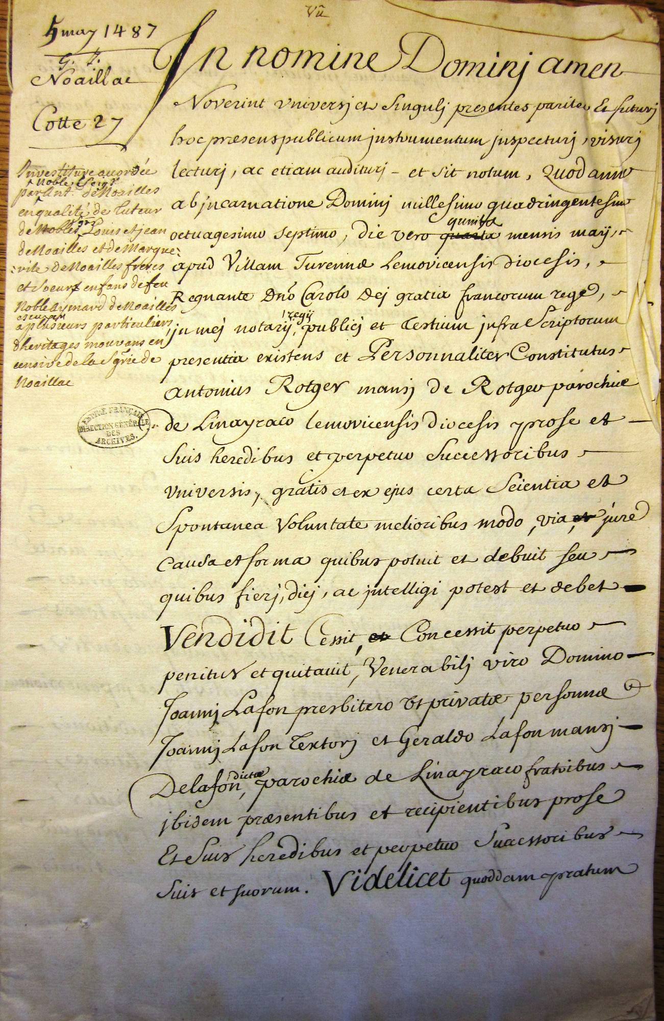 Antoine de Noailles, tuteur des enfants d'Aymar de Noailles, accorde son investiture pour la vente de biens à Noailhac (1487)
