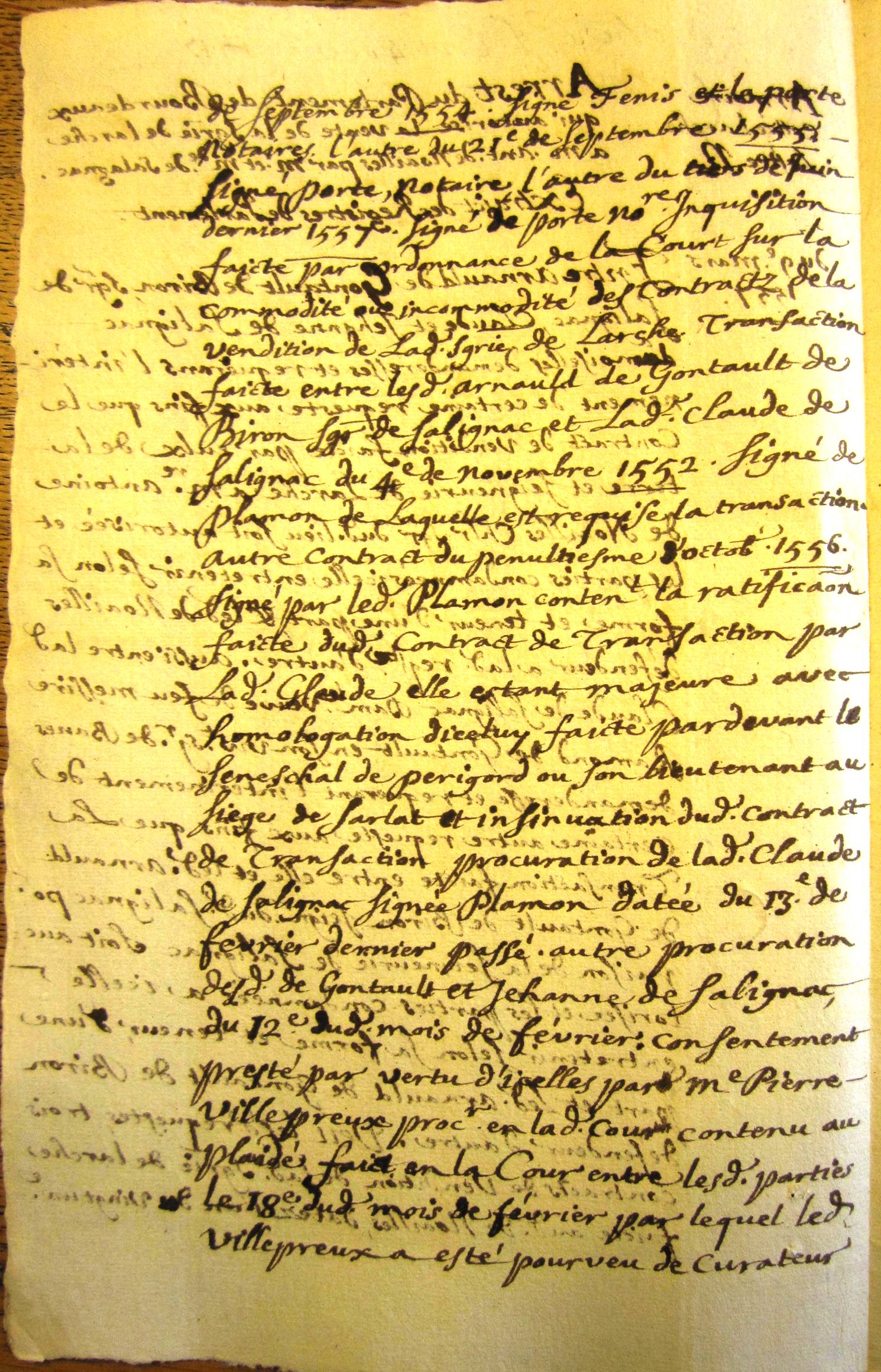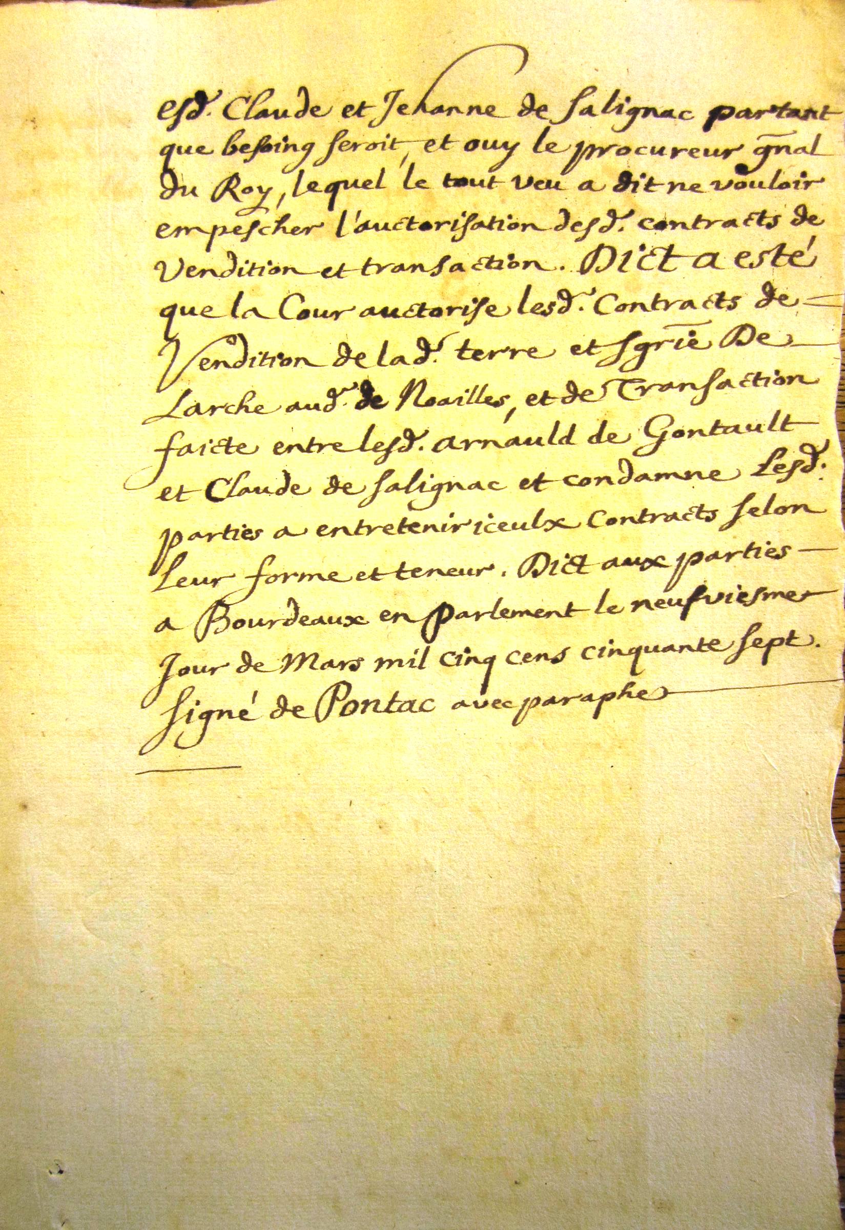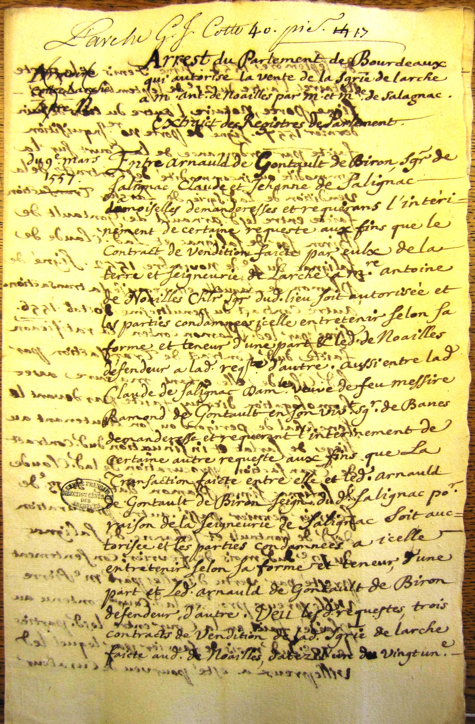 Arrêt du parlement de Bordeaux qui autorise la vente des seigneuries de Larche et Terrasson par Claude et Jeanne de Salignac à Antoine de Noailles (9 mars 1557)
