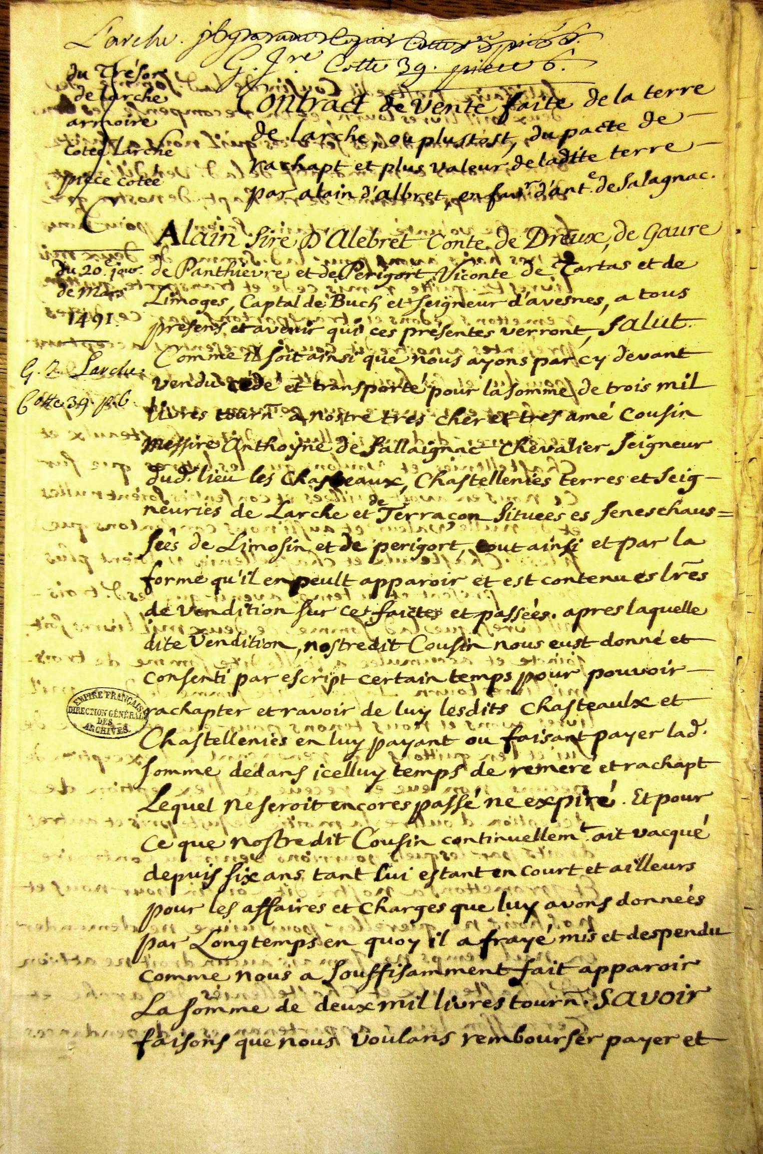 Contrat de vente du pacte de rachat et plus valeur de la terre de Larche par Alain d'Albret en faveur d'Antoine de Salignac (20 mars 1491)