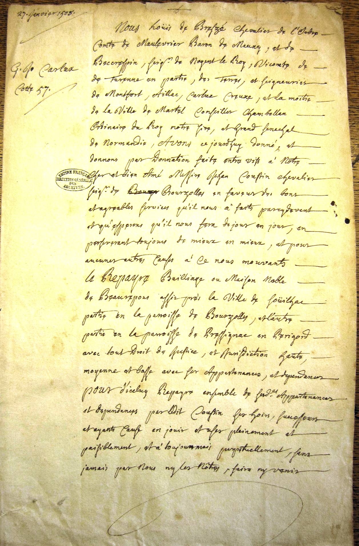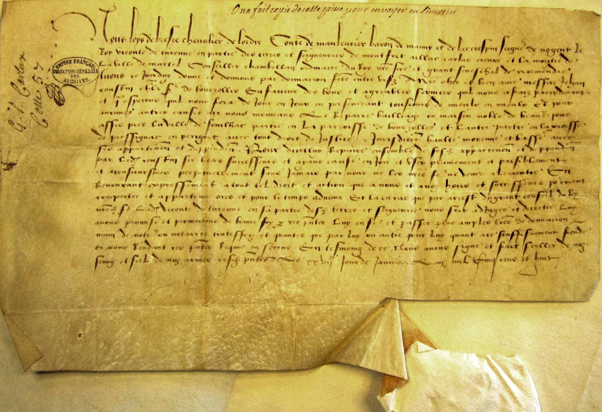 Remarque : manuscrit authentique en parchemin avec sceau, suivi de la transcription 18ème de cet acte.
