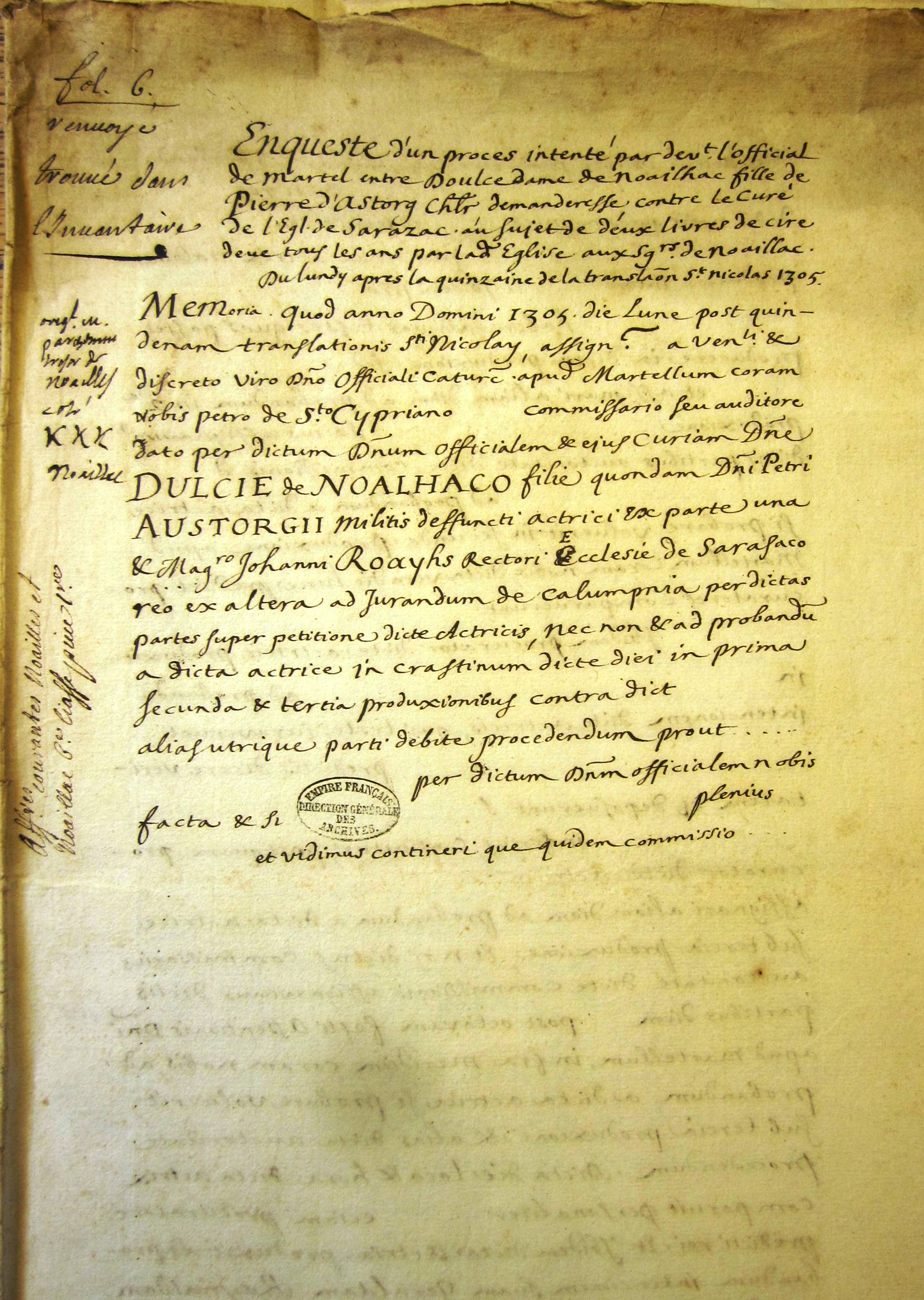 Enquête contre le curé de Sarrazc à propos de 2 livres de cire dues au sgrs de Noailles (1305)