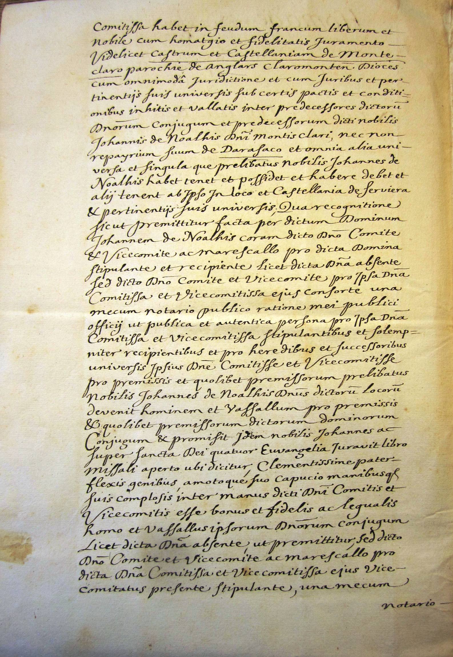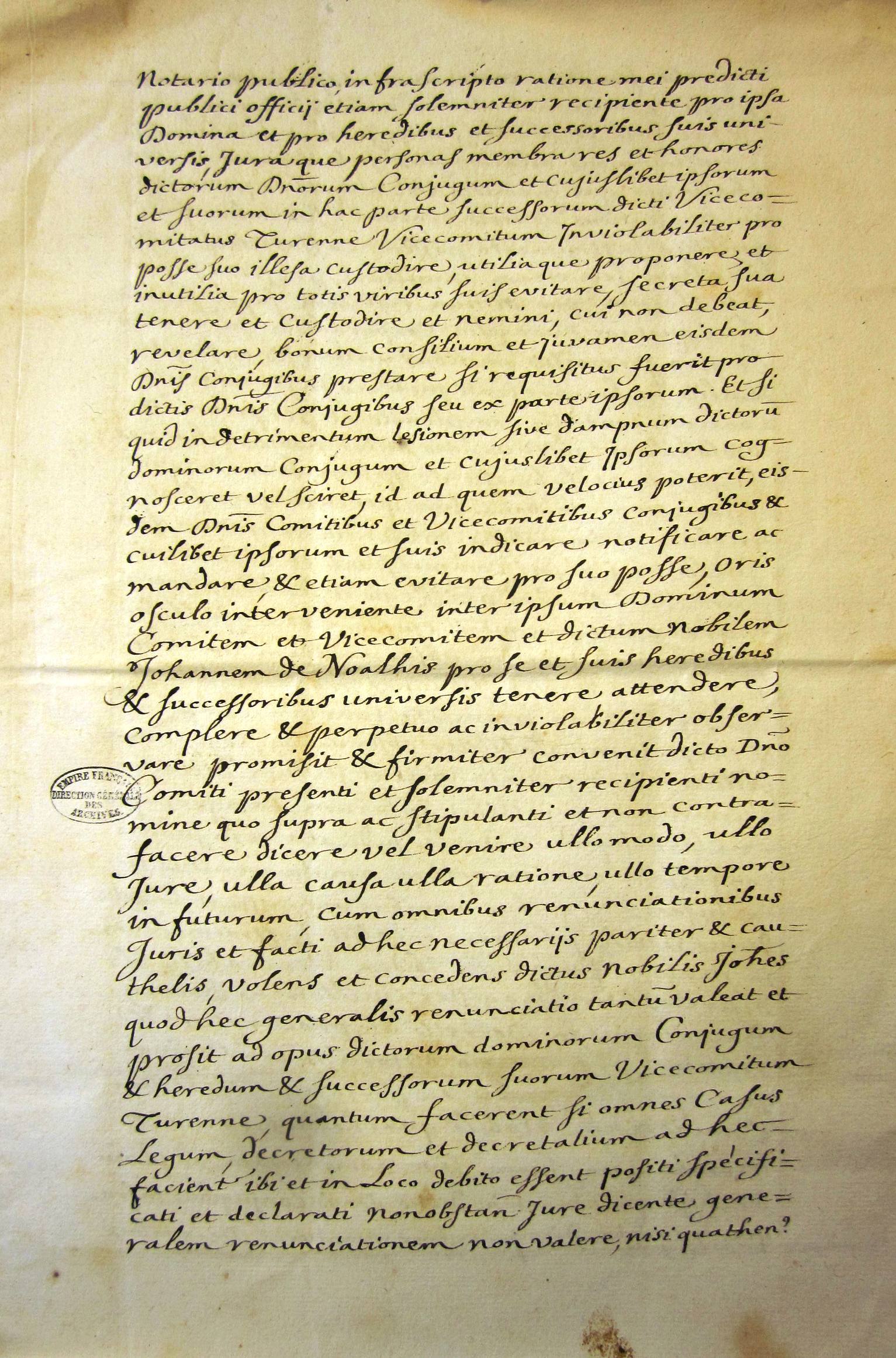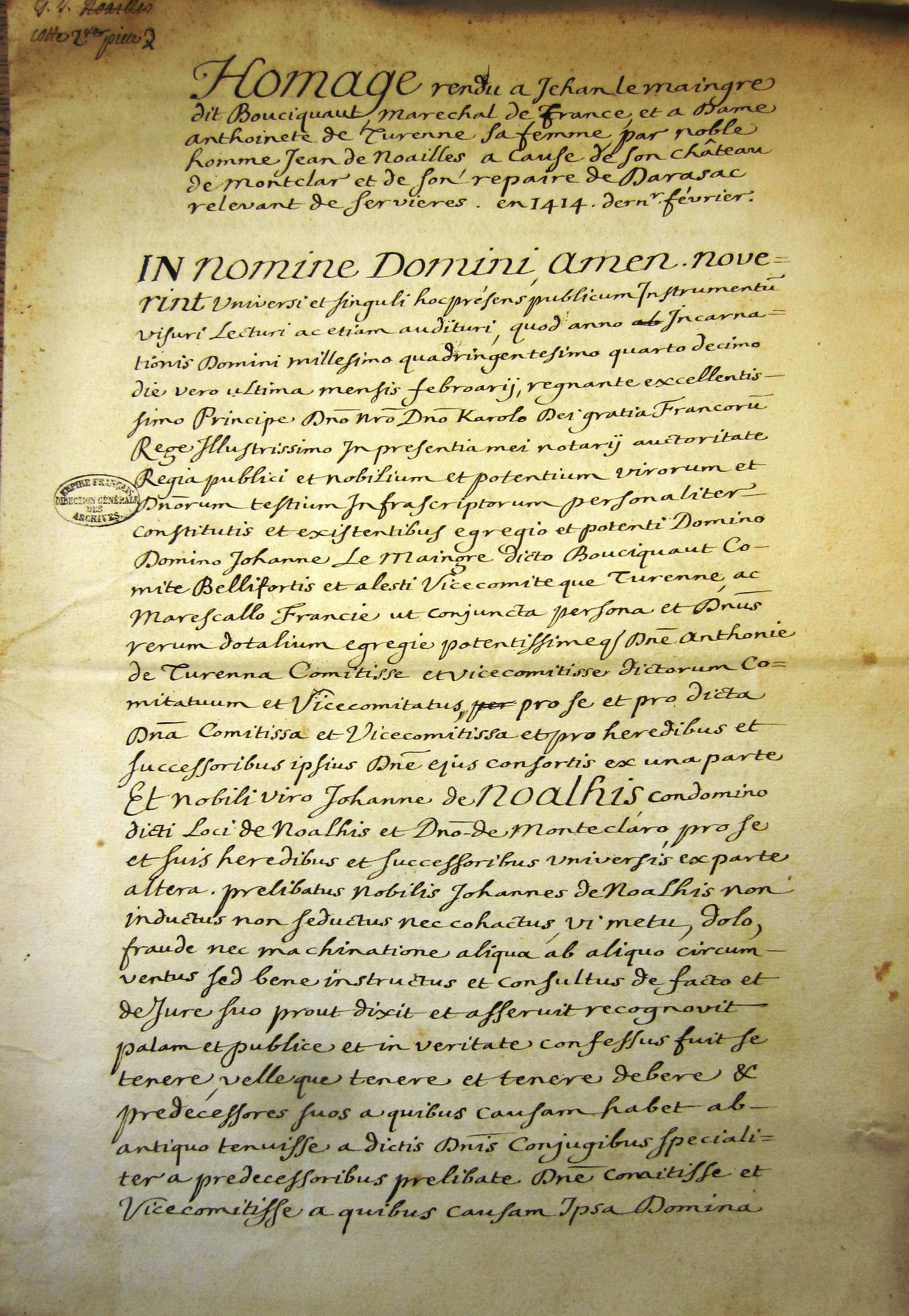 Jean de Noailles se reconnait féal de Jean le Meingre dit Boucicaut, époux d'Antoinette de Turenne et lui rend hommage (février 1414 (v.st))