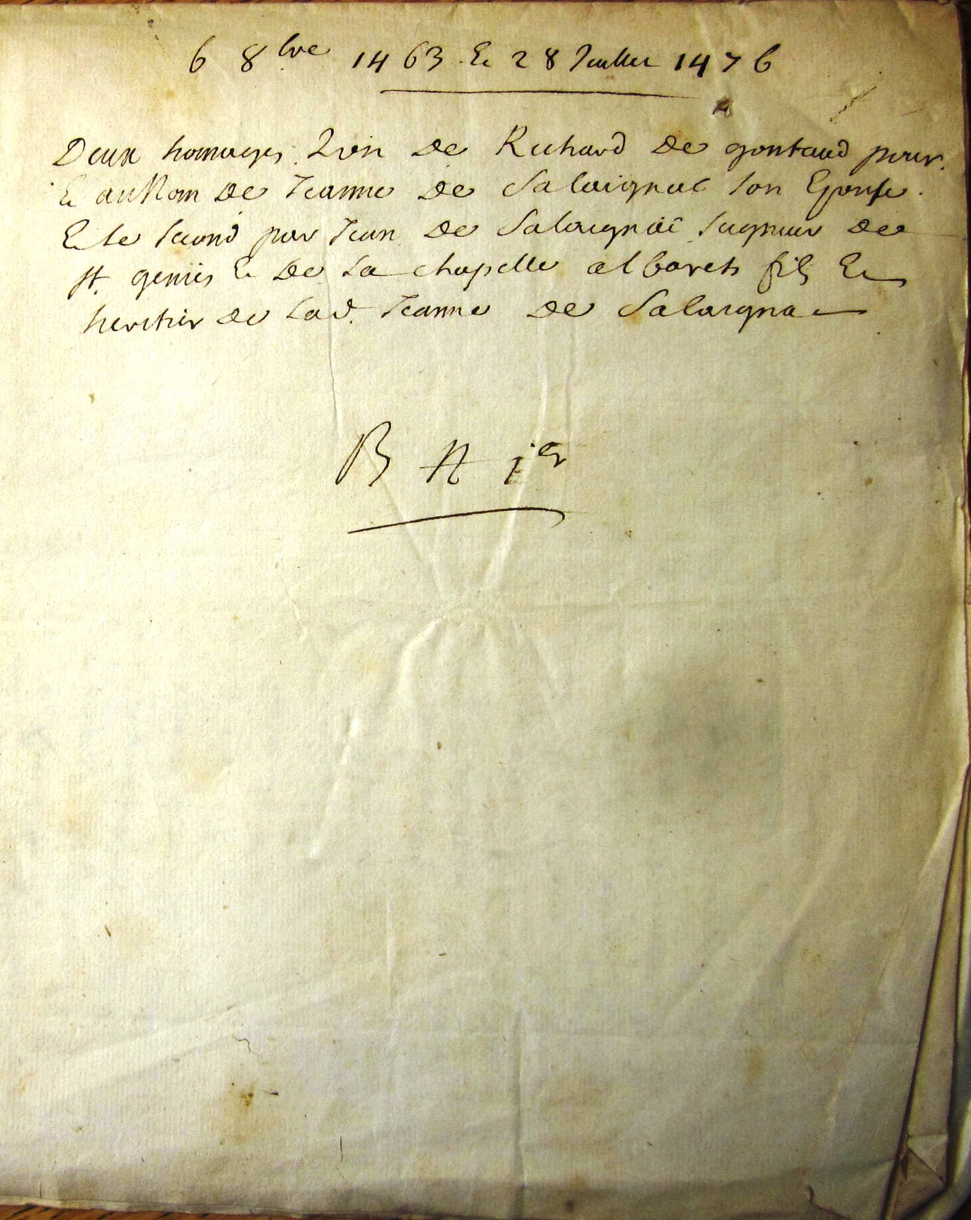 Hommage de Jean de Salaignac, seigneur de St Geniès et de la Chapelle-Albarelh fils et héritier de Jeanne de Salaignac (1476)