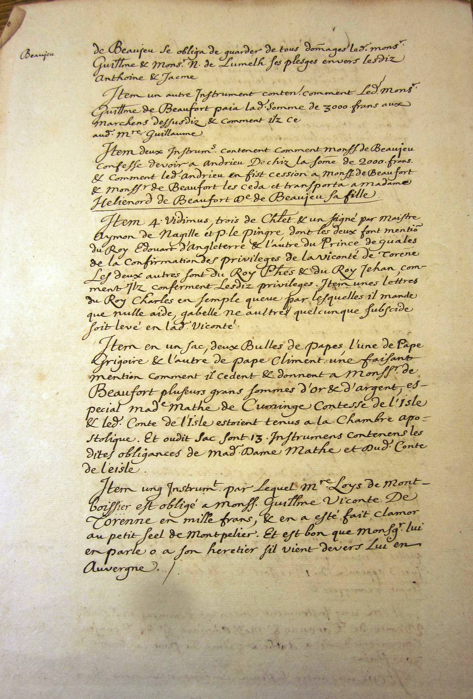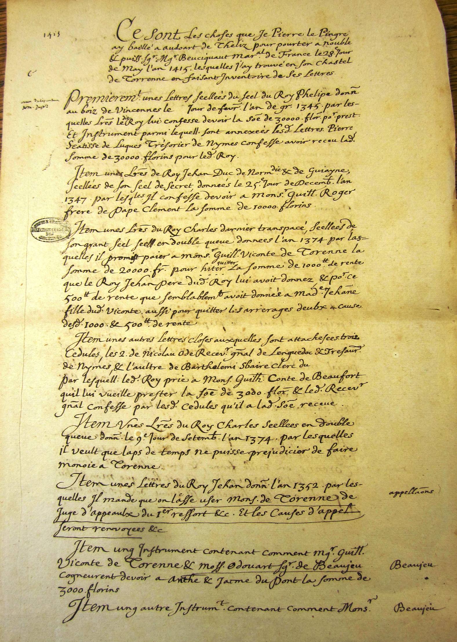 Inventaire de titres trouvés au château de Turenne à l'attention du maréchal Boucicaut (actes du 14ème siècle)