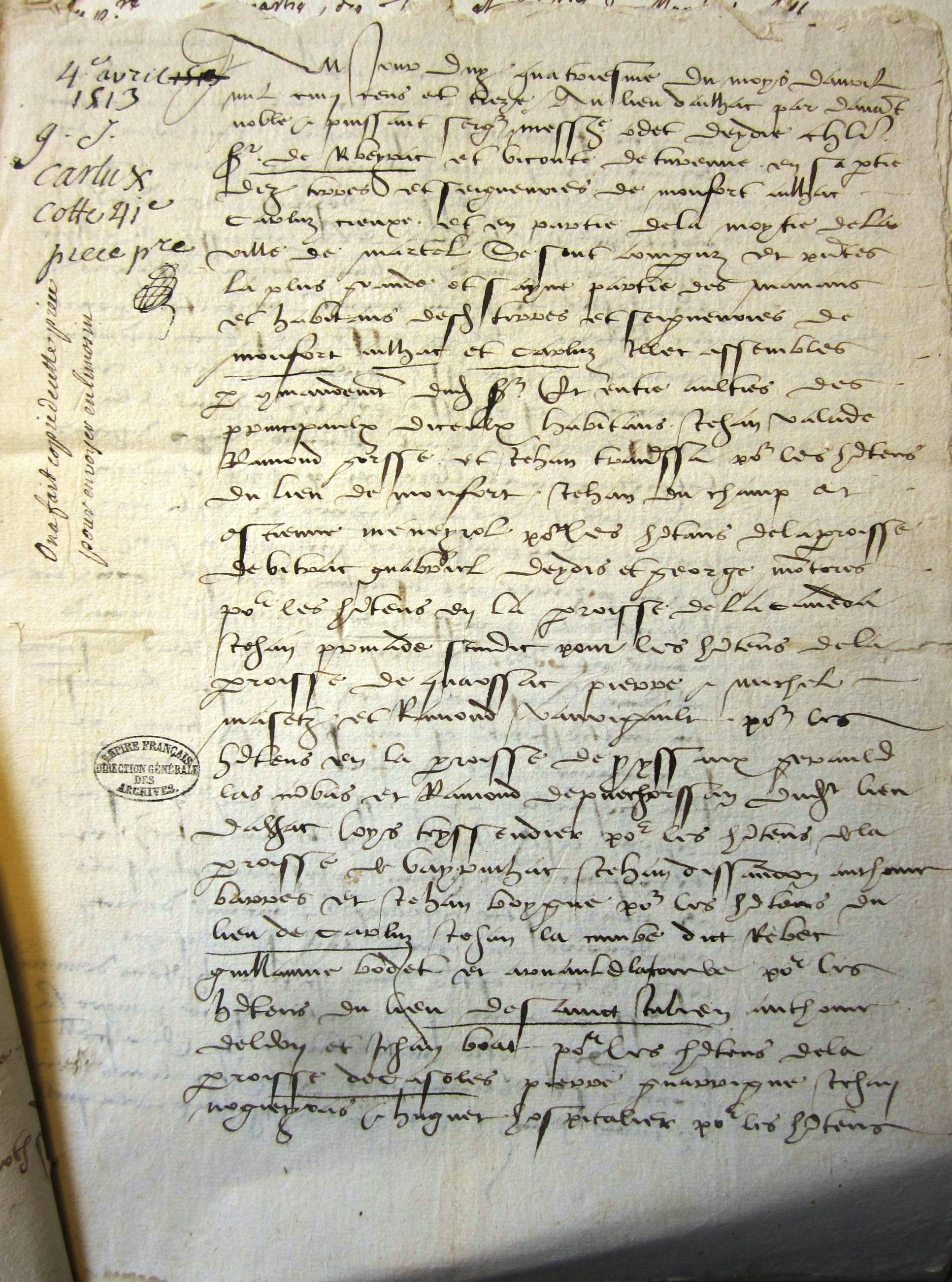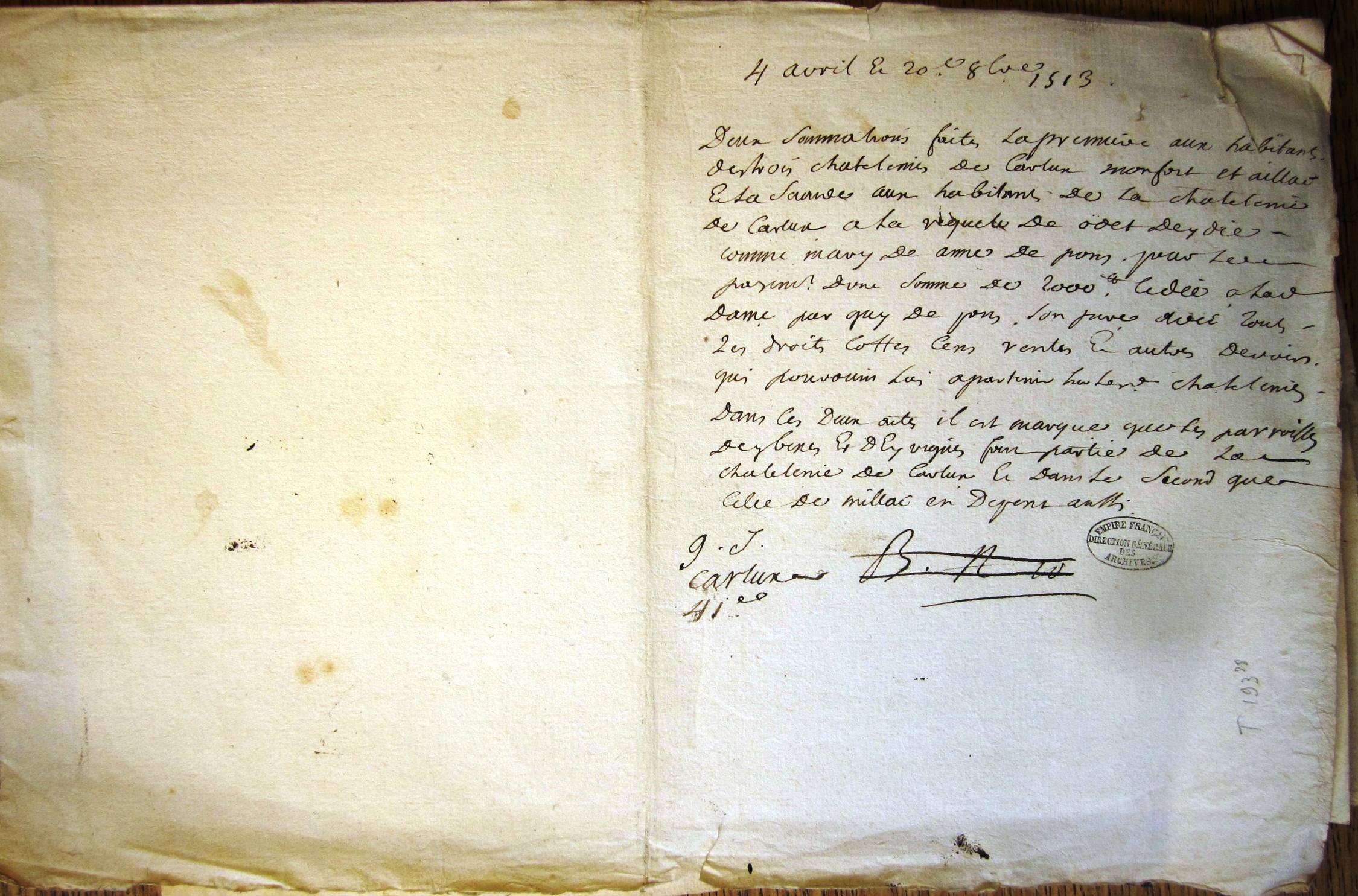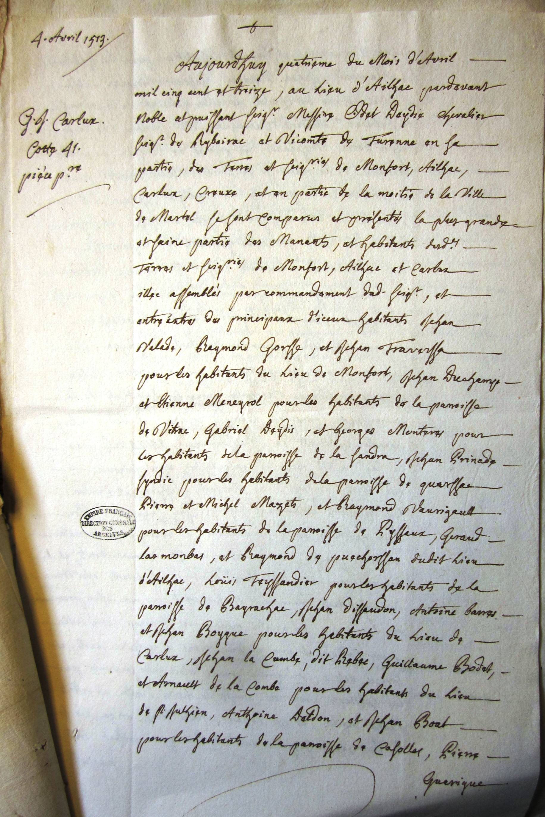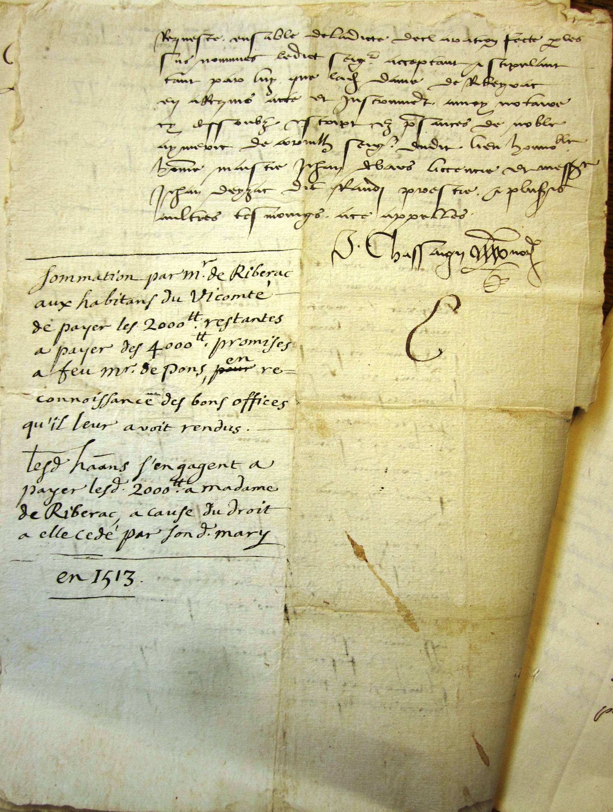 Sommation aux habitants de la vicomté de Turenne d'avoir à payer au seigneur de Ribérac le reste de la somme promise au feu seigneur de Pons (4 avril 1513 (v. st.)).