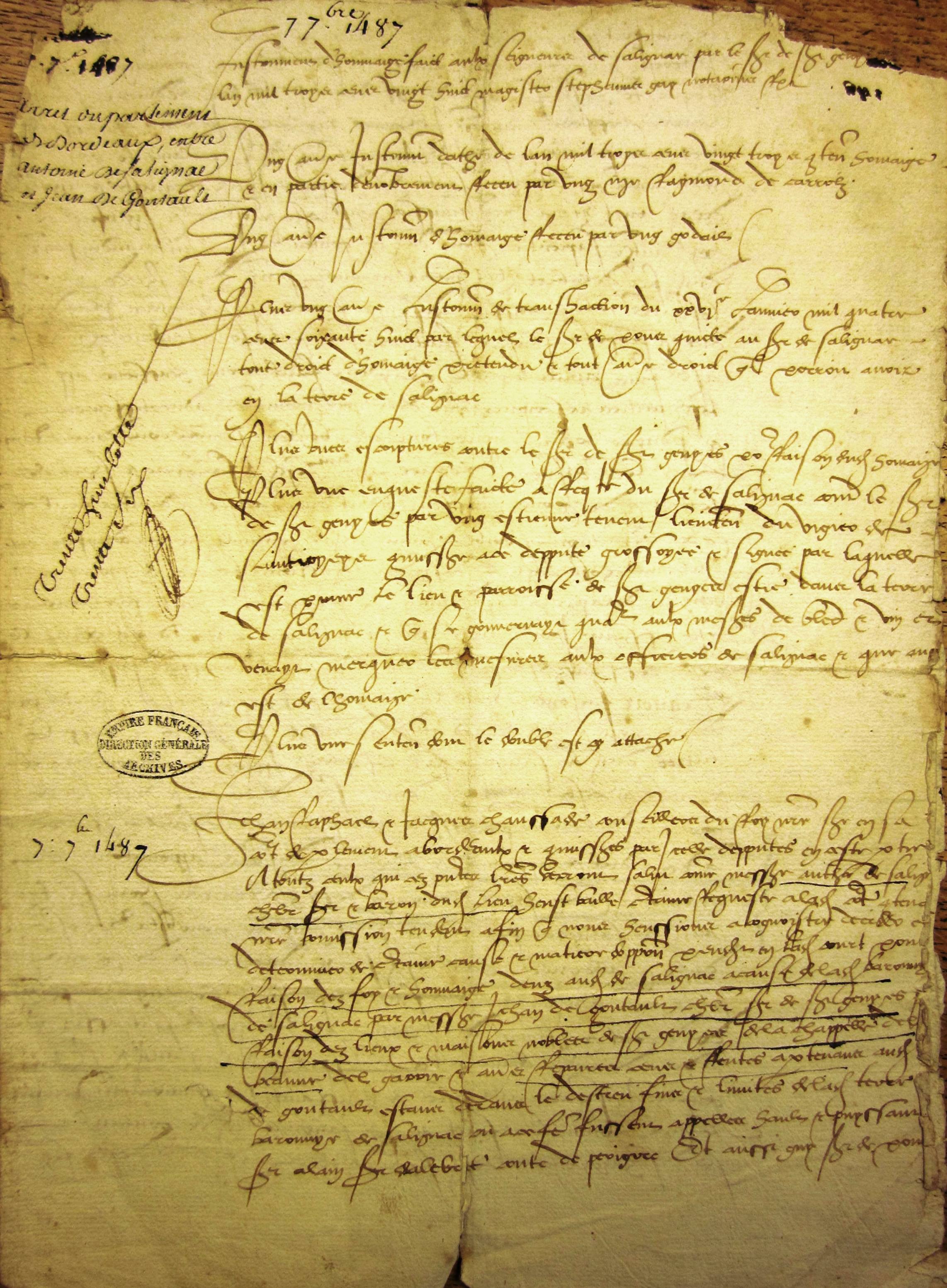 Arrêt du Parlement de Bordeaux entre Antoine de Salaignac et Jean de Gontault ( 7 sept. 1487) (mss. papier).