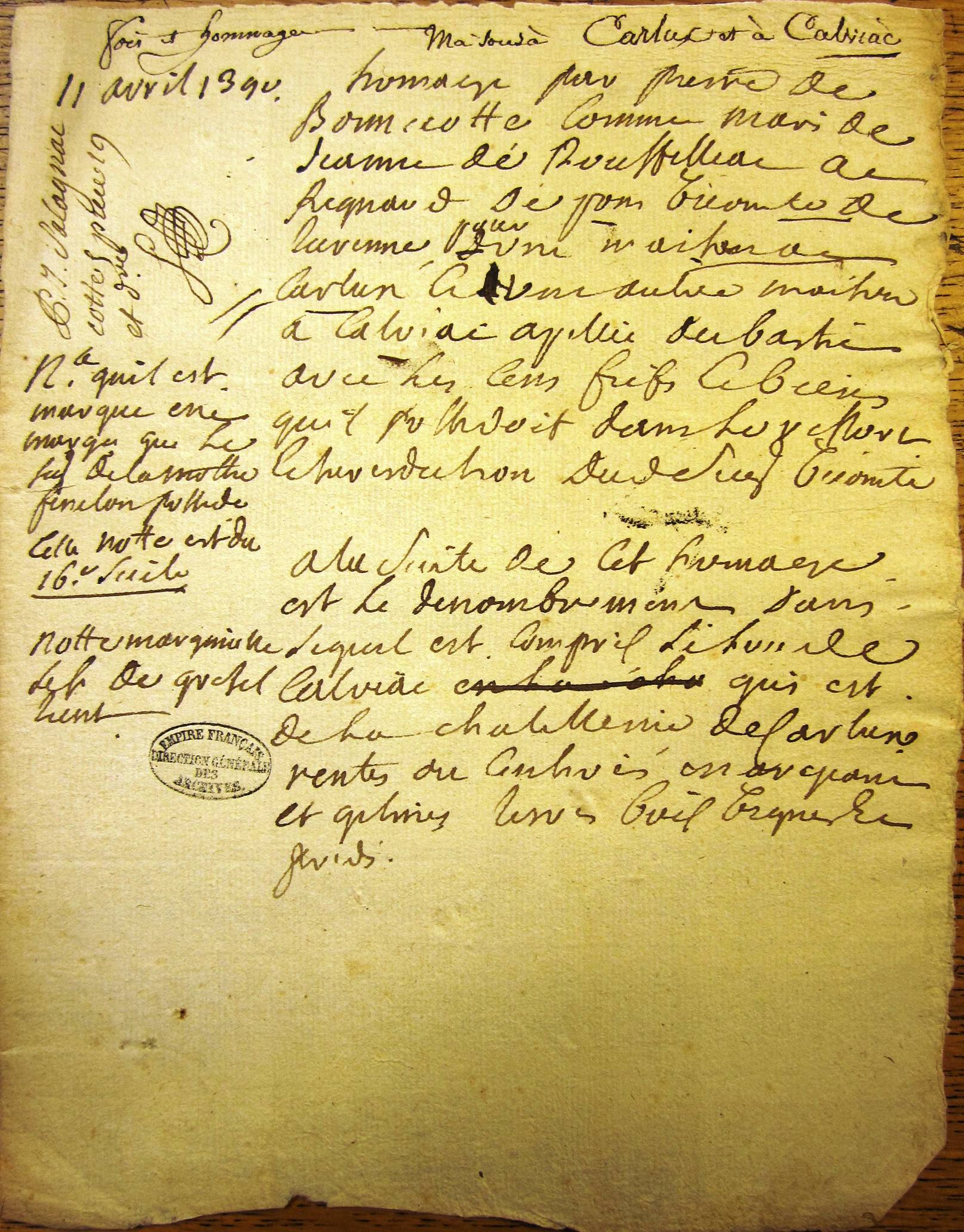 Hommage à Regnaud VI de Pons vicomte de Turenne pour des biens à Carlux et Salviac (1390)