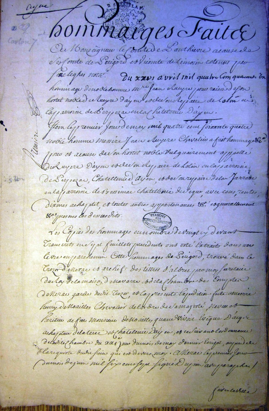Hommages à Jean de Bretagne, comte de Penthièvre, comte de Périgord et vicomte de Lymoges pour la terre d'Ayen (1451)