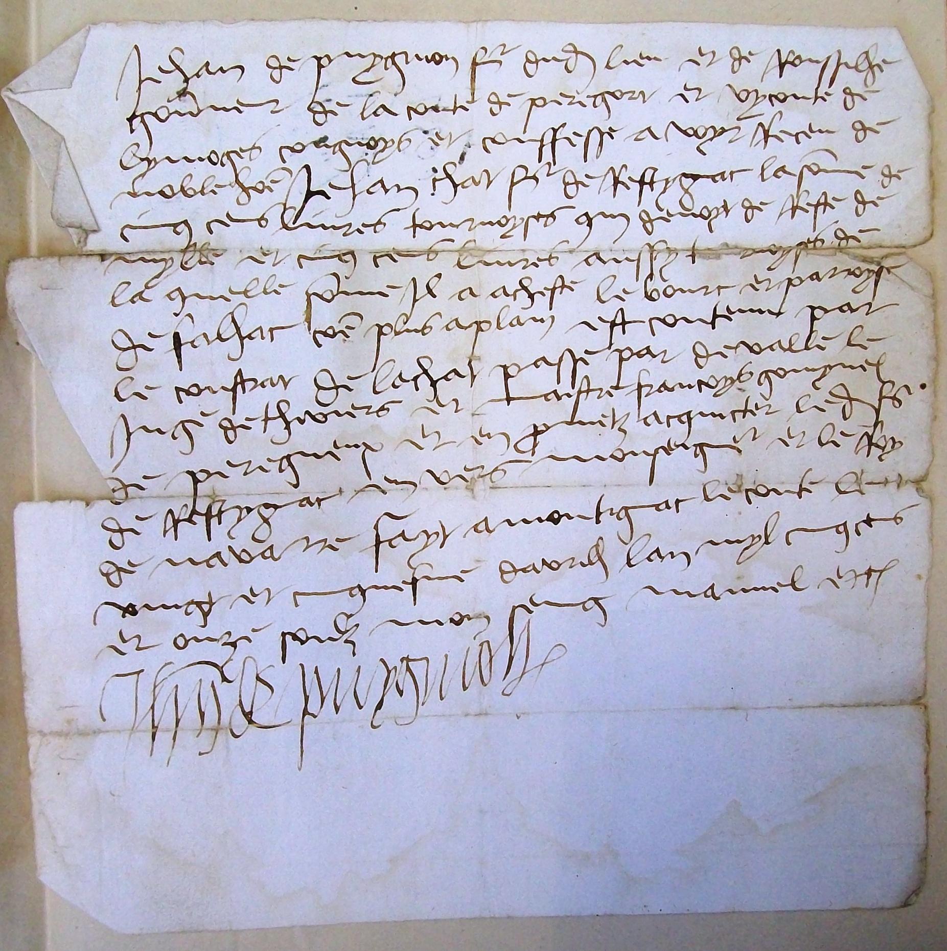 villam petragoricensem pro compellendae habitatores ejusdem villae ad solvendam collectam eis impositam per majores et consules dictae villae pro solvendo et ad solvendum quamdam financiam quae dicitur facta fuisse per procuratorem ipsorum majoris et consulum cum gentibus dicti domini regis pro recuperatione jurisdictionis consulatus dictae villae et aliis certis de causis dixit et proposuit dicta comitissa … coram praedicto serviente armorum quod praedicti major et consules nullam habebant nec habere consueverant superioritatem nec cognitionem in aliquem seu aliquos de familia sua et dicti comitis filii sui nec in praepositis servientibus vel quibusvis aliis officialibus ejusdem nec eis vel alicui ipsorum imponere poterant nec debebant aliquem talhiam, vel servitutum et cum ipsa domina … temeret quod dicti major et consules de novo vellent imponere alicui seu aliquibus de familias eu praepos. vel servient. etc. … ejus d. dominae et praedicti comitis talliam sive collectam et per potentiam ejusdem servientes vel al. facere exigi seu levari ab ipsis … ipsa domina comitissa … ad dominum nostrum Franc. et Navarr. regem et ejus audentiam appellabat … Acta fuerunt haec in villa Petrag., in hospitio venerabilis viri domini Archambaldi de Petrag. canonici Sancti Frontonis Petrag. patrui dicti comitis anno, die, etc. supra, … praesentibus etc. et me Helia Bruni notarius qui recipit etc….. avec le paraphe, en parchemin.