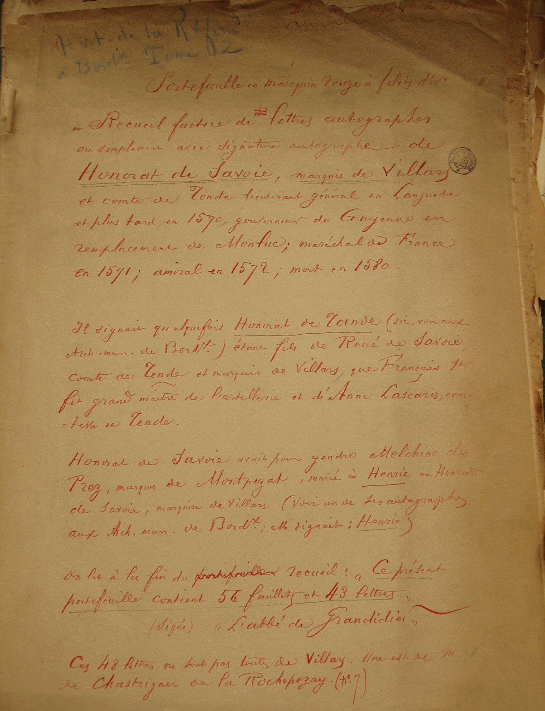 Honorat de Savoie avait pour gendre Melchior des Prez, marquis de Montpezat, marié à Henrie ou Henriette de Savoie, marquise de Villars (voir un de ses autographes aux arch. Mun. De Bordeaux ; elle signait : Henrie)