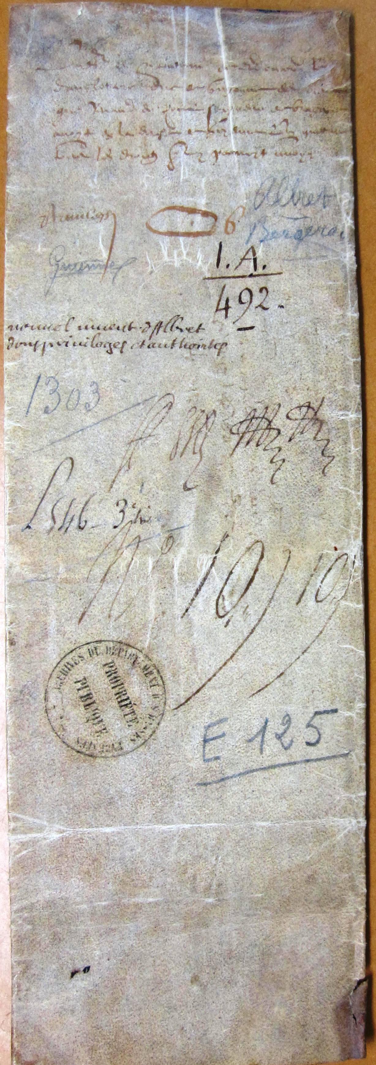 Vidimus de plusieurs chartes en faveur des seigneurs de Bergerac, entr’autres d’une de 1279, par laquelle Edouard, roi d’Angleterre, donne à Marguerite de Turenne dame de Bergerac et de Gensac le droit d’herbage qu’il avoit dans toute la terre de Bayanès (1303).
