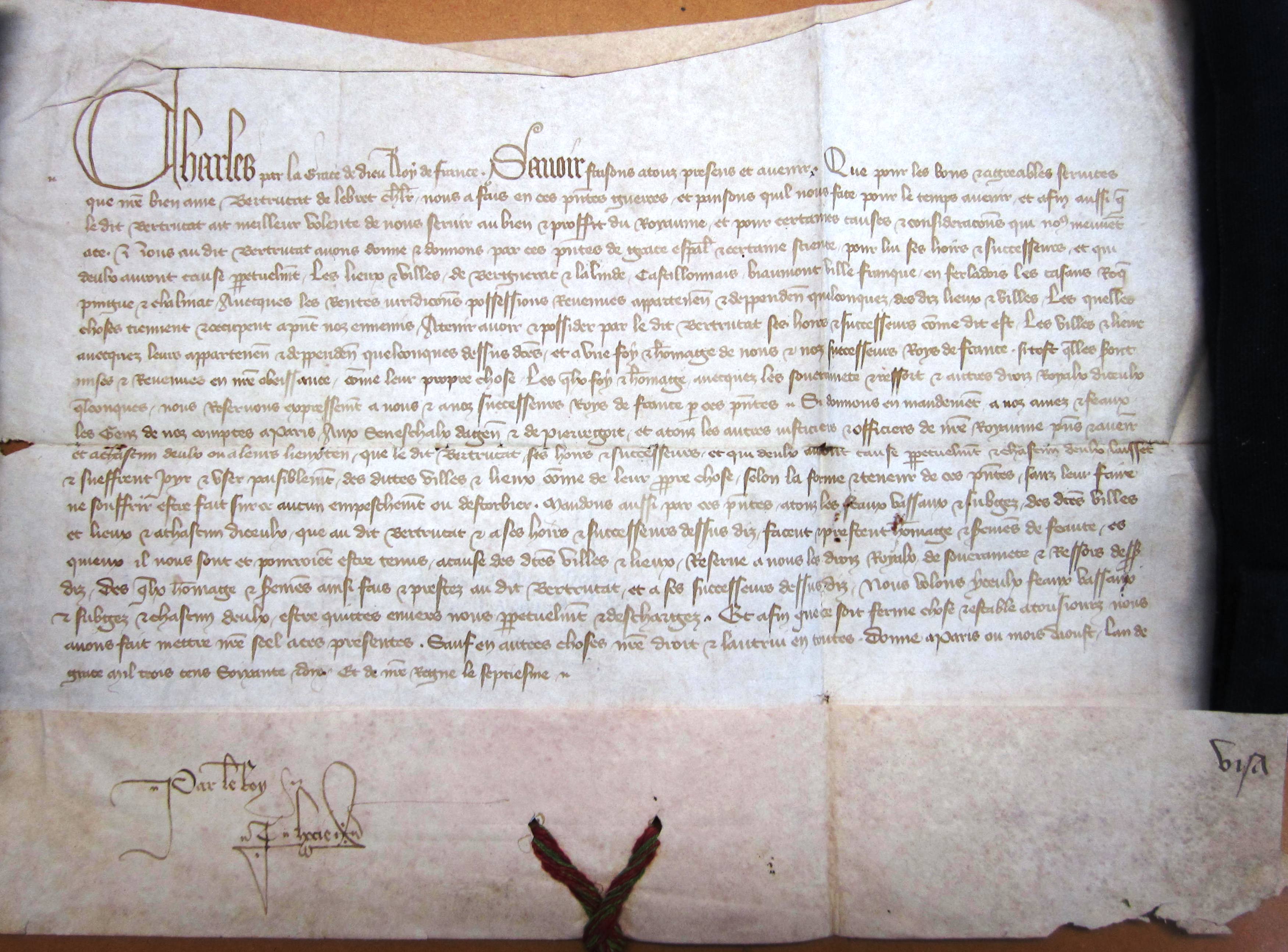 Charles V donne à Bertrucat d'Albret les seigneuries de Bergerac, La Linde, Castillonnès, Beaumont, Villefranque, etc. (1370).