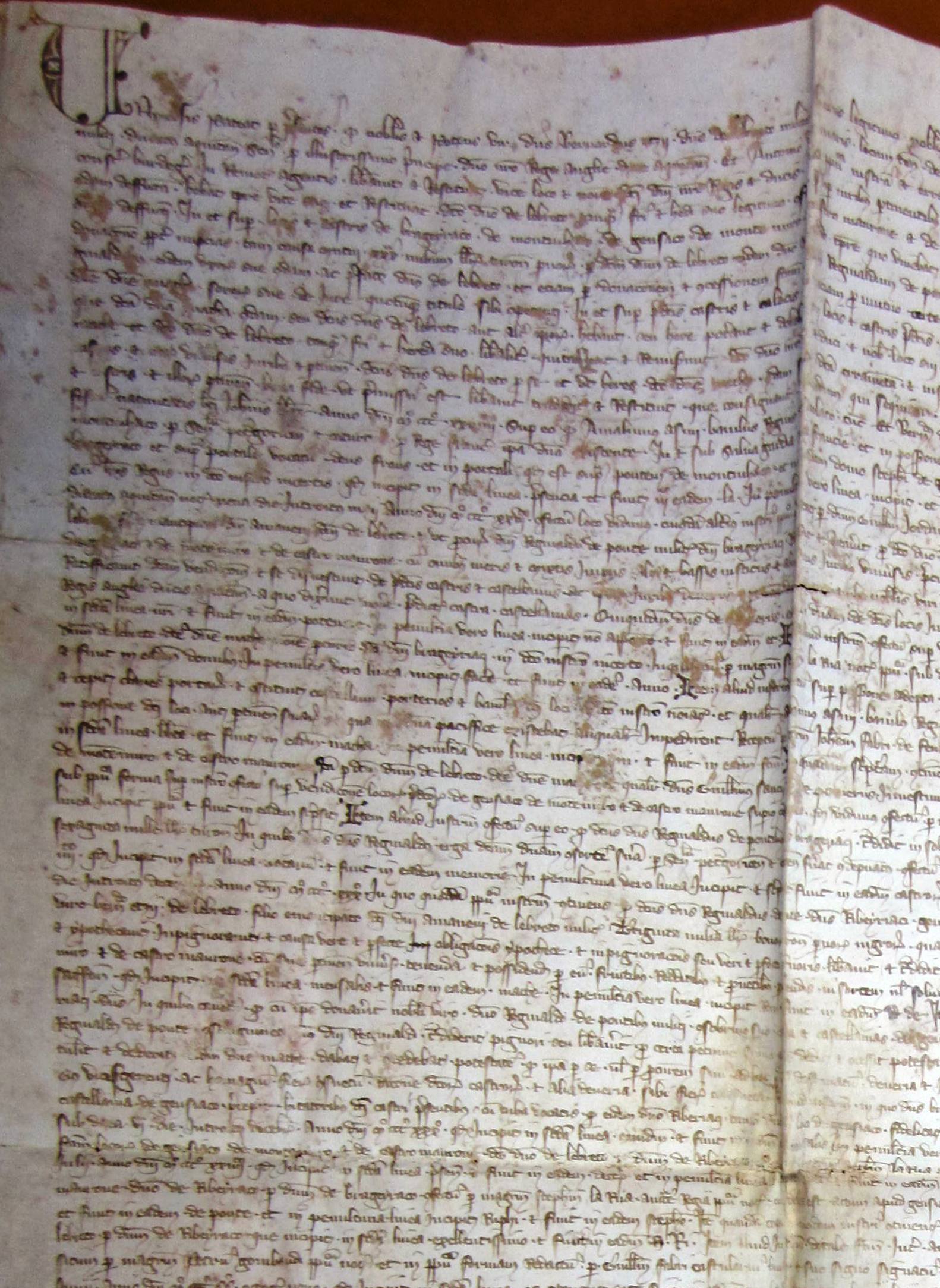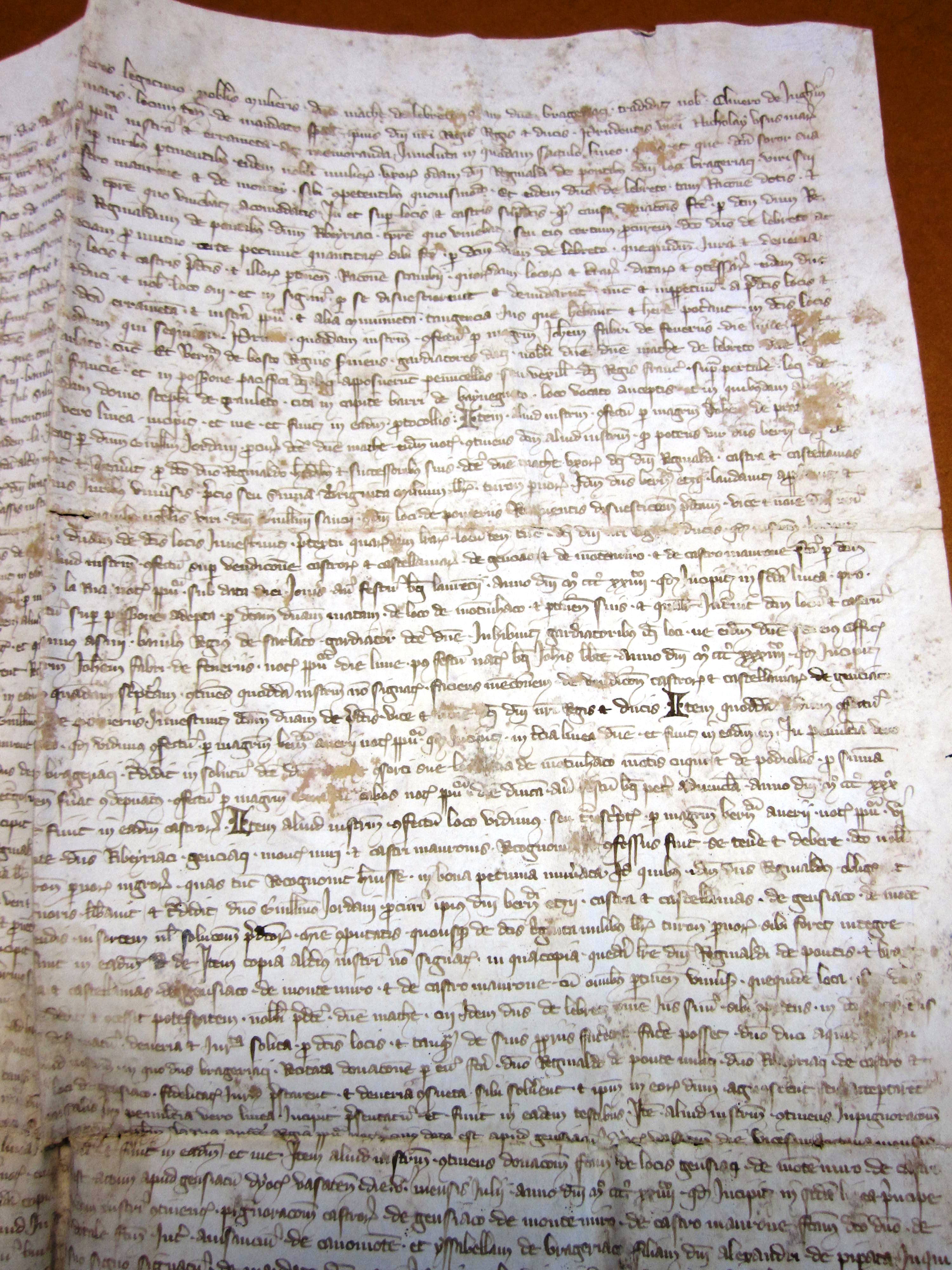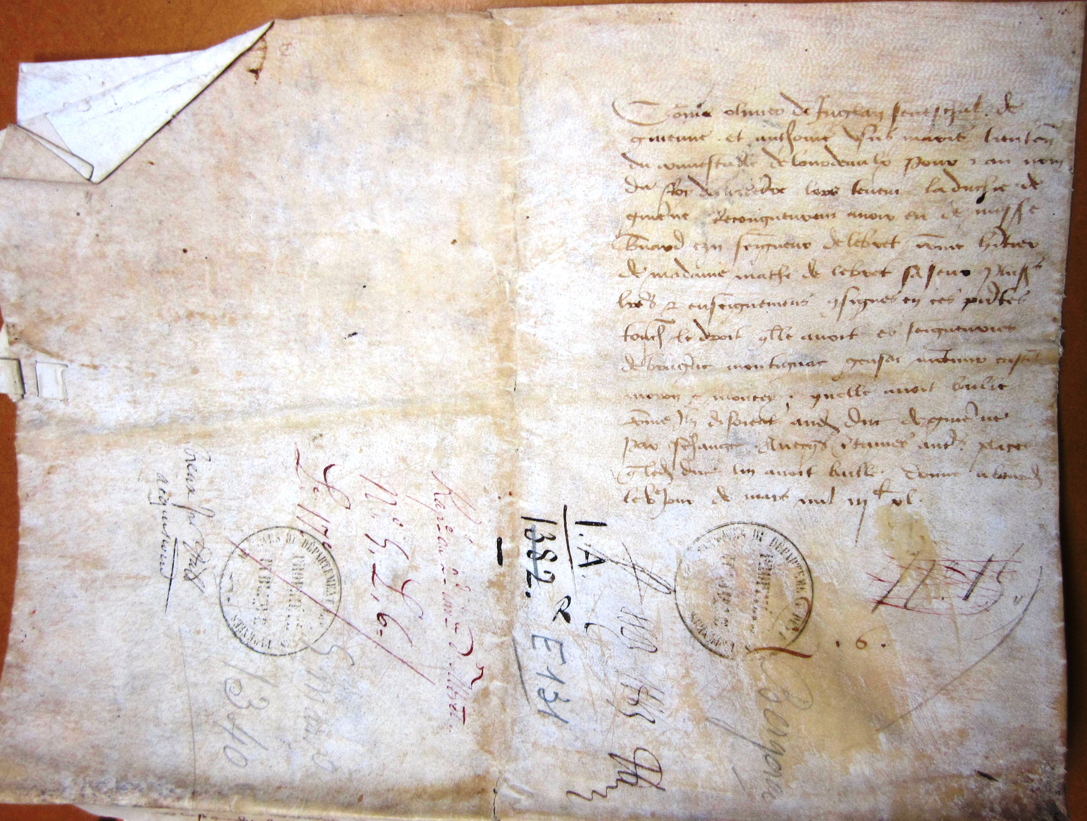 Olivier de Ingham, sénéchal d'Aquitaine, et Antoine de Ususmaris, lieutenant du connétable de Bordeaux, reconnaissent avoir reçu de Bernard-Ezi II, sire d'Albret, diverses chartes relatives à la seigneurie de Bergerac (1340).