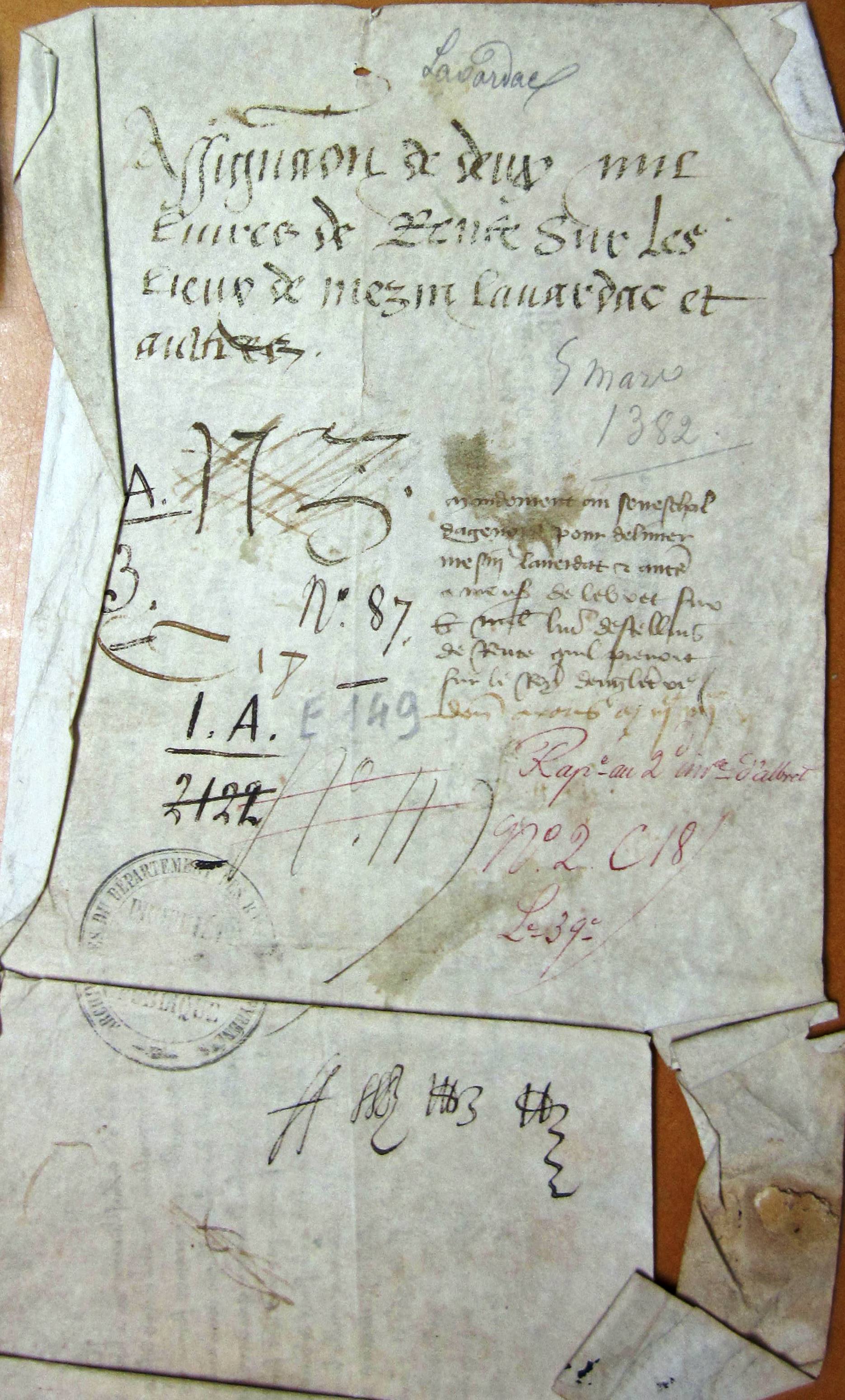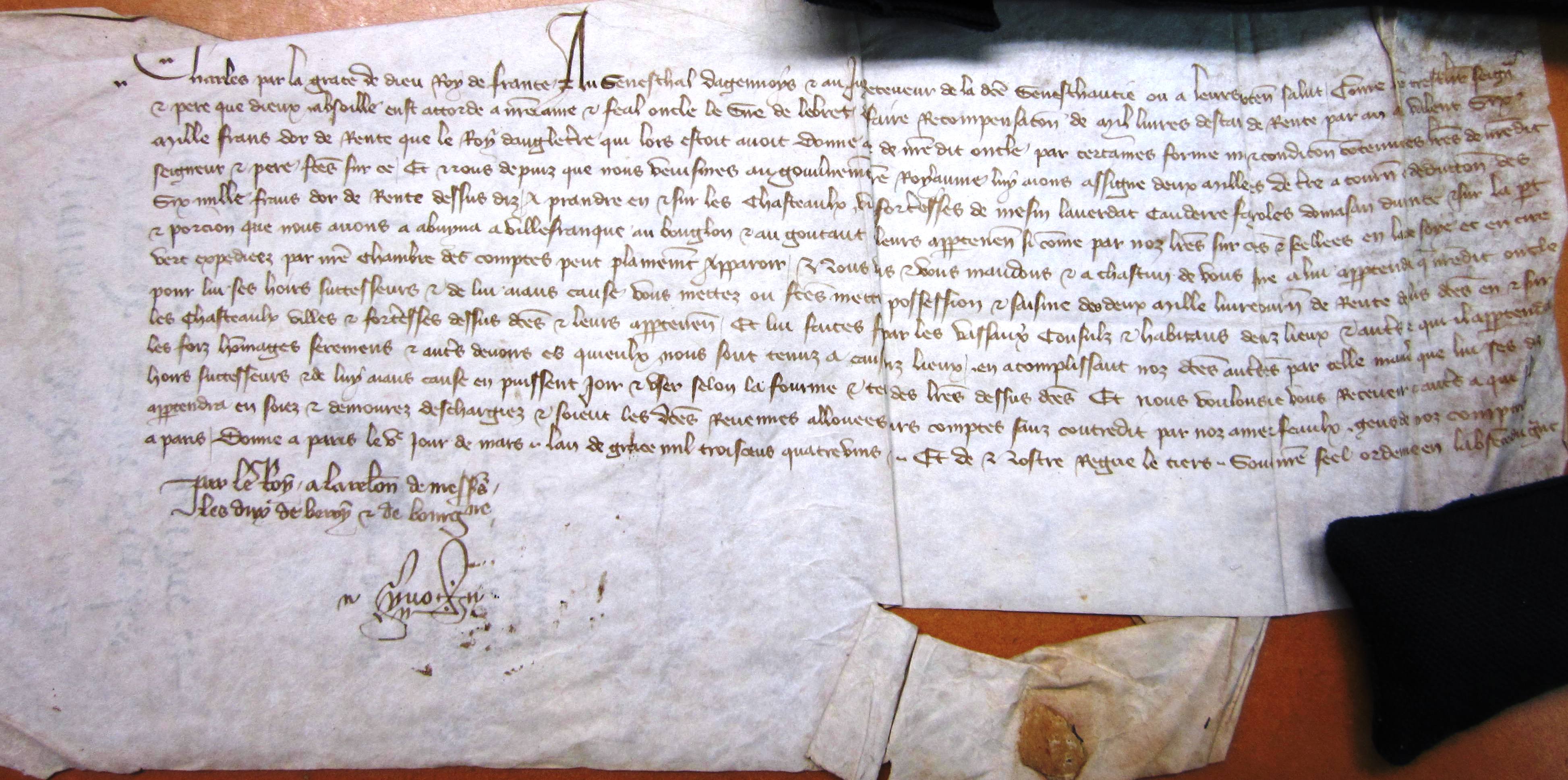 Charles V assigne à Arnaud-Amanieu, sire d'Albret. 2.000 livres de rente sur les seigneuries de Cauderoue, Lavardac, Mézin, Durance, Fougueroles, Viane et Villefranque (1383)