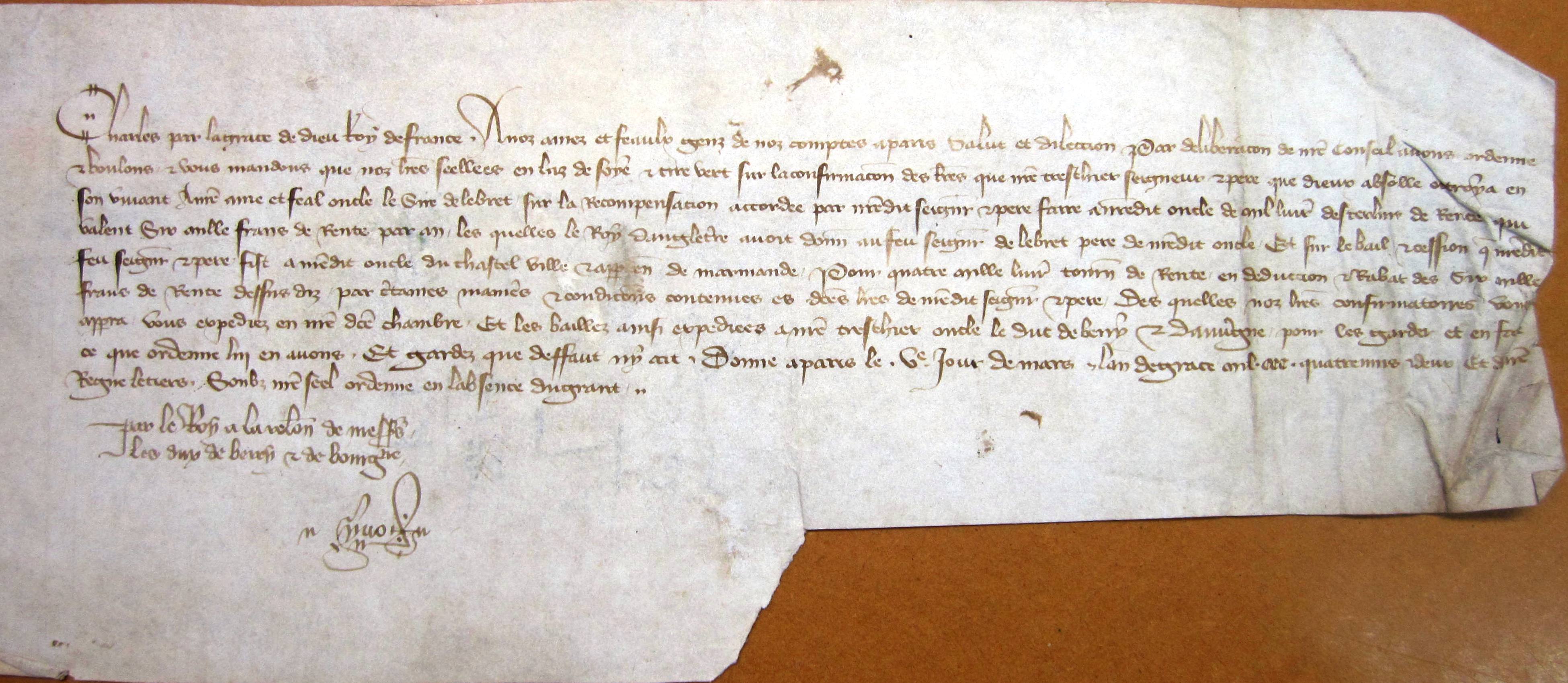 Charles V assigne à Arnaud-Amanieu, sire d'Albret. 2.000 livres de rente sur les seigneuries de Cauderoue, Lavardac, Mézin, Durance, Fougueroles, Viane et Villefranque (1383)