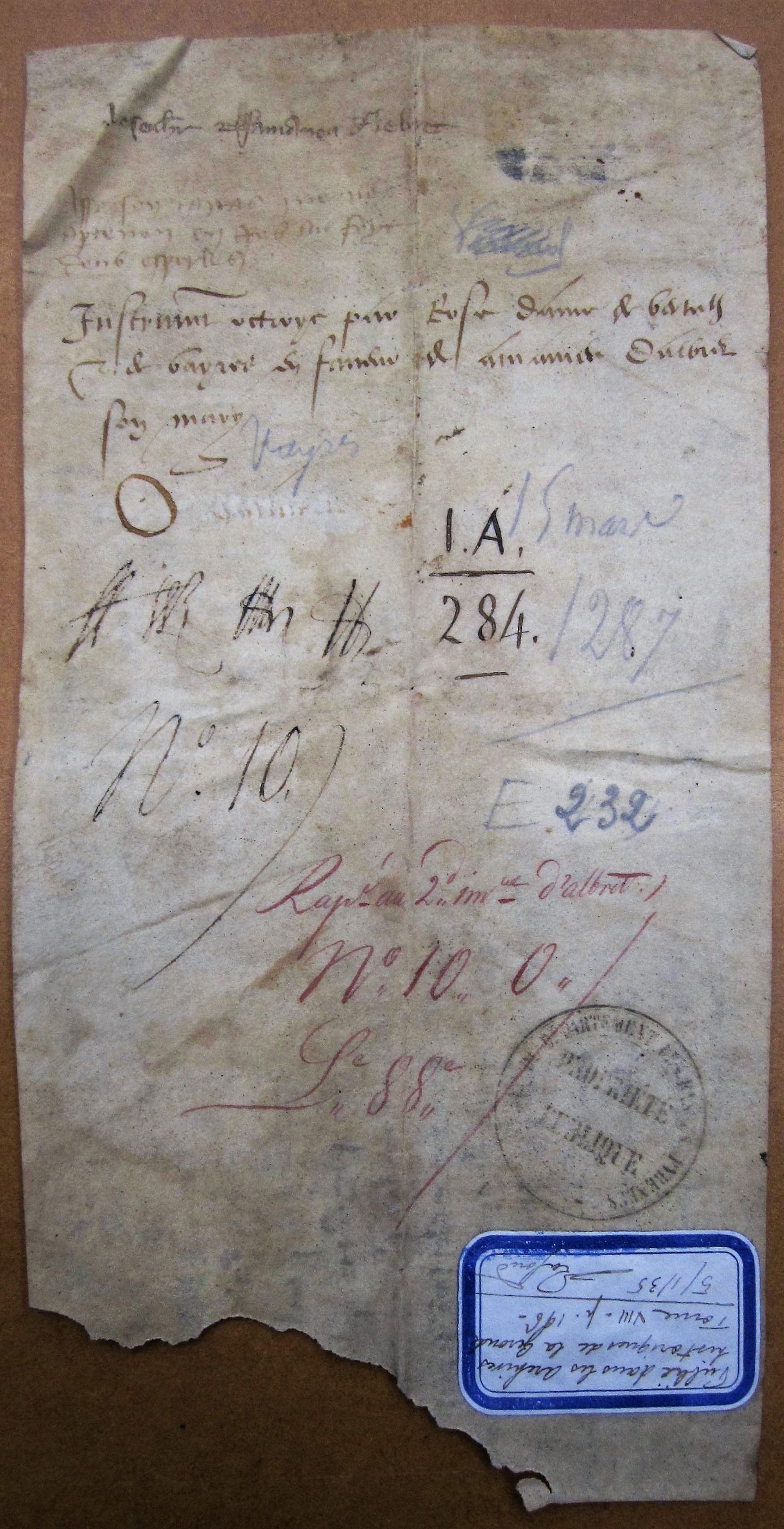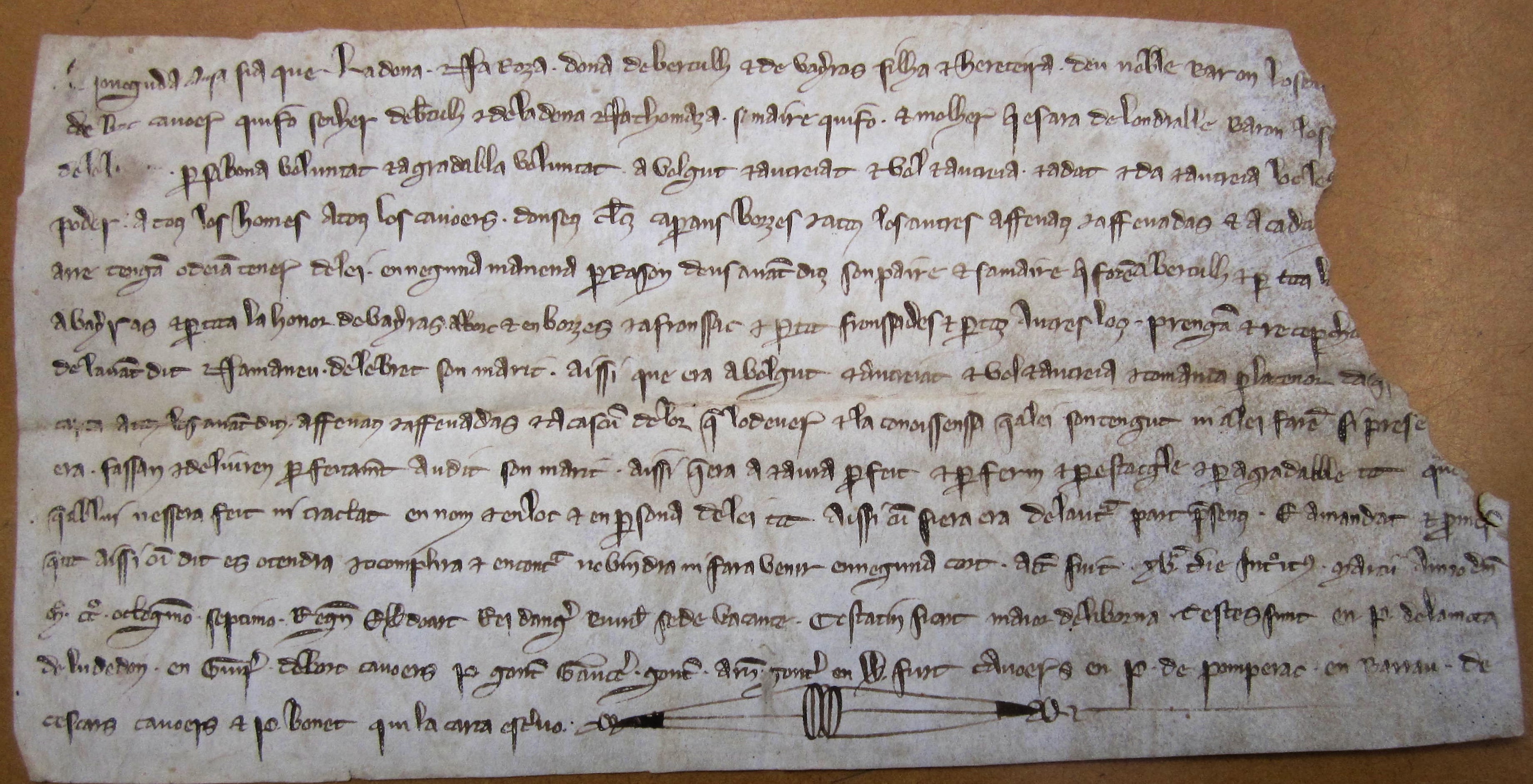 Coneguda causa sia que la dona na Roza, dona de Bertulh e de Vayras, filha e hereteira deu noble baron lo senhor Giraud de Borc, cavoer, qui fo senher de Bertulh e de la dona na Thomaza, sa maire, qui fo, e molher qui es ara de l'oudralle baron lo senhor de Lebret, per sa bona e agradabla voluntat a volgut e autreiat ....... poder a totz los homes, a totz los cavoers, donsetz, clercz, caperans, borzes e a totz los autres affeuatz e affeuadas ....... a Bertulh e per totz ........ a Vayras, e per totz la honor de Vayras, a Borc e en Borzes, e a Fronssac, e per tot Fronssades, e per totz autres locz, prengan e recepch(an) de l'avantdit n'Amaneu de Lebret, son marit, aissi que era a bolgut e autreiat, e bol e autreia, e comenca per la tenor d'aq(ueste) carta a totz los avanditz affeuatz e affeuadas, e a cascun de lor, que lo deuer e la conoissenssa que a lei son tengut, ni a lei faren, si present era, fassan e deliuren perfertament audit son marit aissi que era a e aura per feit e per ferm...... tot aissi cum si era de l'autra part presentz, e a mandat e promes quant aissi cum dit es o tendra, e acomplira, encontra ne vindra, ni fara venir en neguna cort. Actum fuit XVa, die introitus marcii, anno domini M° CC°. octogesimo septimo, regnant Eudoart, rei d'Anglaterra, Burdegalensi sede vacante, Ceslatin Sicart, maior de Liborna. Testes sunt en P. de Lamota de Ludedon, en Guiraut de Borc, cavoers, P. Gontaut, Gaucen Gontaut, Arnaud Gontaut, en W. Furt, cavoers, en P. de Pomperac, en Barrau de Cescars, cavoers, e P. Bonet, qui la carta escriuo.